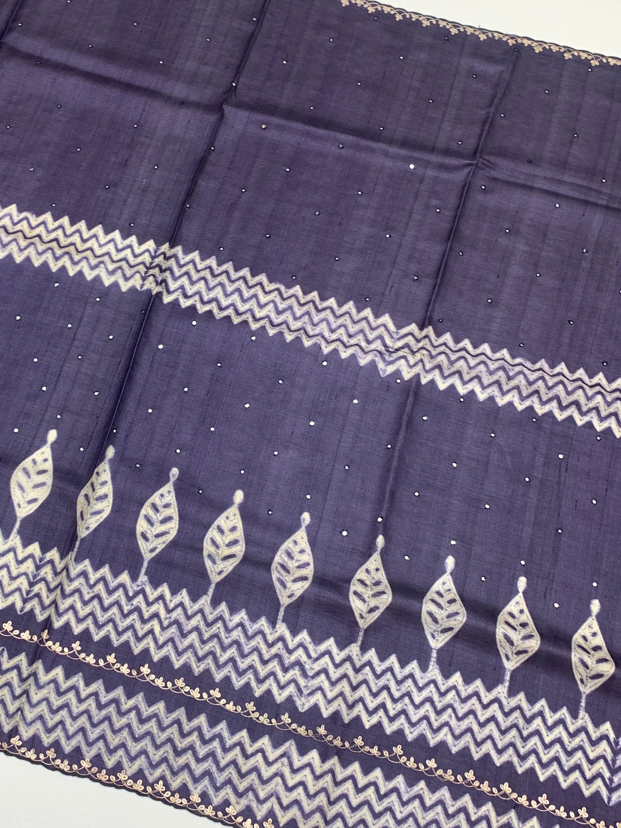 The Print: The saree features a striking contrast with a white chevron (zigzag) geometric print running across the border and pallu area. Rising from the geometric base are stylized leaf motifs that add an organic touch to the modern lines.
