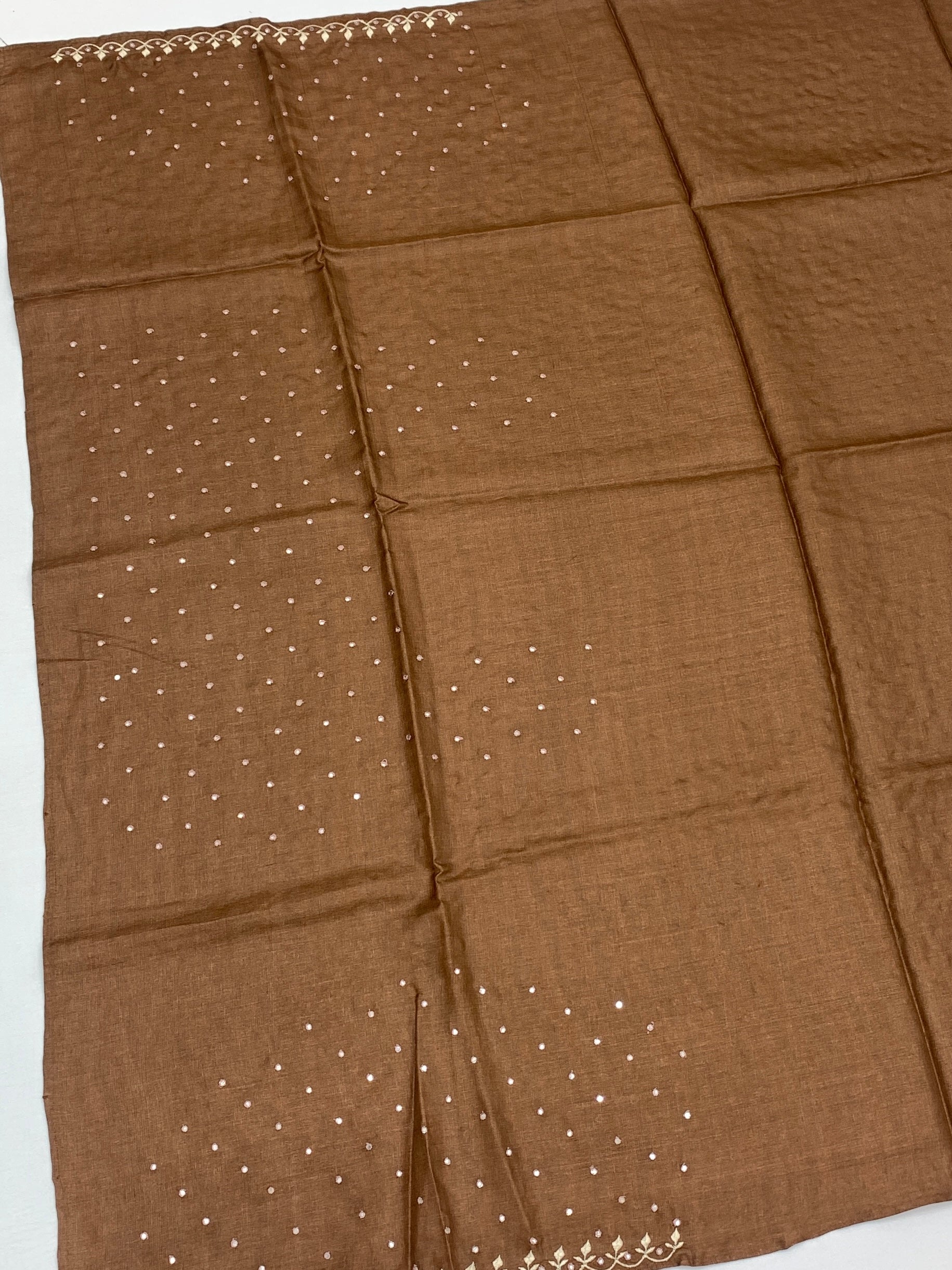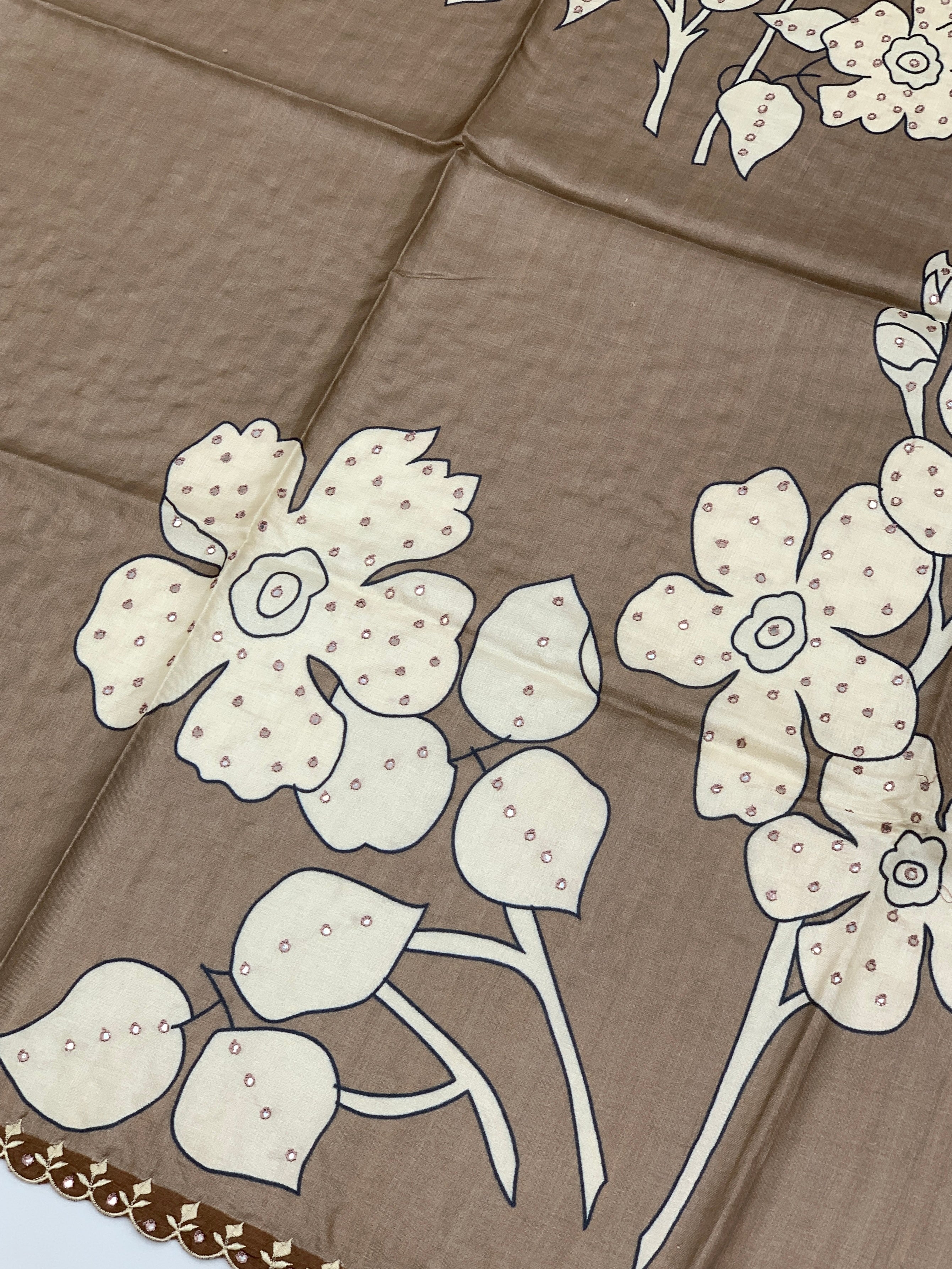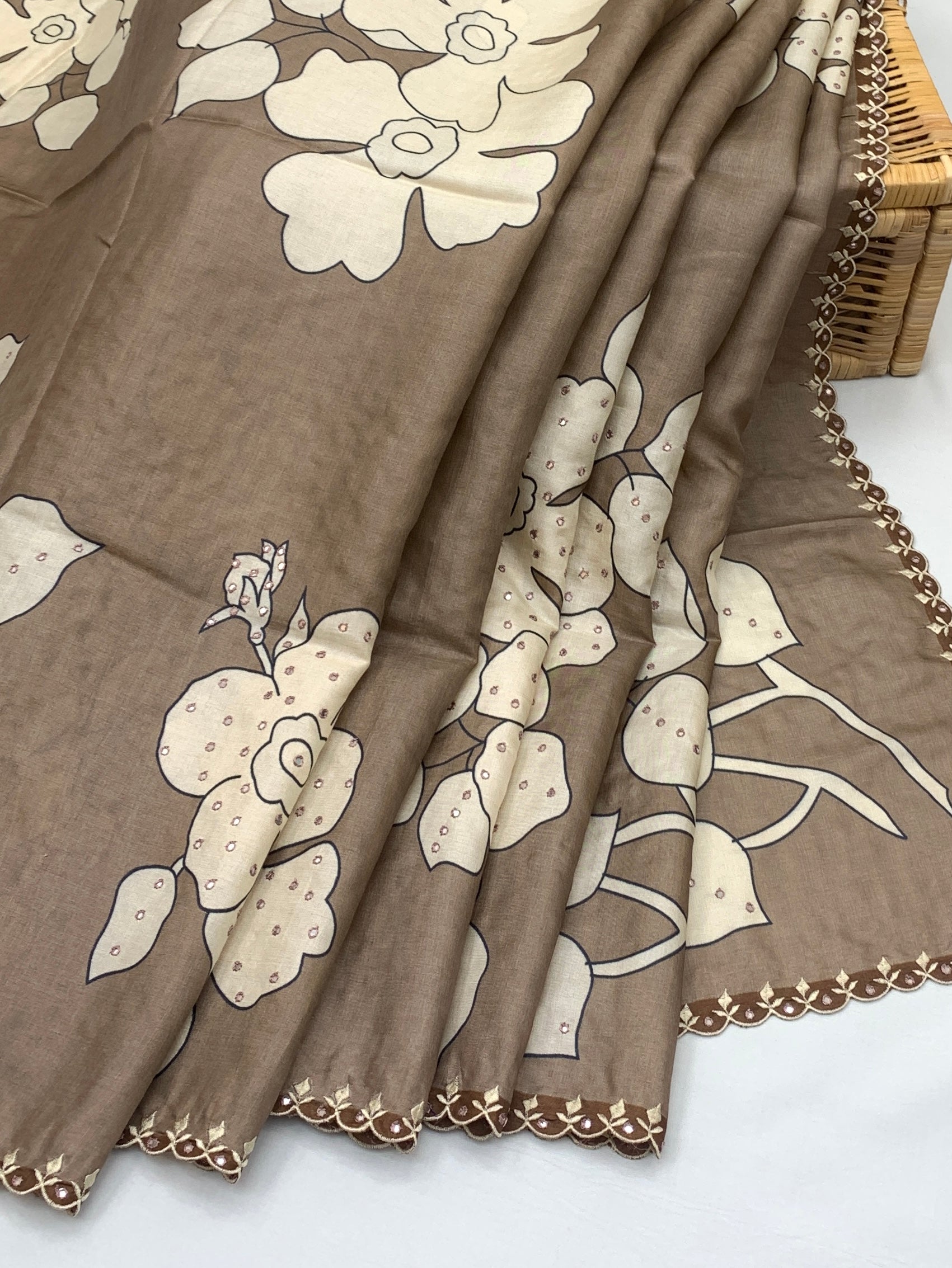 Border: A distinct scalloped cutwork border finished with delicate embroidery and mirror-like detailing.
