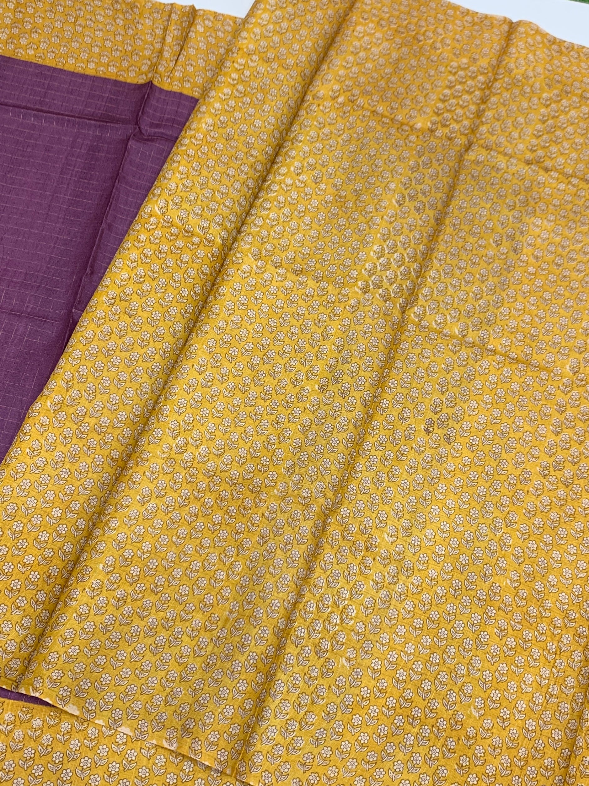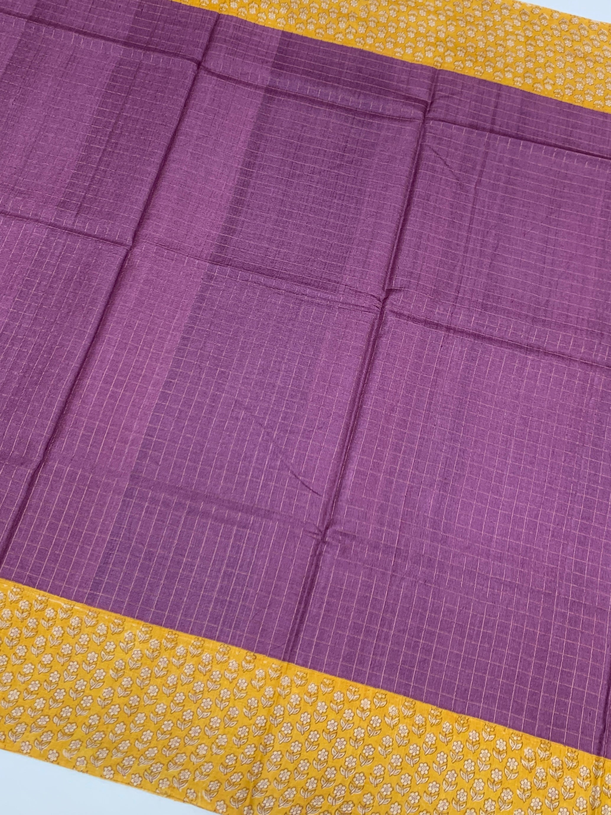 purple tussore saree, where traditional craftsmanship meets modern flair. The body is defined by a rhythmic grid of shimmering gold zari checks, creating a subtle, multidimensional sparkle. A sophisticated contrast-floral printed border flows seamlessly into a matching pallu, Paired with a delicate floral-print blouse.