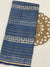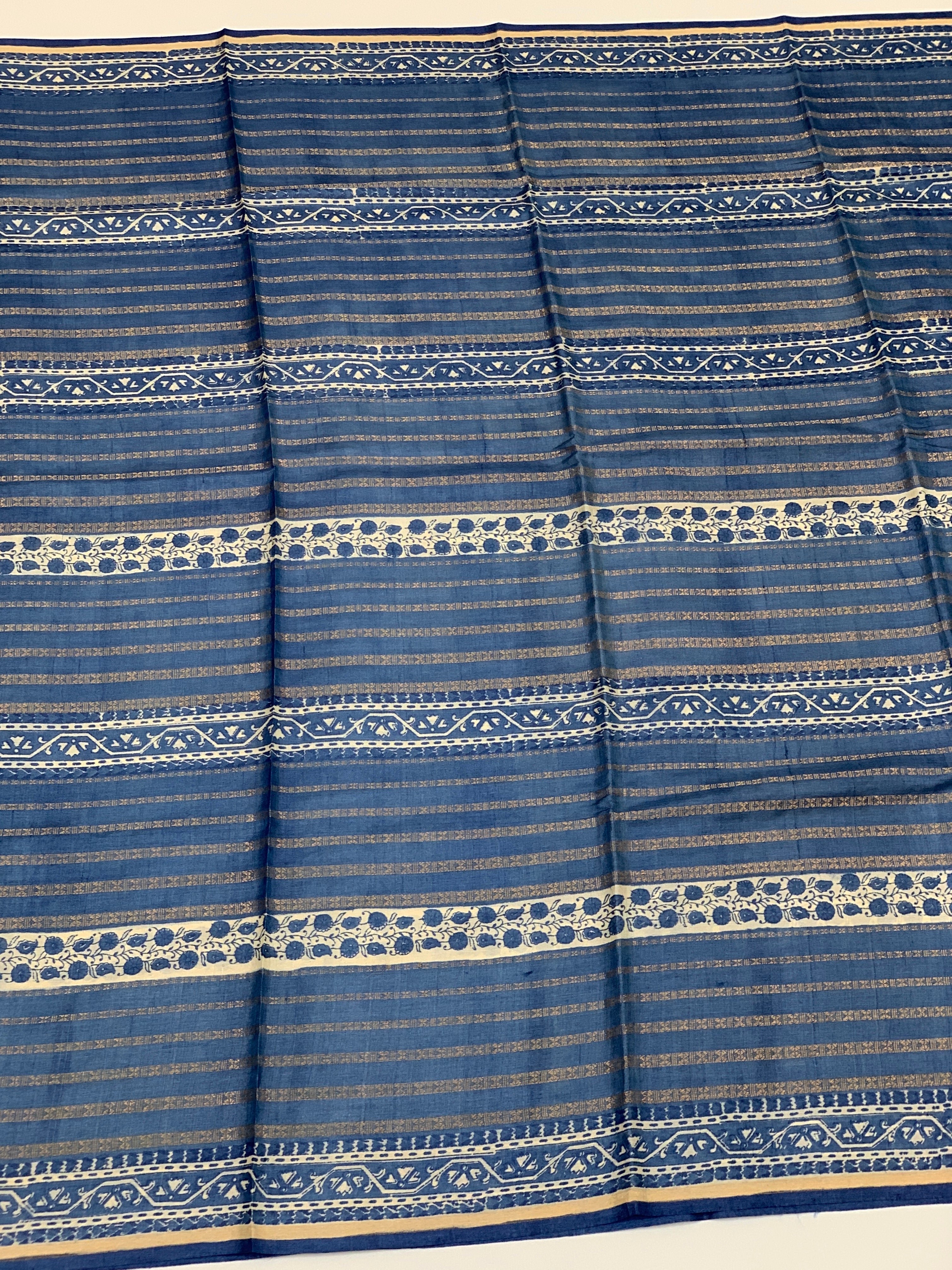 Elevate your ethnic wardrobe with this stunning Tussore silk saree in a rich blue hue. The body showcases intricate gold zari stripes paired with delicate floral digital prints, The self-bordered pallu features elegant zari striping that complements the overall aesthetic. The contrasting blouse piece, crafted from zari tissue, adds a refined finishing touch. Perfect for festive occasions and celebrations.