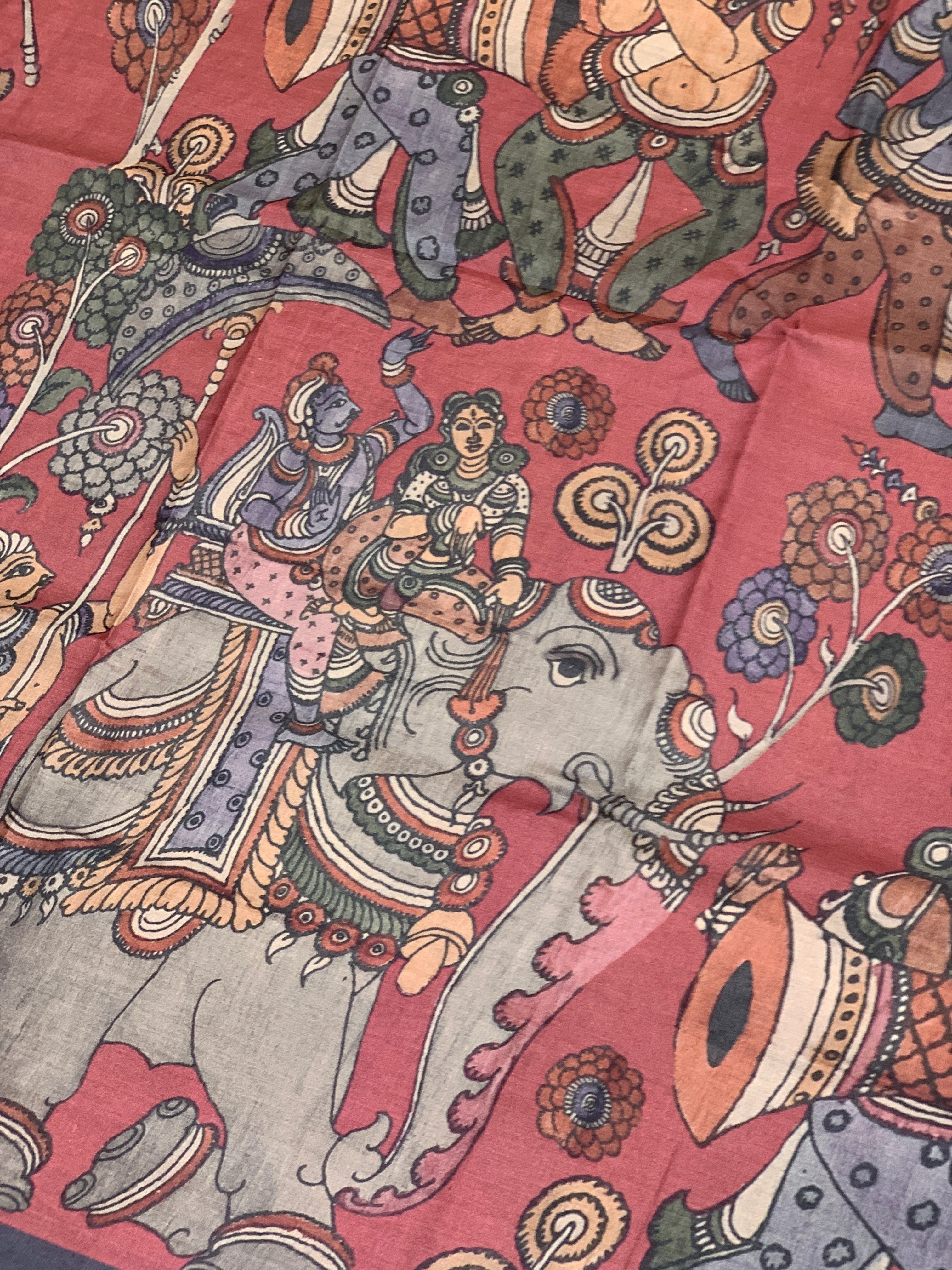 Elevate your ethnic wardrobe with this Printed Tussore Kalamkari Saree, Crafted from premium tussore silk, this saree showcases exquisite kalamkari patterns rendered through advanced digital printing technology, preserving the artistry of this traditional art form. The sophisticated design features a contrast plain lay border that frames the fabric beautifully, while the self-patterned pallu adds cohesive elegance. The accompanying blouse is adorned with delicate floral netted appliqué work, creating a refined finishing touch.