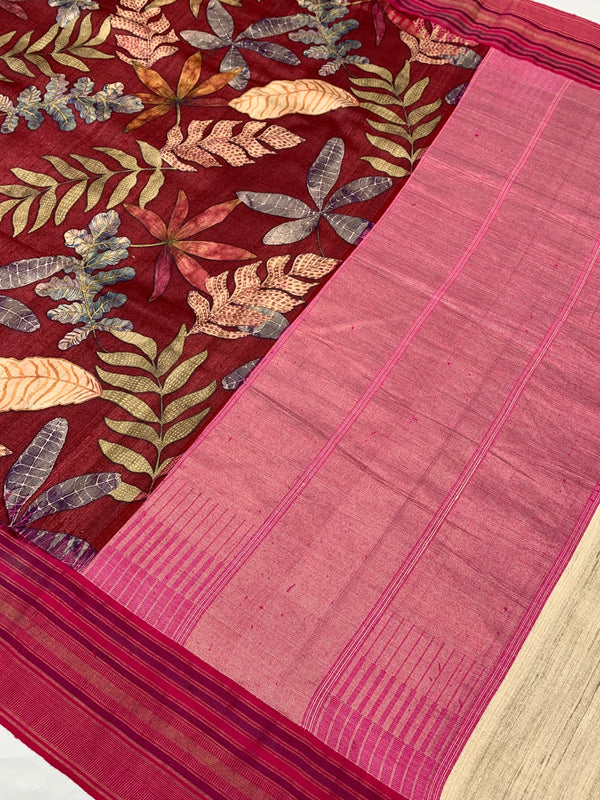 This deep-maroon tussore saree beautifully blends timeless tradition with contemporary style. Featuring a vibrant digital multi-colored leaf print, it brings lively elegance to your wardrobe. The classic temple border enhances its rich appeal, while the plain zari pallu offers a refined and subtle finish. Paired with a contrasting plain blouse adorned with a matching border.