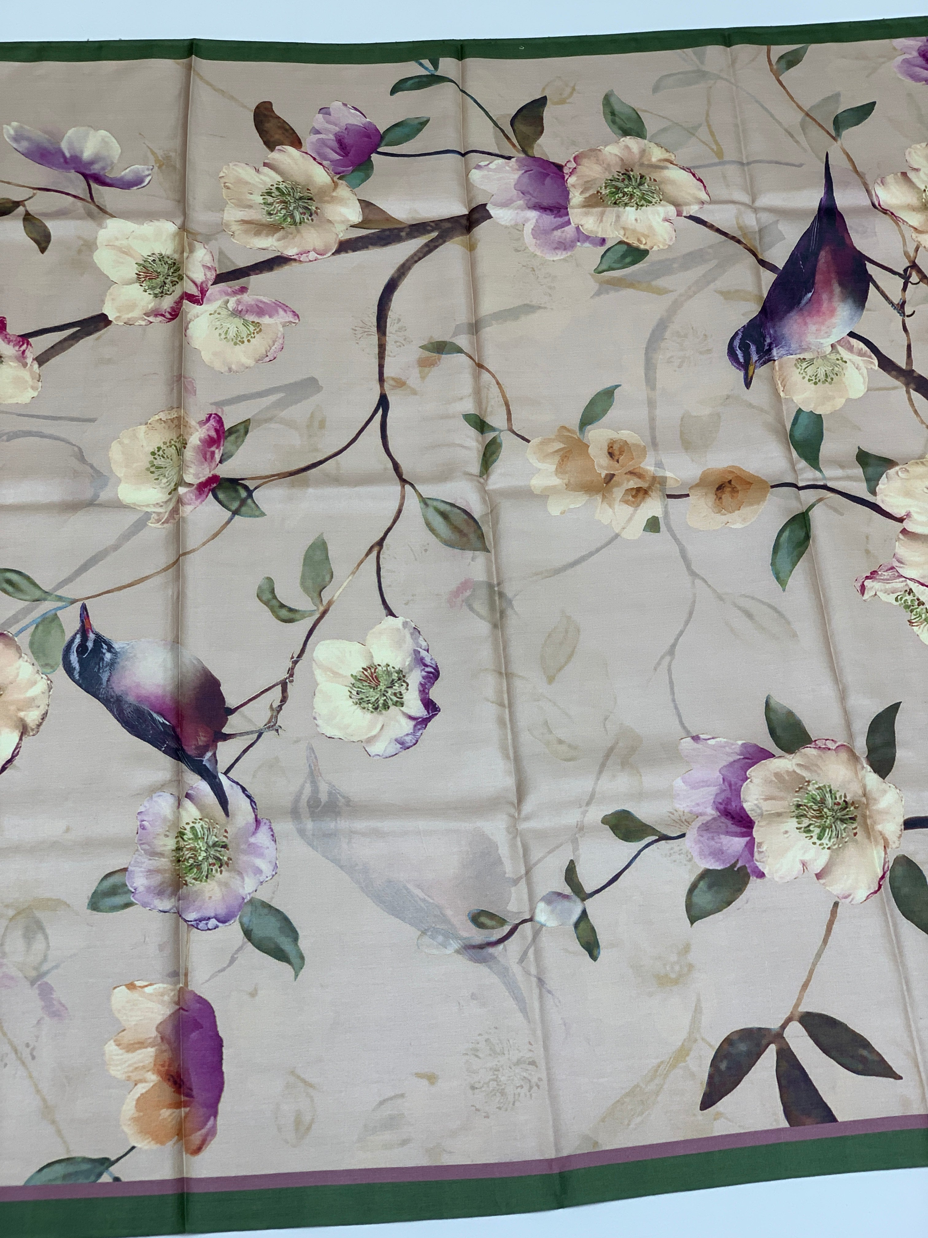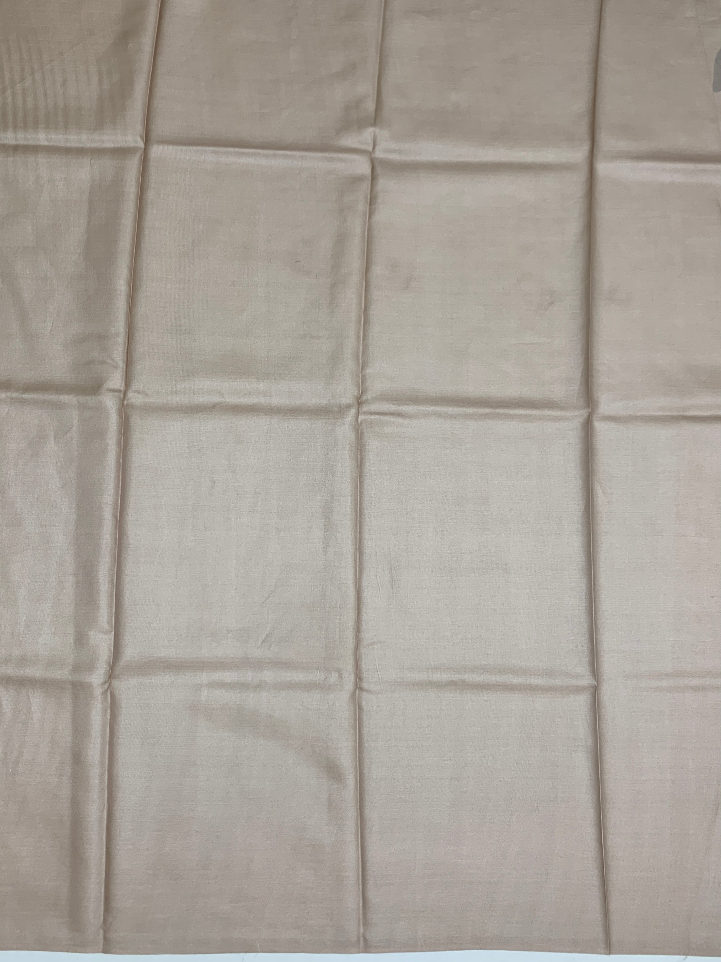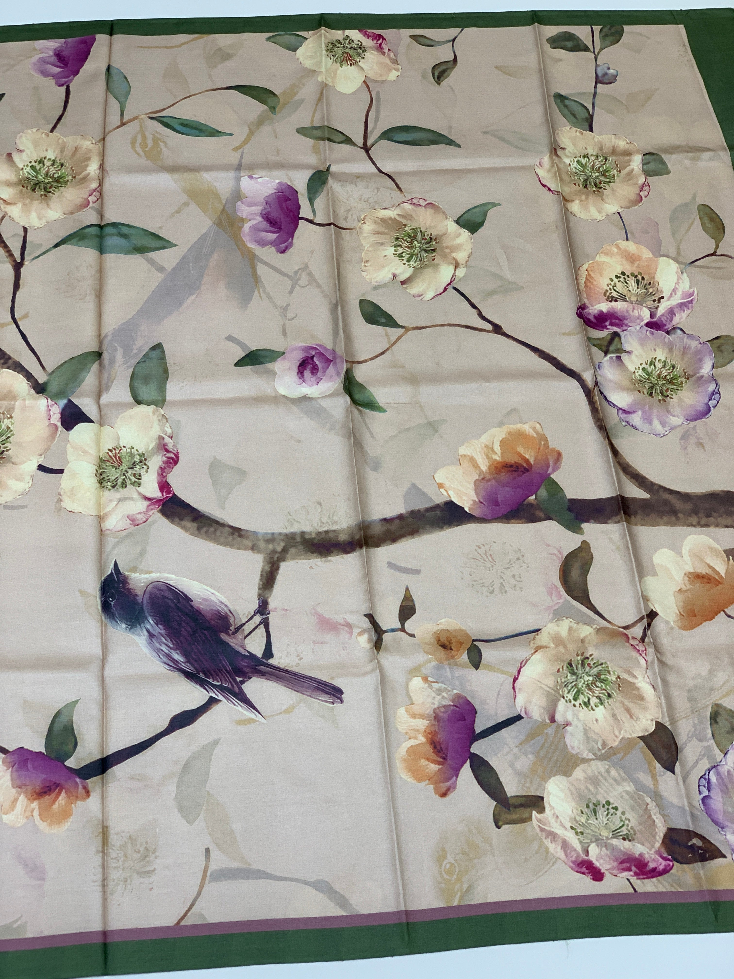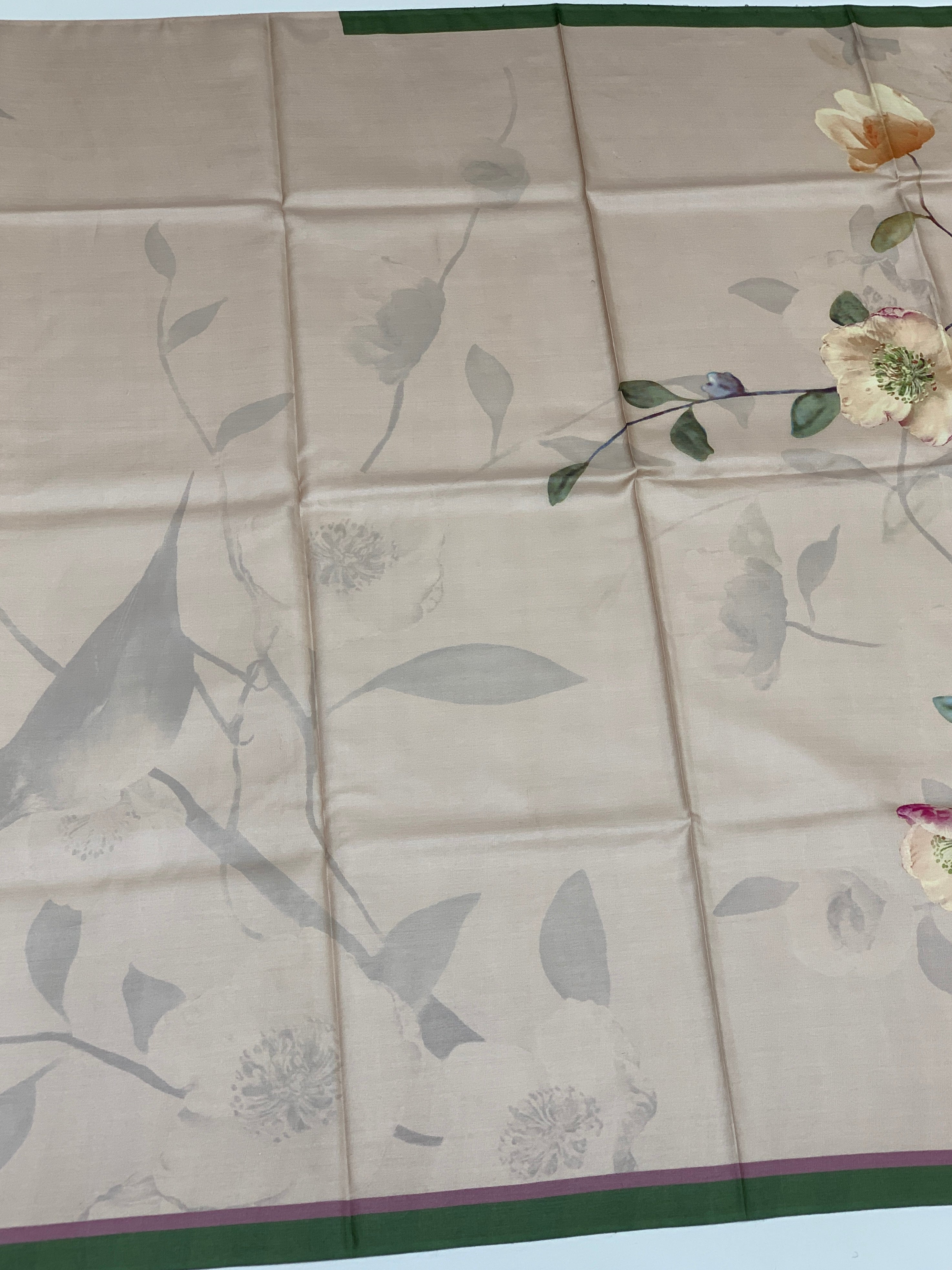 Elegant tussore saree featuring an all-over floral and bird motif design in soft pastel-peach tones. The saree showcases a contrasting plain border paired with a decorative floral pallu, while the coordinating blouse comes in a matching plain weave for a refined finish.