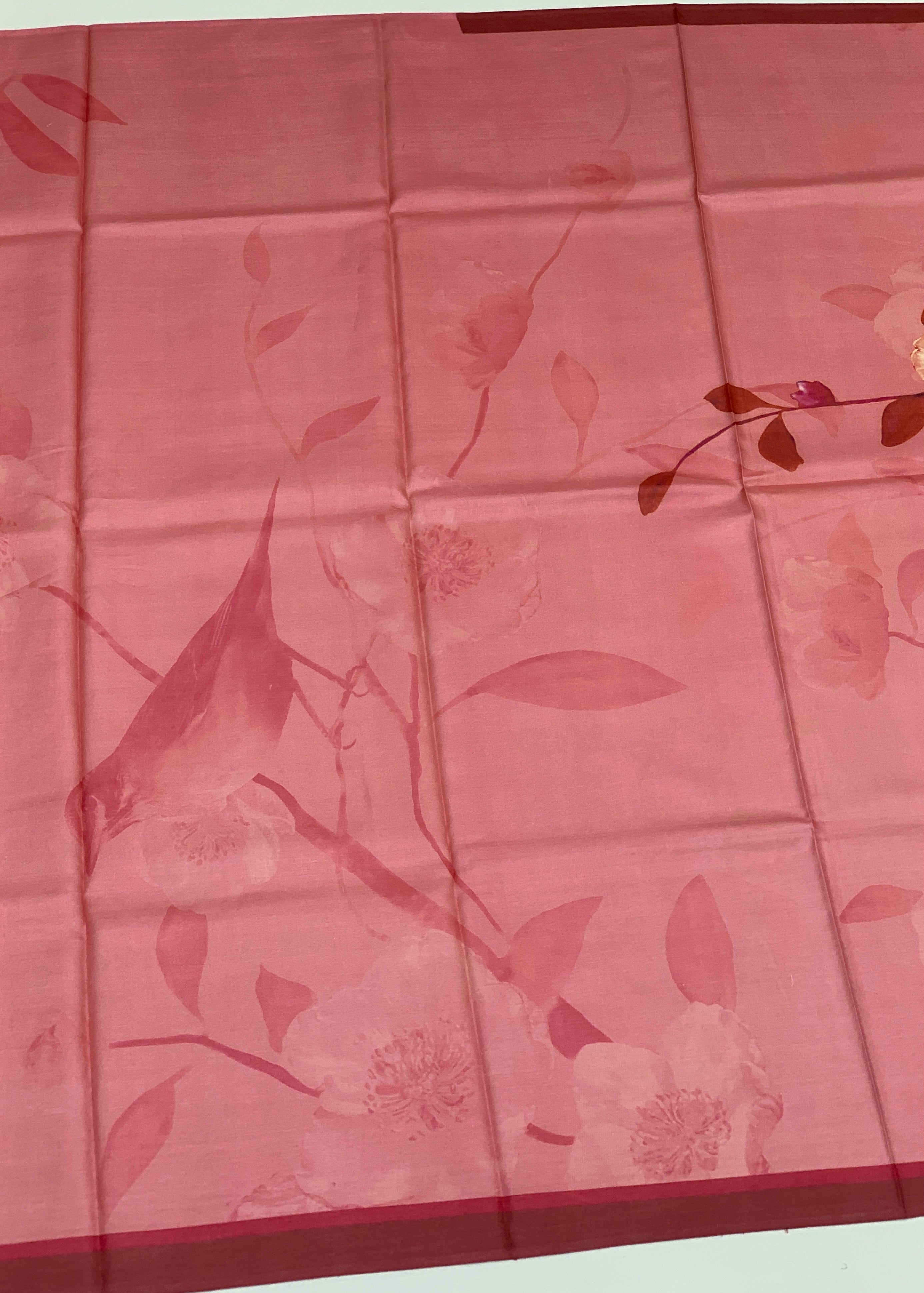 Elegant tussore saree featuring an all-over floral and bird motif design in soft pastel-pink tones. The saree showcases a contrasting plain border paired with a decorative floral pallu, while the coordinating blouse comes in a matching plain weave for a refined finish.