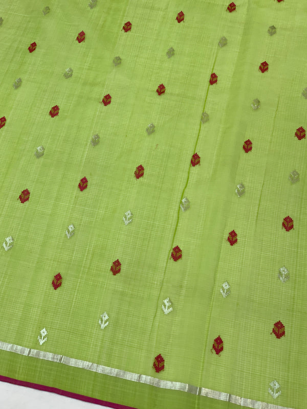 This dark mustard Zari Kota Saree is adorned with elegant silver zari butta and a detailed meenakari pattern throughout. It features a contrasting kaddi border and a rich brocade pallu, enhancing its traditional appeal. Paired with a matching contrast green butta blouse, this saree offers a beautifully coordinated and graceful ensemble for special occasions.
