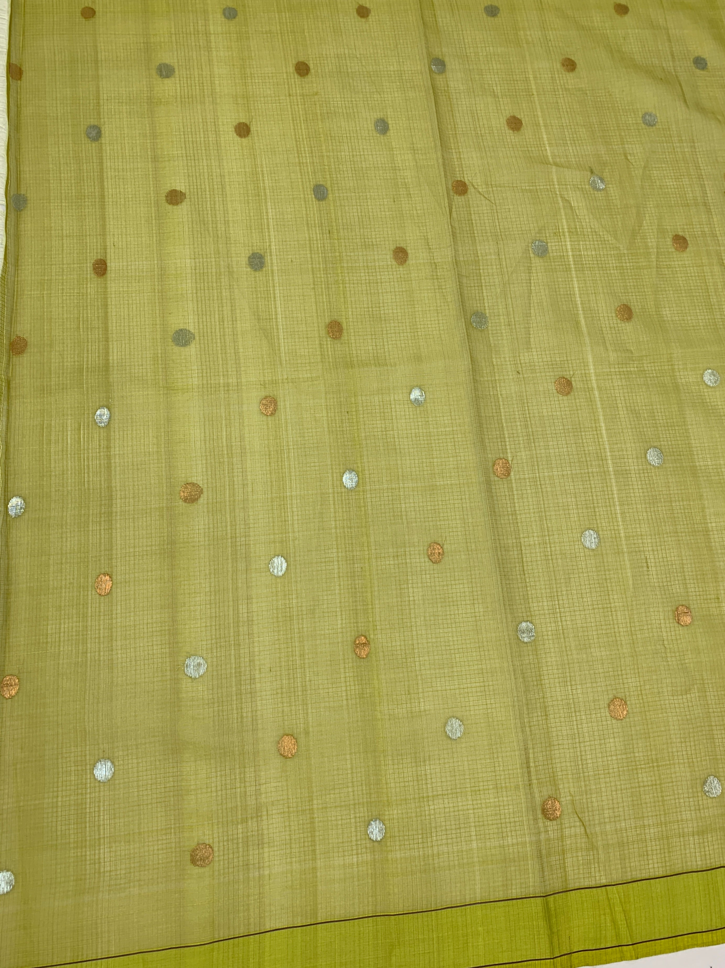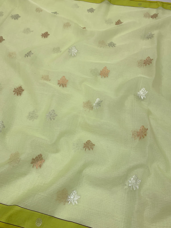 This pista-green Zari Kota Saree highlights intricate silver and gold zari floral buttas, creating an elegant traditional appearance. It is enhanced by a contrasting border adorned with small buttas and a brocade pallu, Paired with a dark lemon-green blouse featuring...