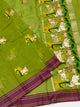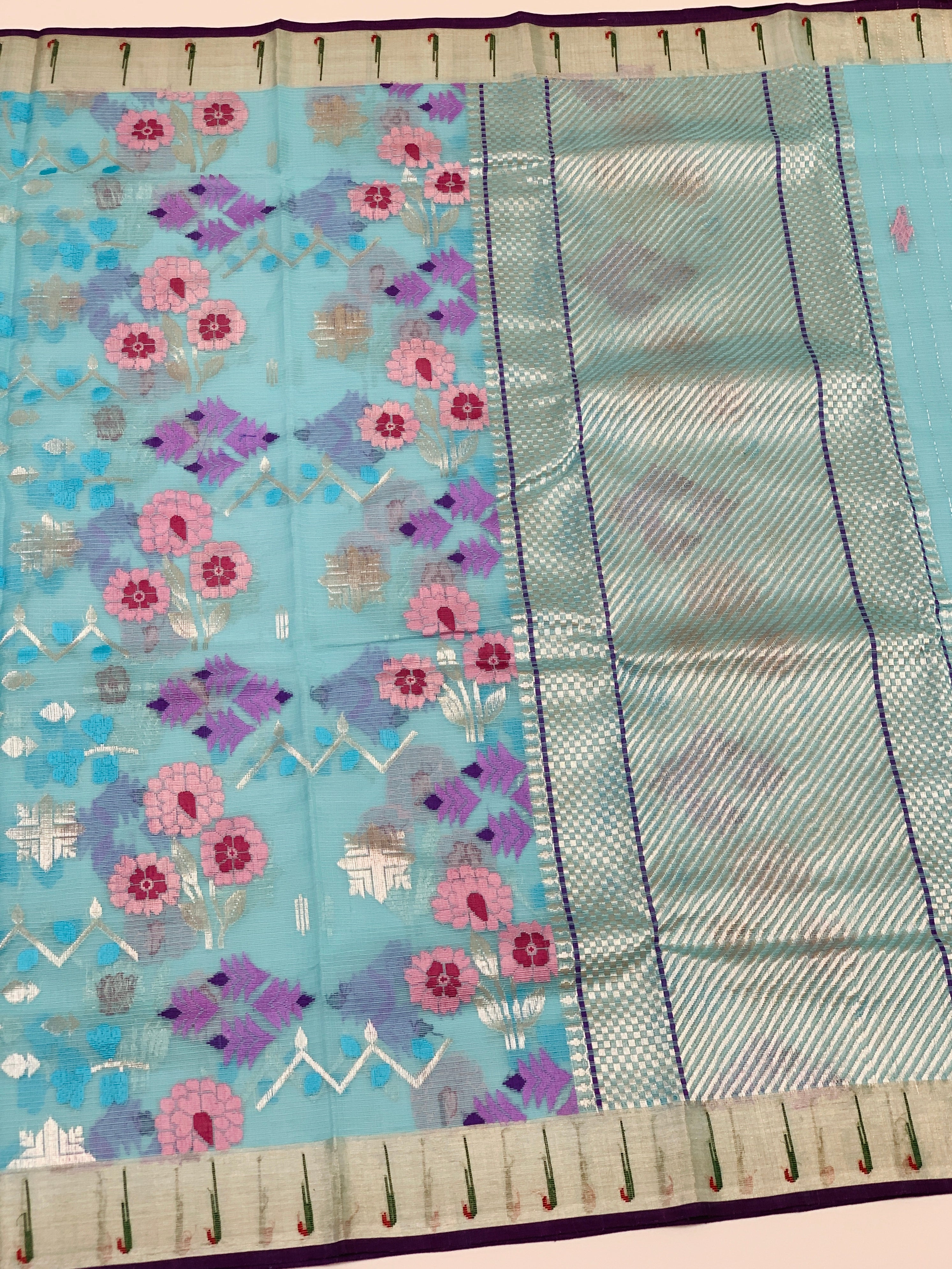 This exquisite light-blue kota saree showcases intricate meenakari weaving throughout, adorned with delicate silver zari florals and geometric motifs. The saree features a refined self-muniya border and an ornate brocade pallu, Paired with a contrasting blouse embellished with floral buttis and complementary border detailing.