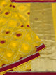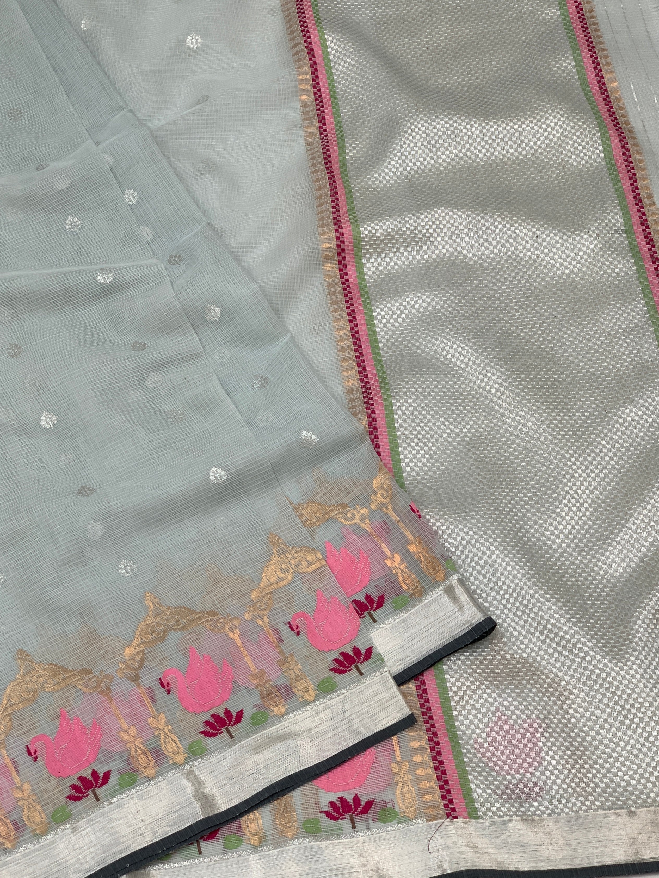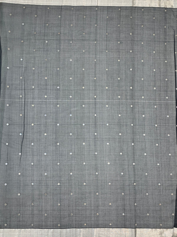 The Zari Kota Saree highlights delicate silver zari butta patterns. It presents a lovely contrast with pink lotus flowers arranged in elegant swan motifs along the border and includes a self brocade pallu in a captivating grey shade. The blouse complements the saree with matching contrasting buttas and border details.