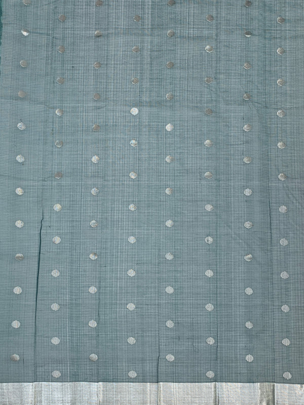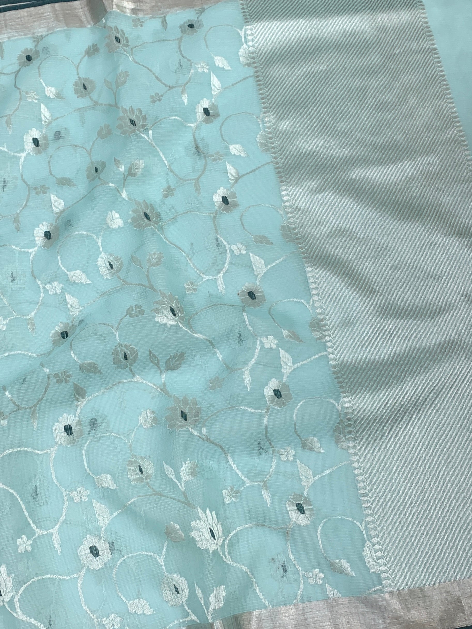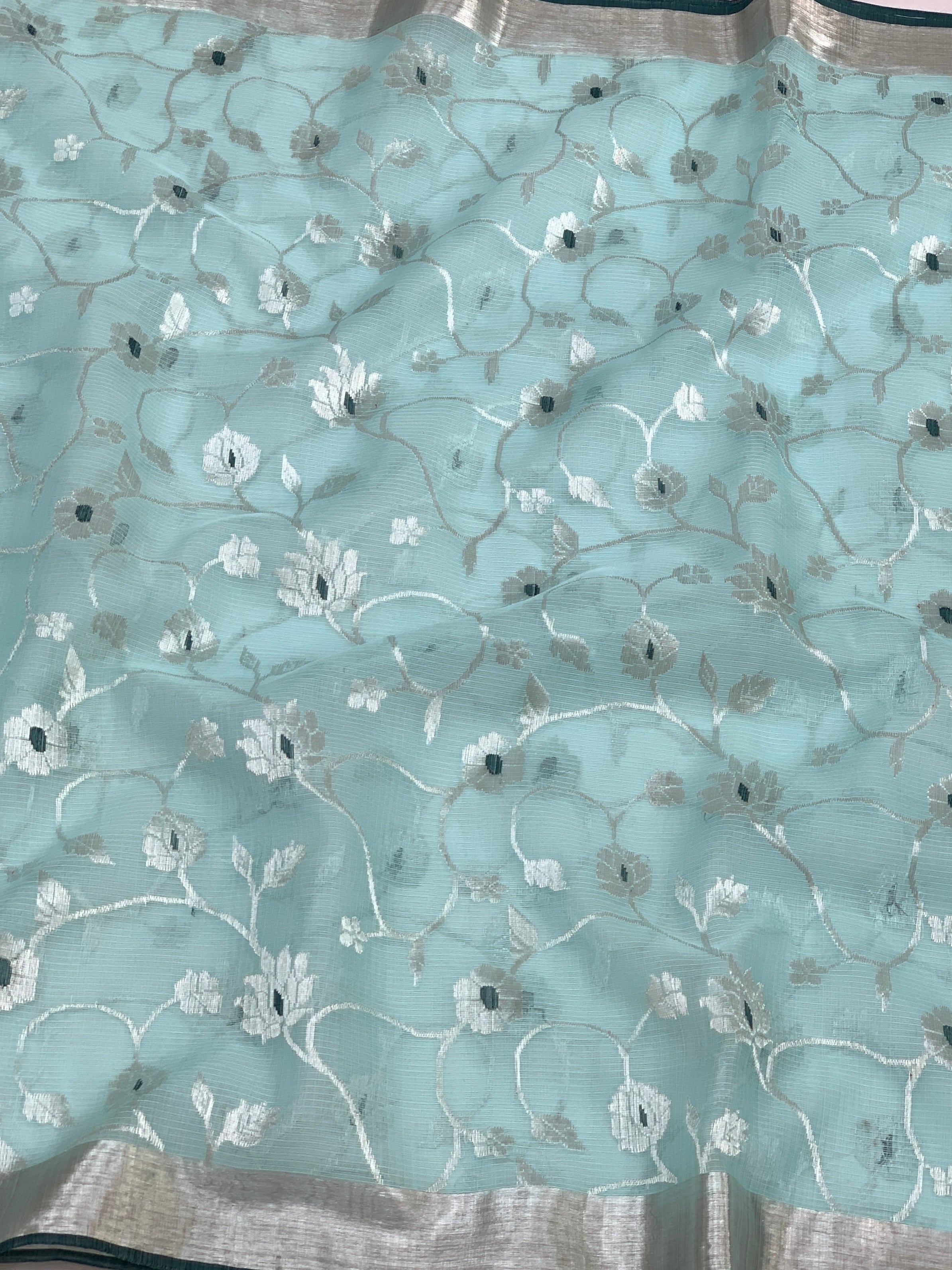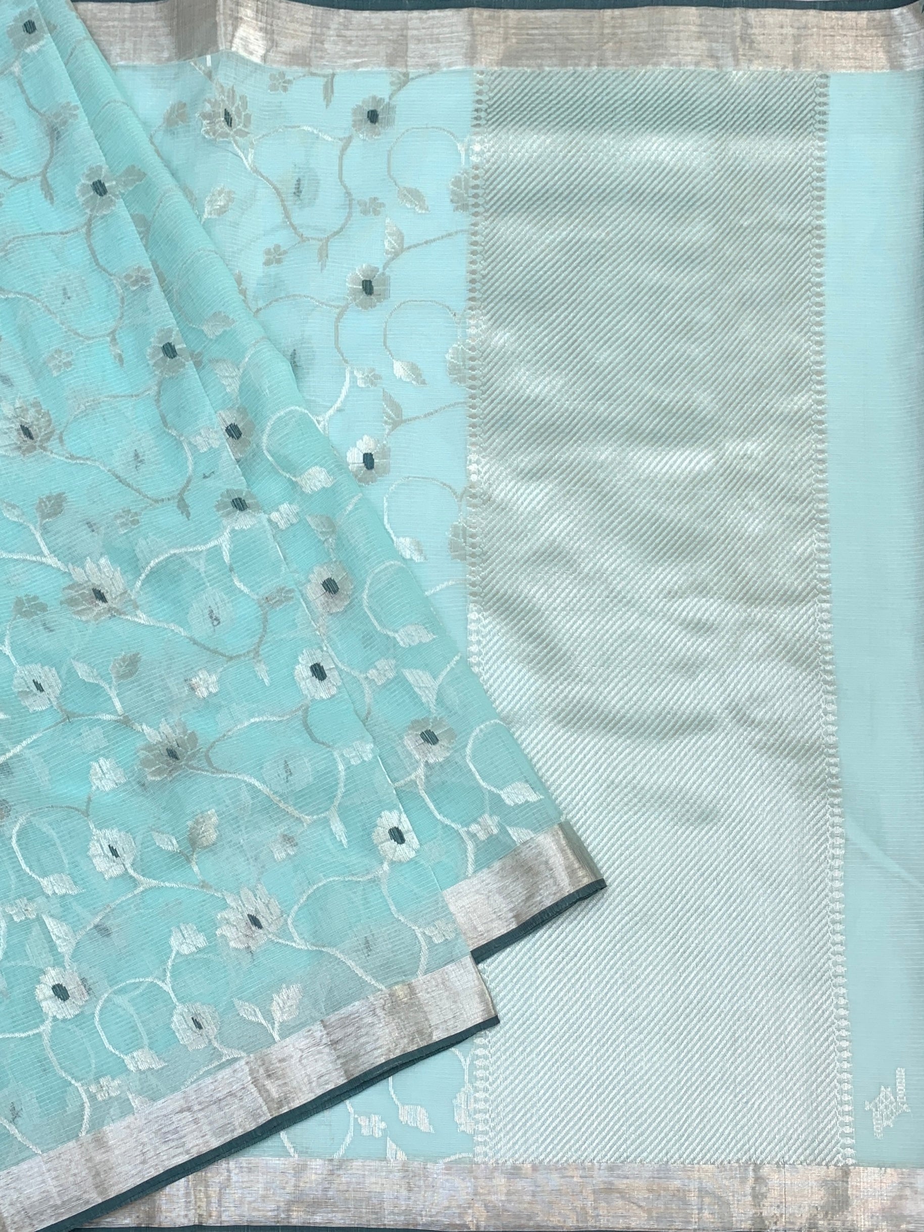 This vibrant Powder Blue Zari Kota saree beautifully combines a delicate silver zari floral weave with meenakari floral jaal throughout the fabric, accented by a sea-green secondary color. Finished with a self kaddi border and an elegant brocade pallu, it offers a graceful and refined look. The contrast blouse features intricately crafted zari buttas and a simple self plain border.