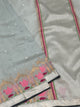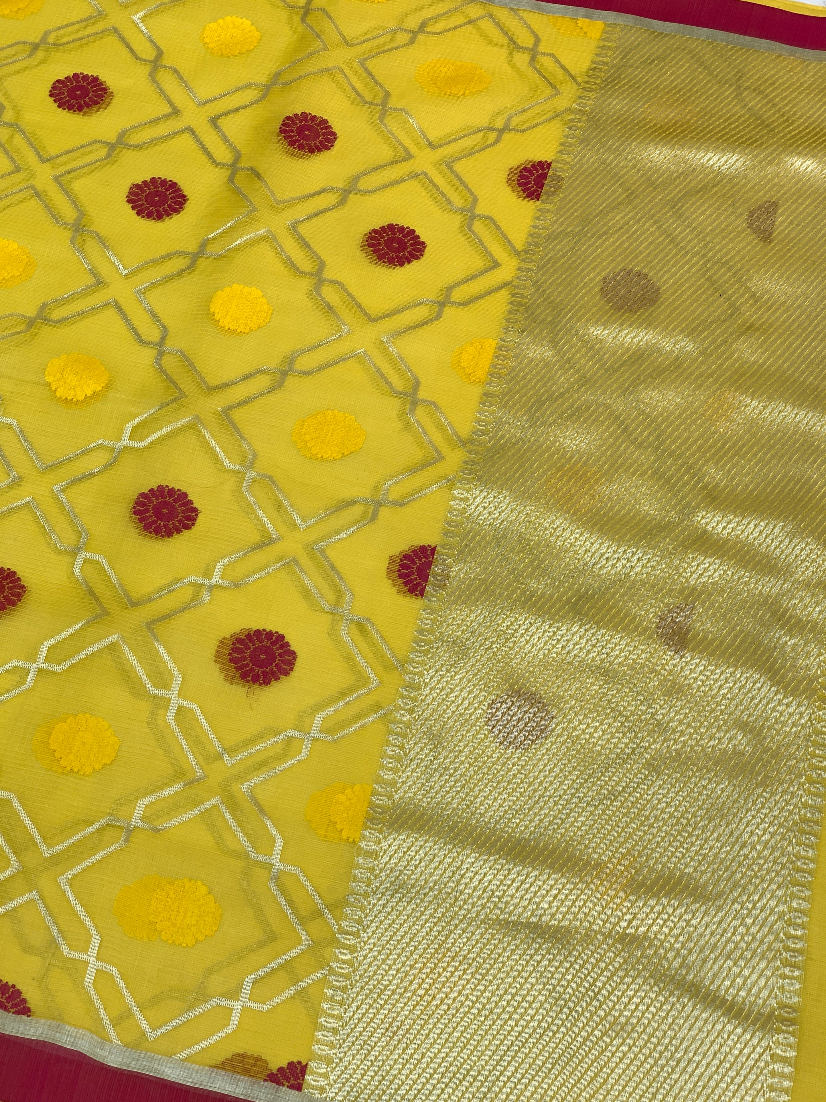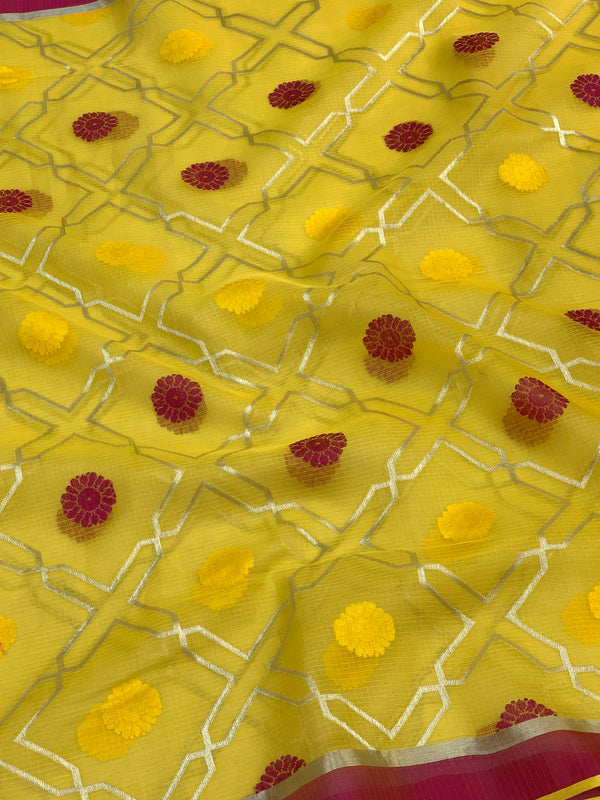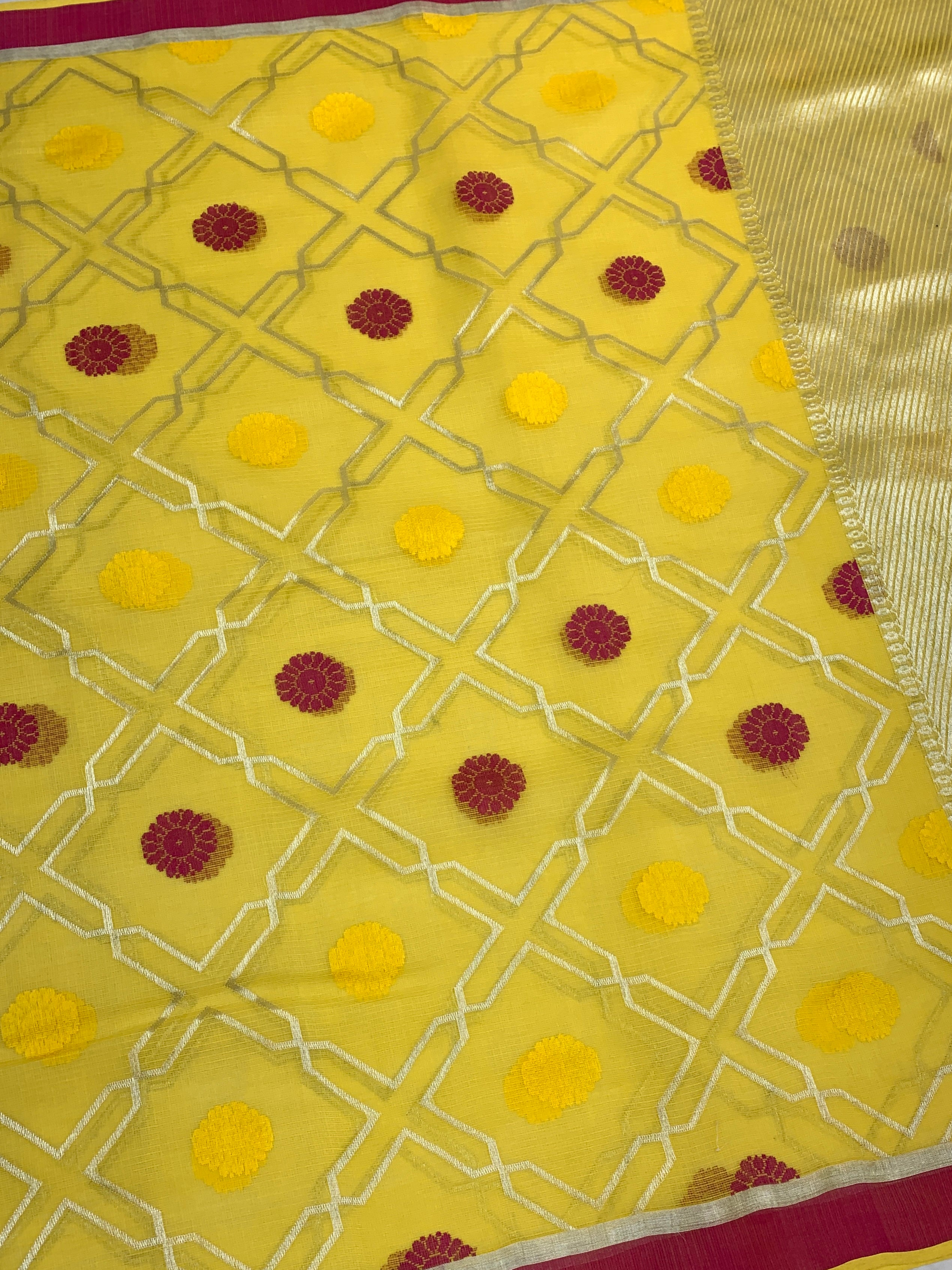 This vibrant yellow Zari Kota saree is beautifully adorned with a silver zari geometrical pattern and intricate meenakari floral butta weaving all over. It features a contrasting plain kaddi border and an elegant brocade pallu, creating a striking look. The matching blouse shares the same contrast tone as the saree body.
