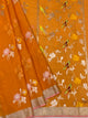 This stunning yellow zari kota saree features intricate silver zari with delicate floral buttis woven throughout. The saree showcases a self-plain border paired with an ornate brocade pallu for added elegance. The coordinating blouse comes in a contrasting design with polka dot buttis and a decorative border, completing this traditional ensemble perfectly.