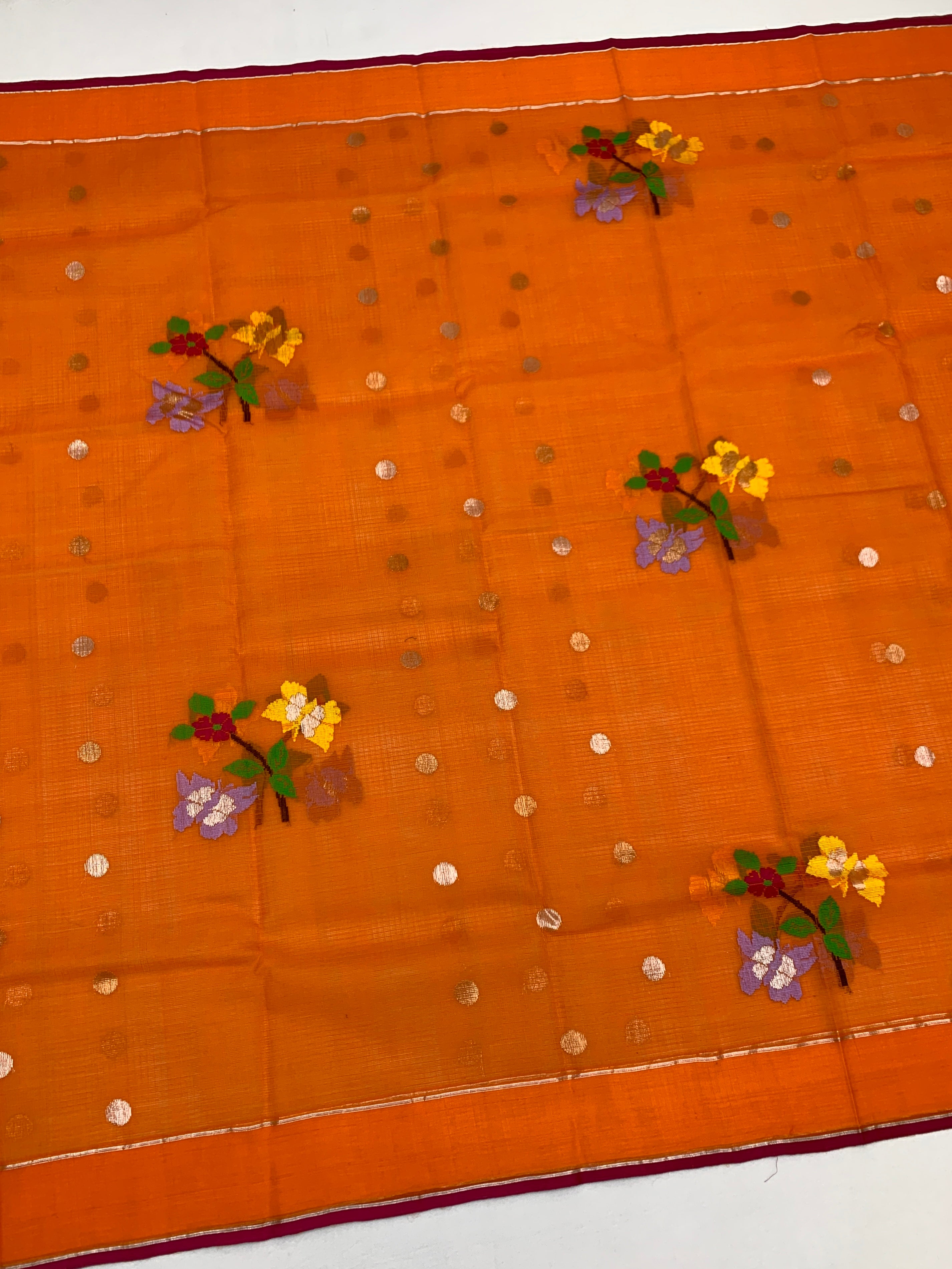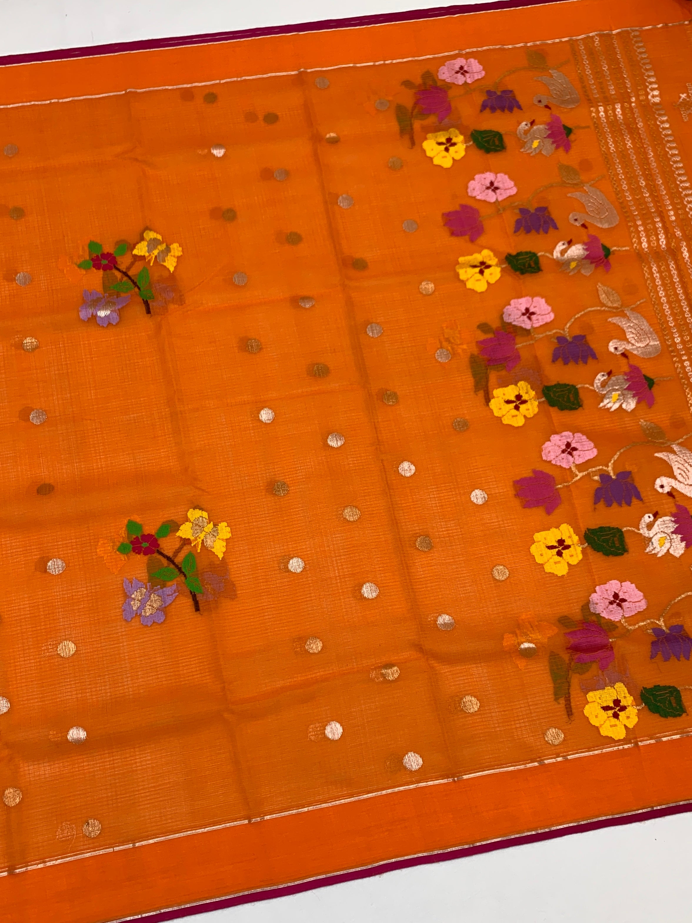 The entire drape showcases intricate gold and silver zari polka buttas complemented by delicate meenakari floral motifs and graceful butterfly patterns throughout. The self-plain border features a striking purple selvage, while the pallu captivates with multicoloured swans and elaborate floral embellishments. The coordinating blouse presents contrasting zari stripes adorned with decorative buttas and a self border.