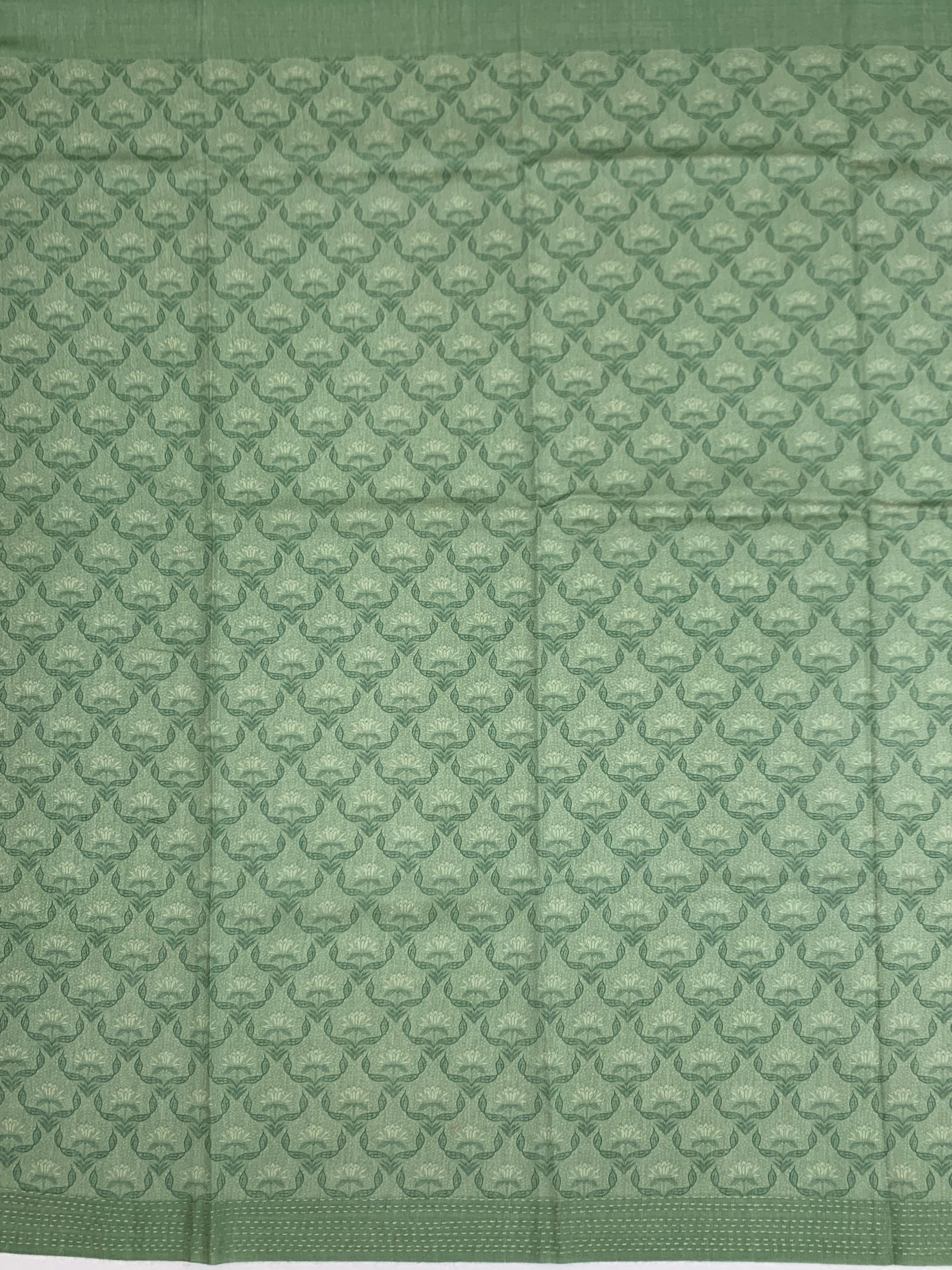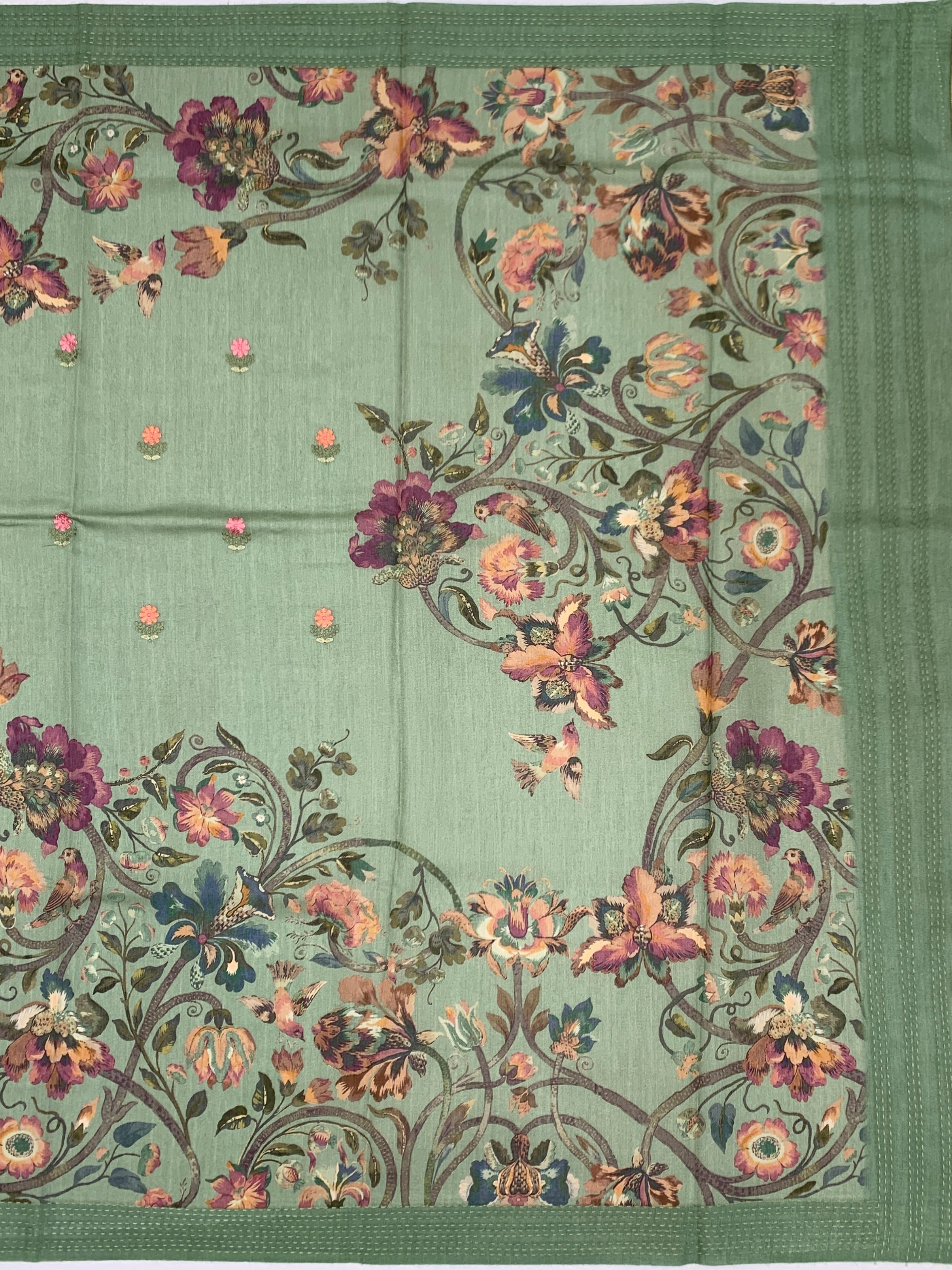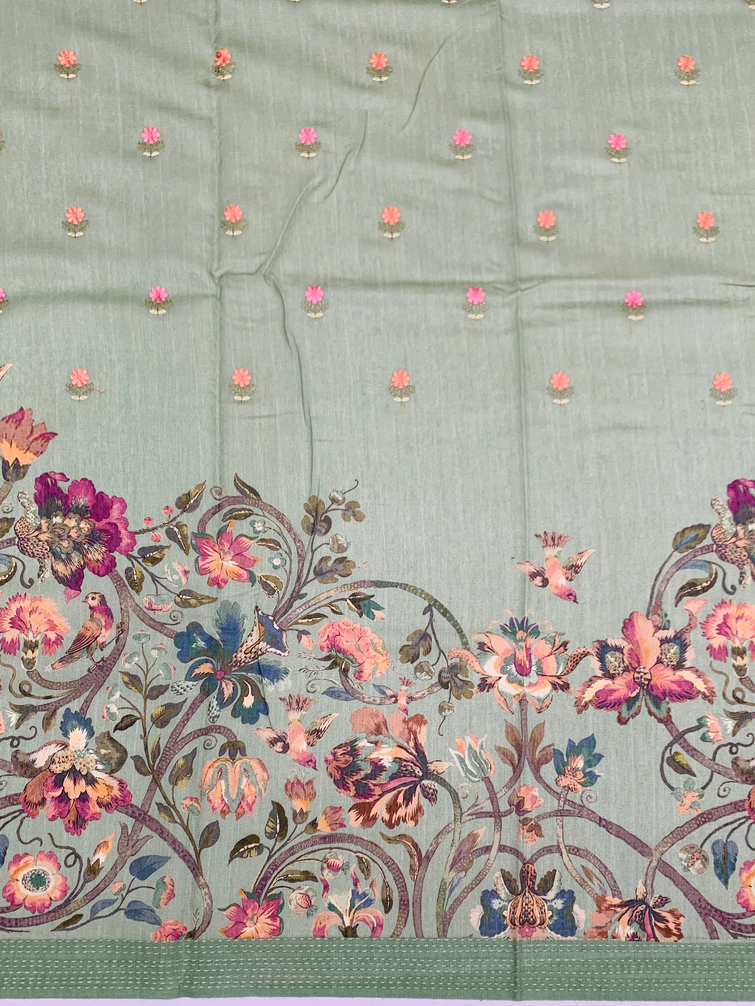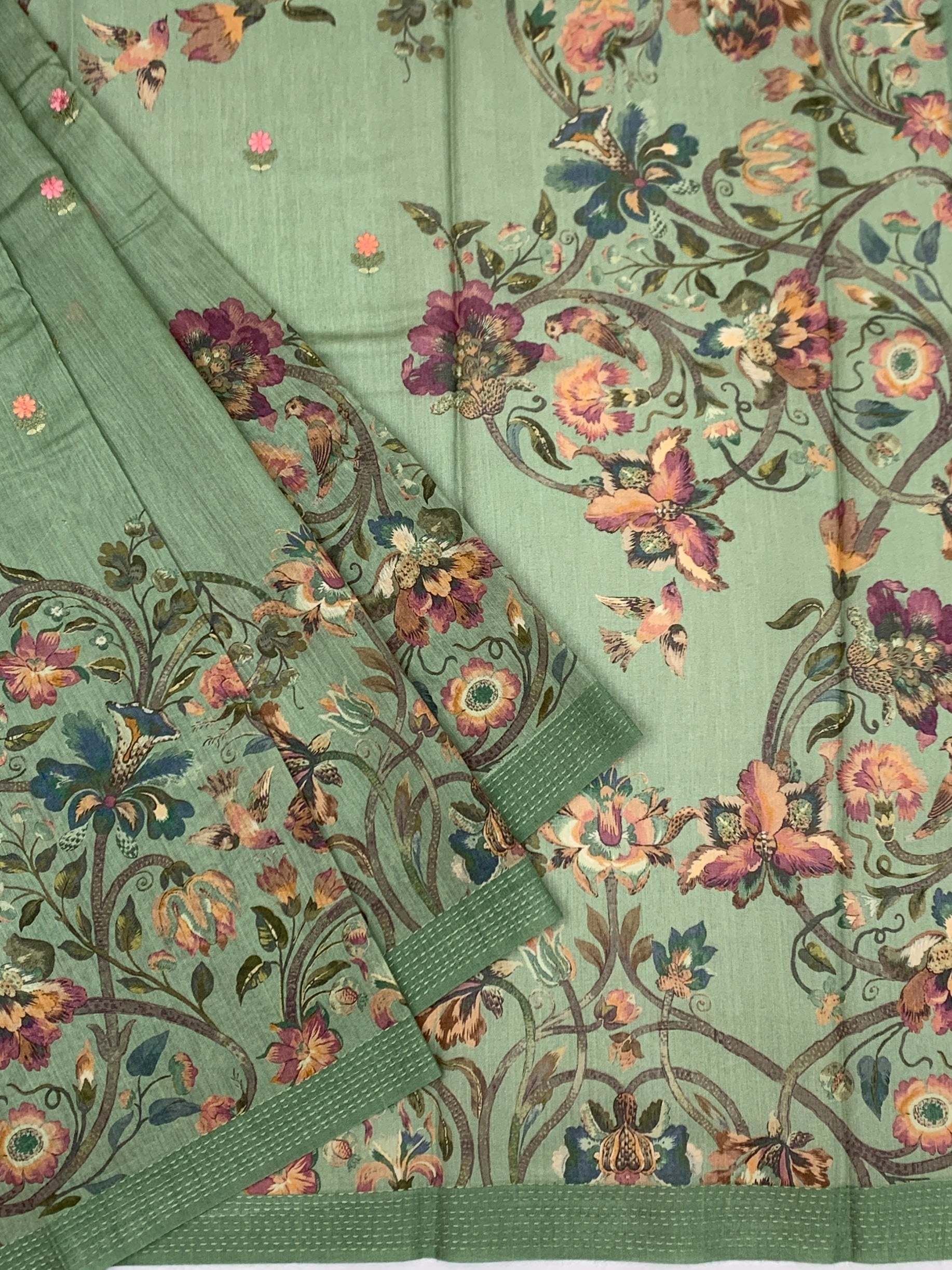 This stunning Pastel-Green Bhagalpuri Tussore Silk saree seamlessly blends heritage craftsmanship with modern aesthetics. Luxurious tussore silk drapes beautifully while digital floral prints and intricate embroidery create visual depth across the entire garment. The border and pallu feature elegant self kaantha work, adding traditional charm. A coordinating blouse with matching floral artistry completes this versatile ensemble.