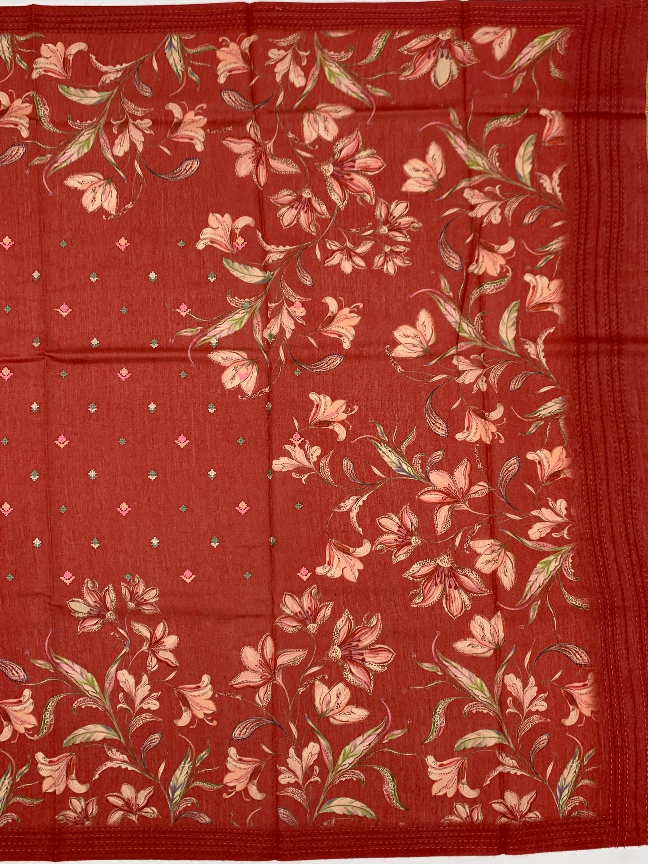 This stunning Red Bhagalpuri Tussore Silk saree combines traditional craftsmanship with contemporary design. The fabric features vibrant digital floral prints interwoven with delicate embroidery that gracefully adorns the entire drape. Elegant self kaantha work embellishes the border and pallu, The included blouse showcases modern artistic flair with matching floral patterns, creating a cohesive ensemble.
