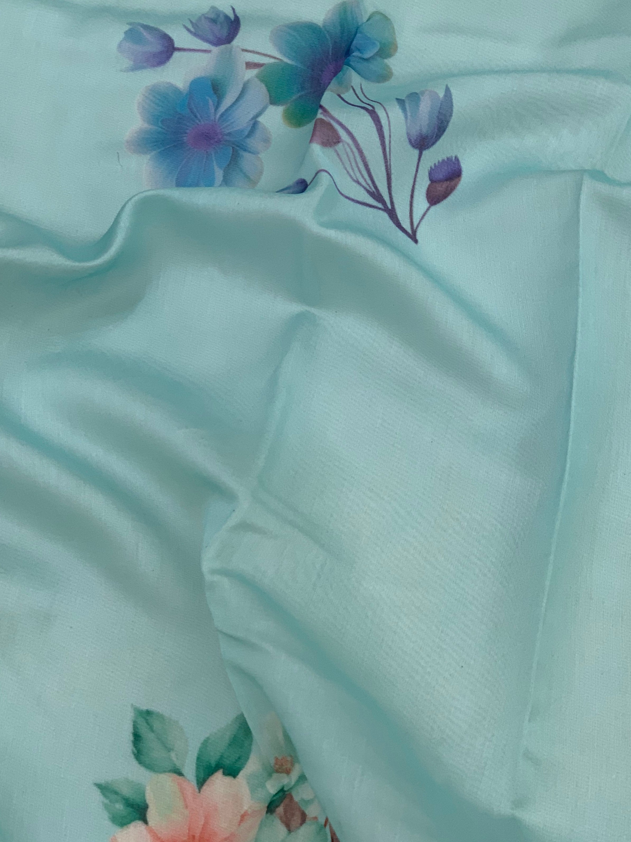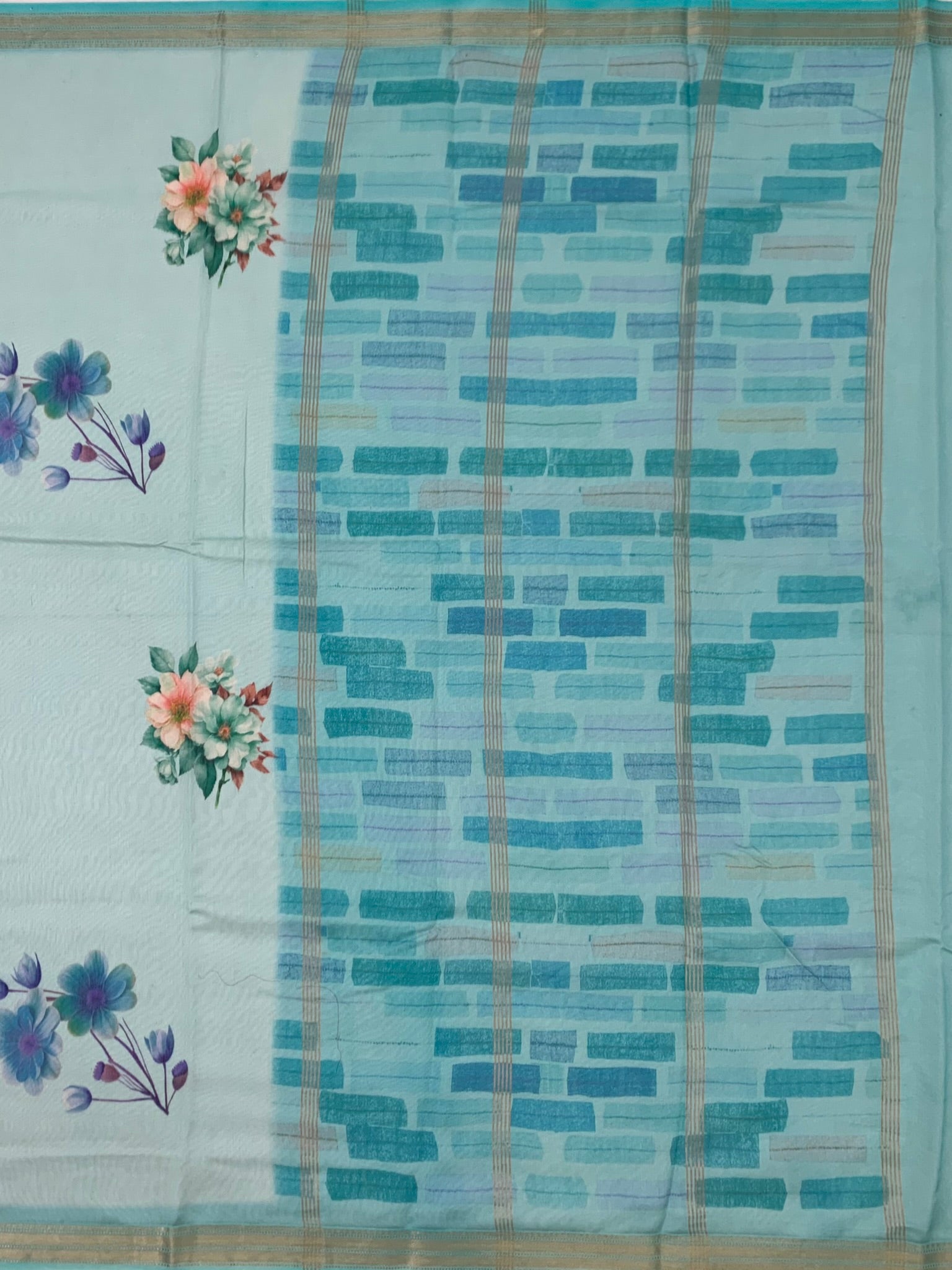 This Powder-Blue Chanderi Cotton Saree features a beautiful floral digital design all over, enhanced by a delicate gold zari border and Pallu. The attached blouse also showcases a matching self floral pattern with border.