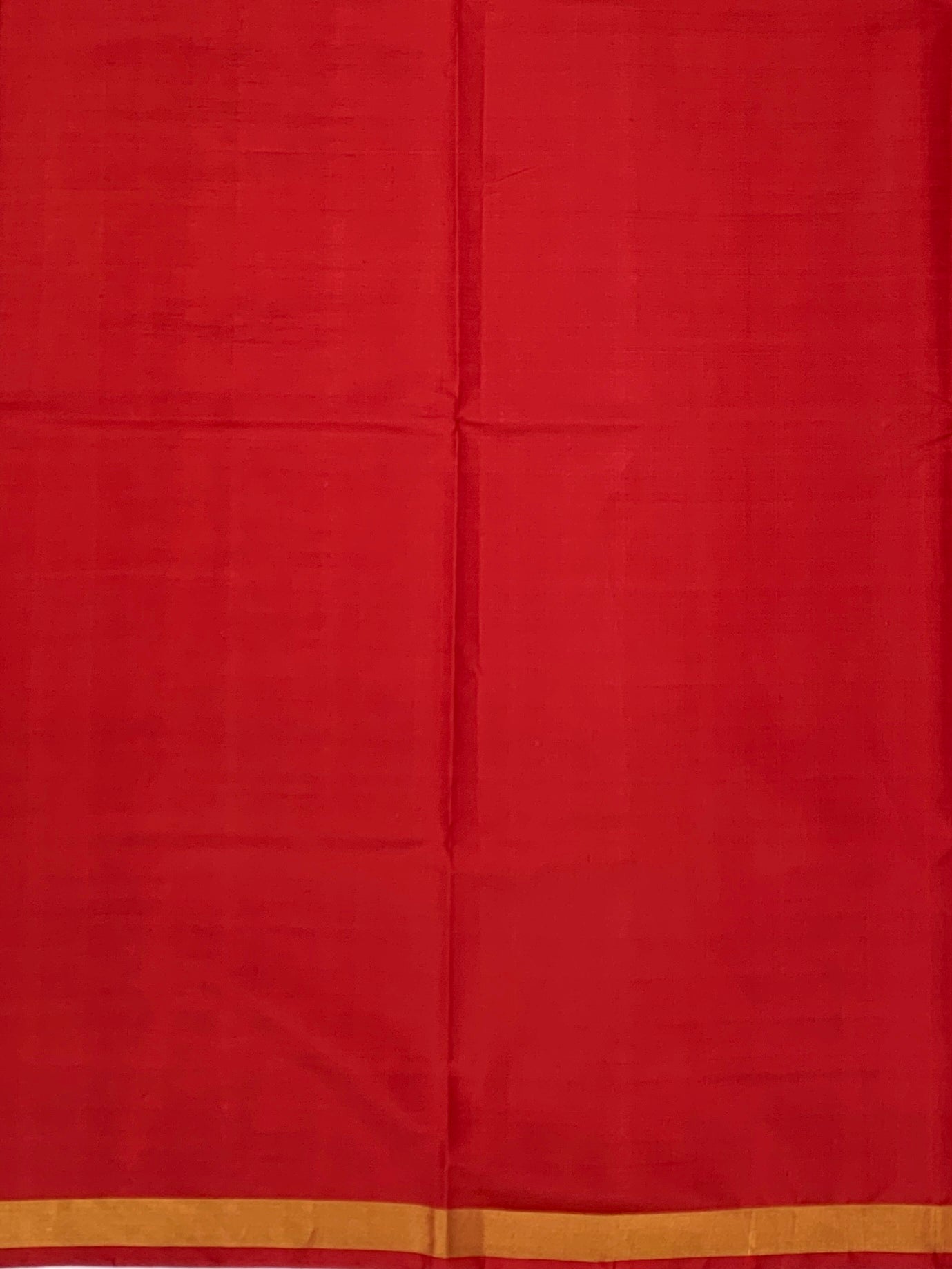The Blouse: Complemented by a solid crimson red silk blouse piece with a matching gold border, allowing the intricate patterns of the saree to remain the center of attention.