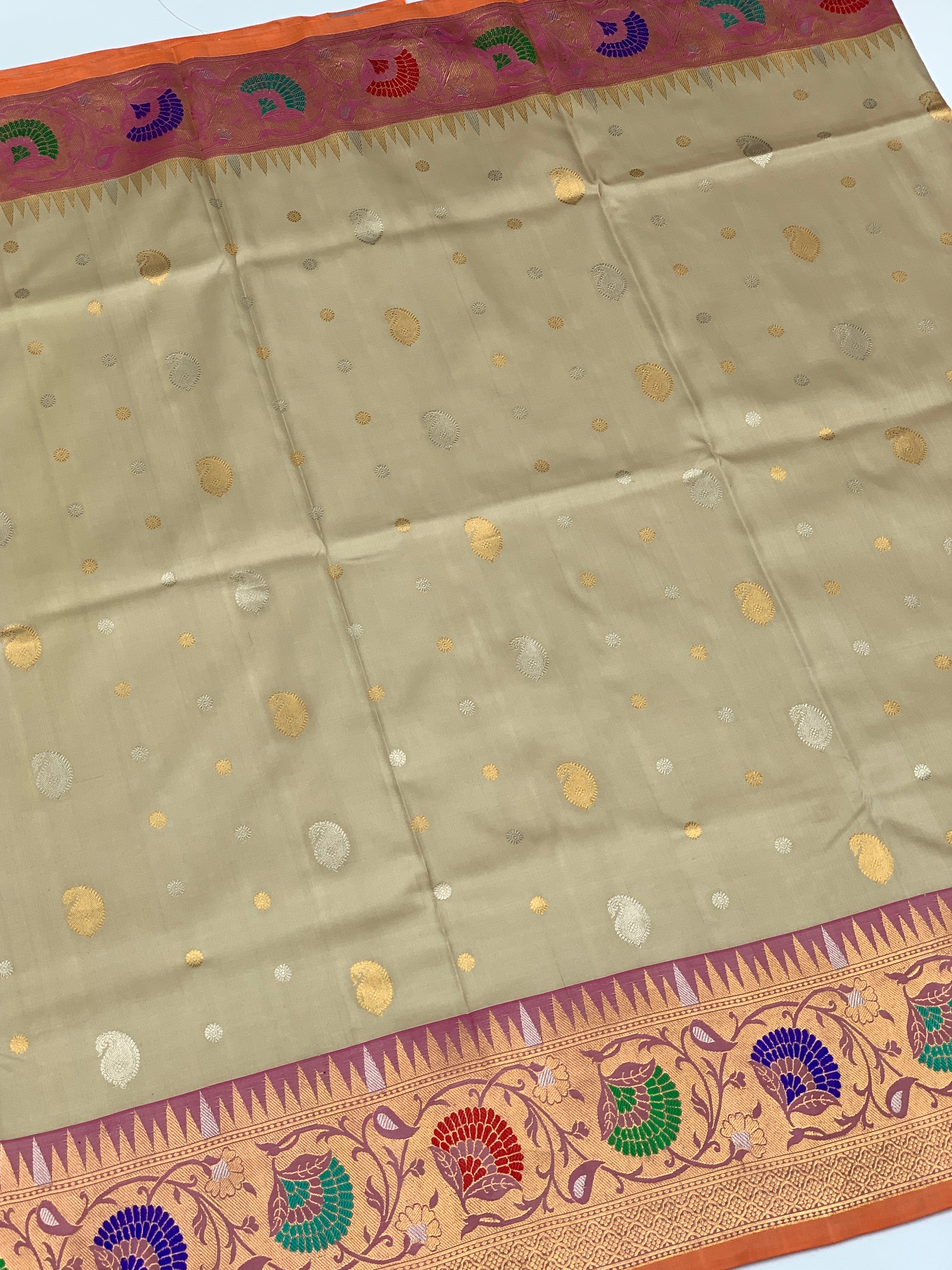 Elegant beige Gadwal pattu saree featuring intricate gold and silver zari with delicate floral and kairi buttis throughout. The saree showcases a striking contrast floral border and ornate brocade pallu. Paired with a coordinating blouse adorned with matching floral buttis and decorative border detailing.