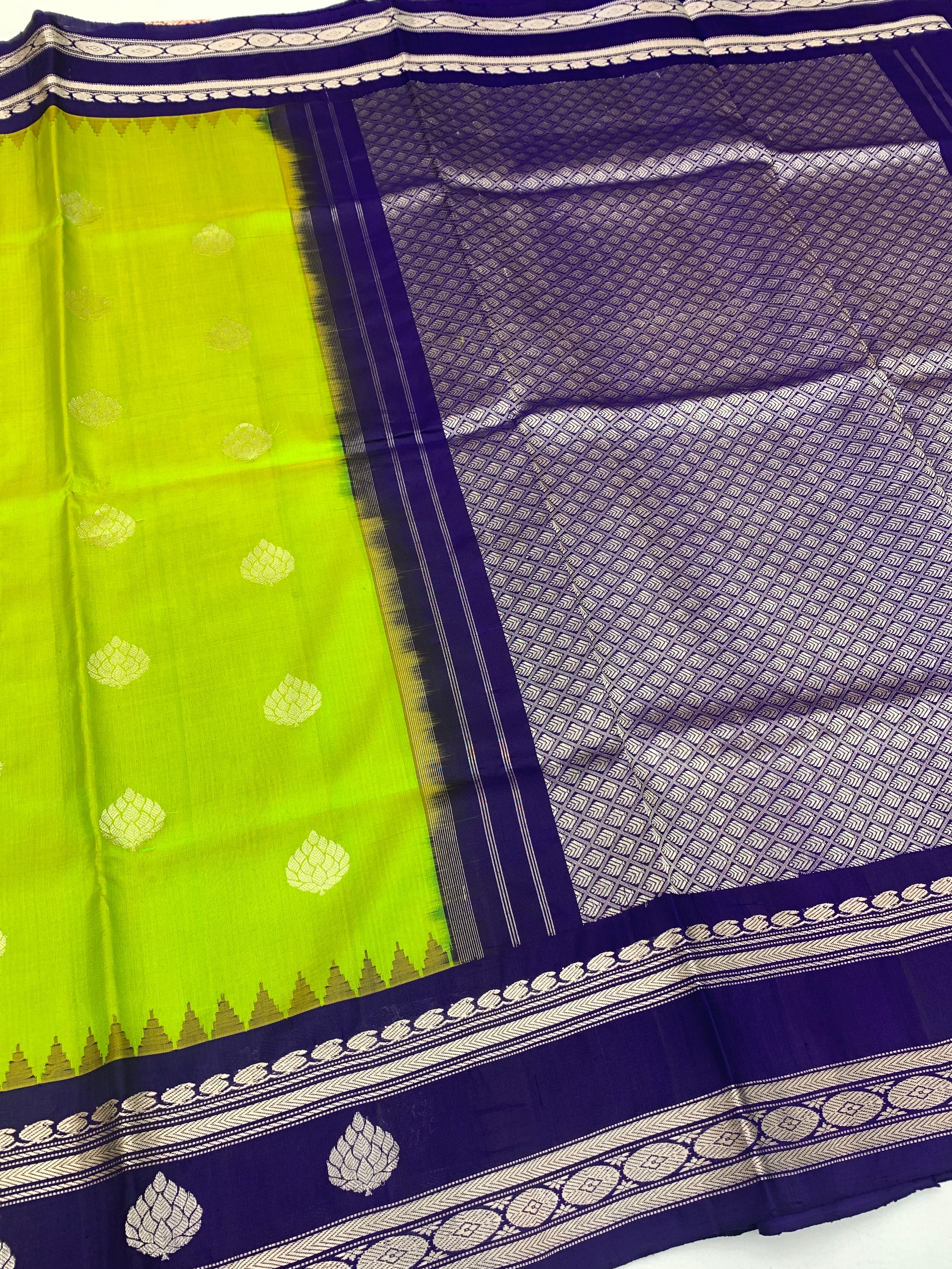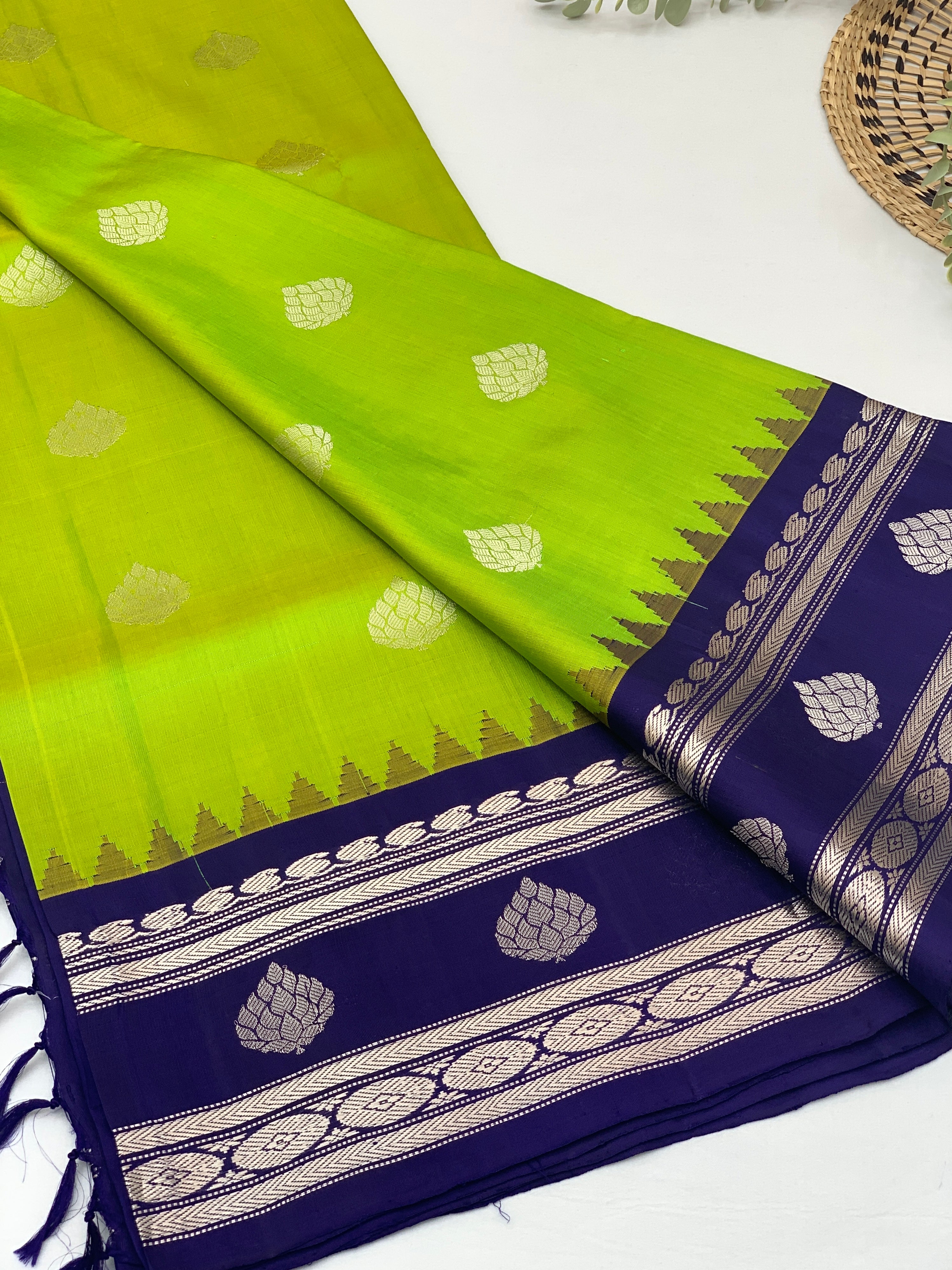 Stunning gadwal pattu saree in rich green. Featuring intricate silver zari floral buttis scattered across the fabric, it showcases a striking contrast border and ornate brocade pallu. The coordinating blouse comes in a complementary shade with a bordered finish, perfect for any traditional occasion.