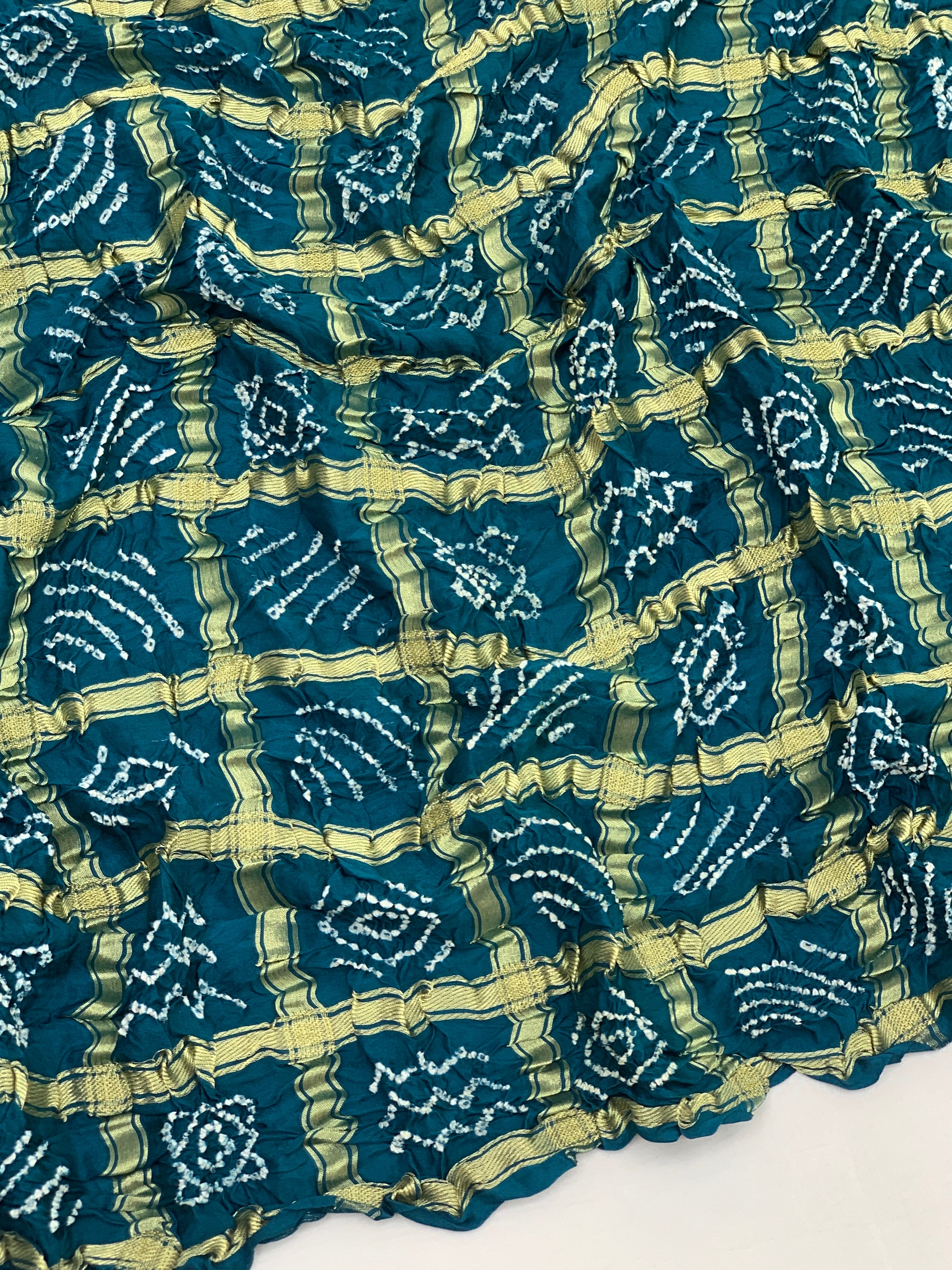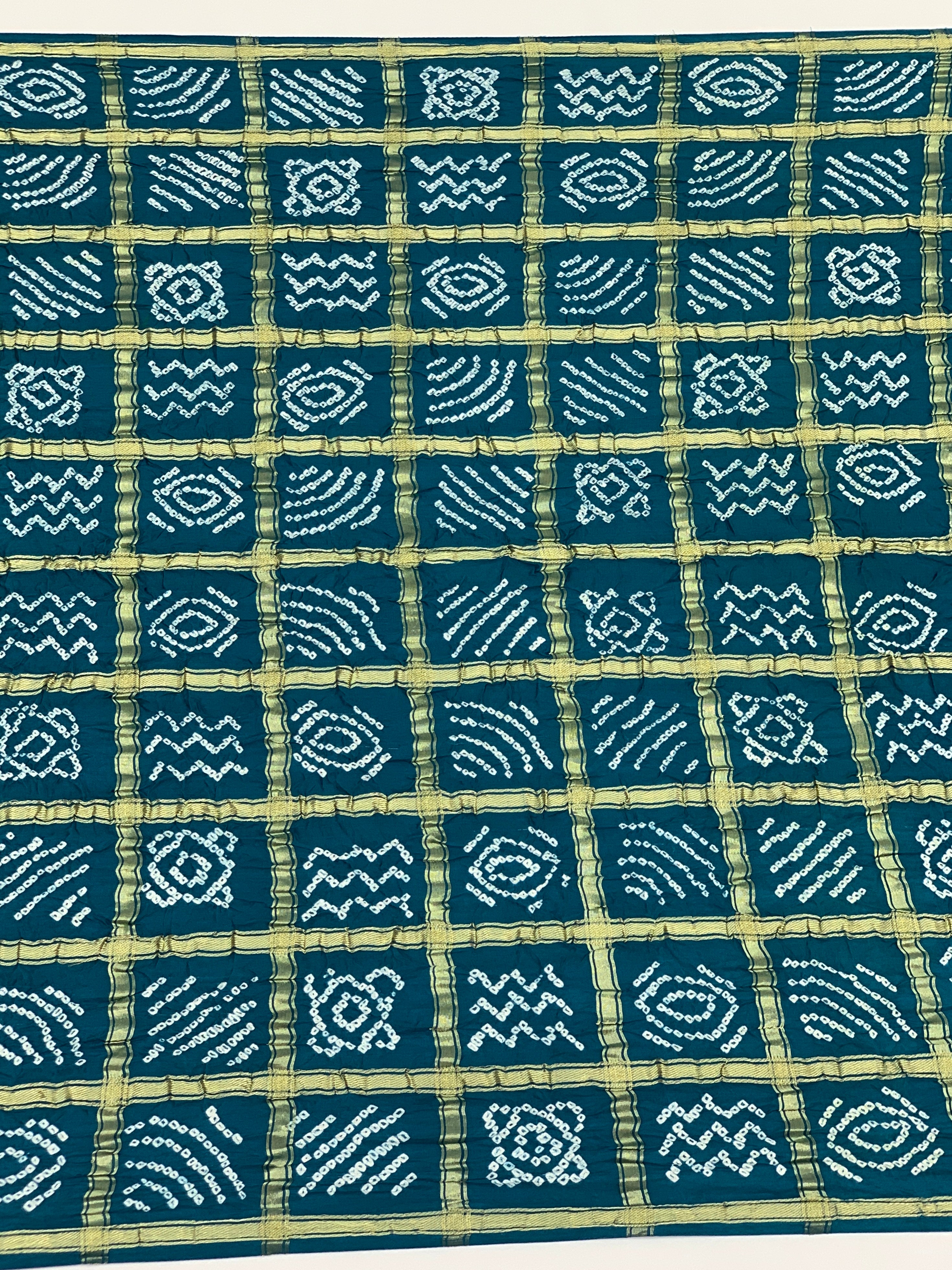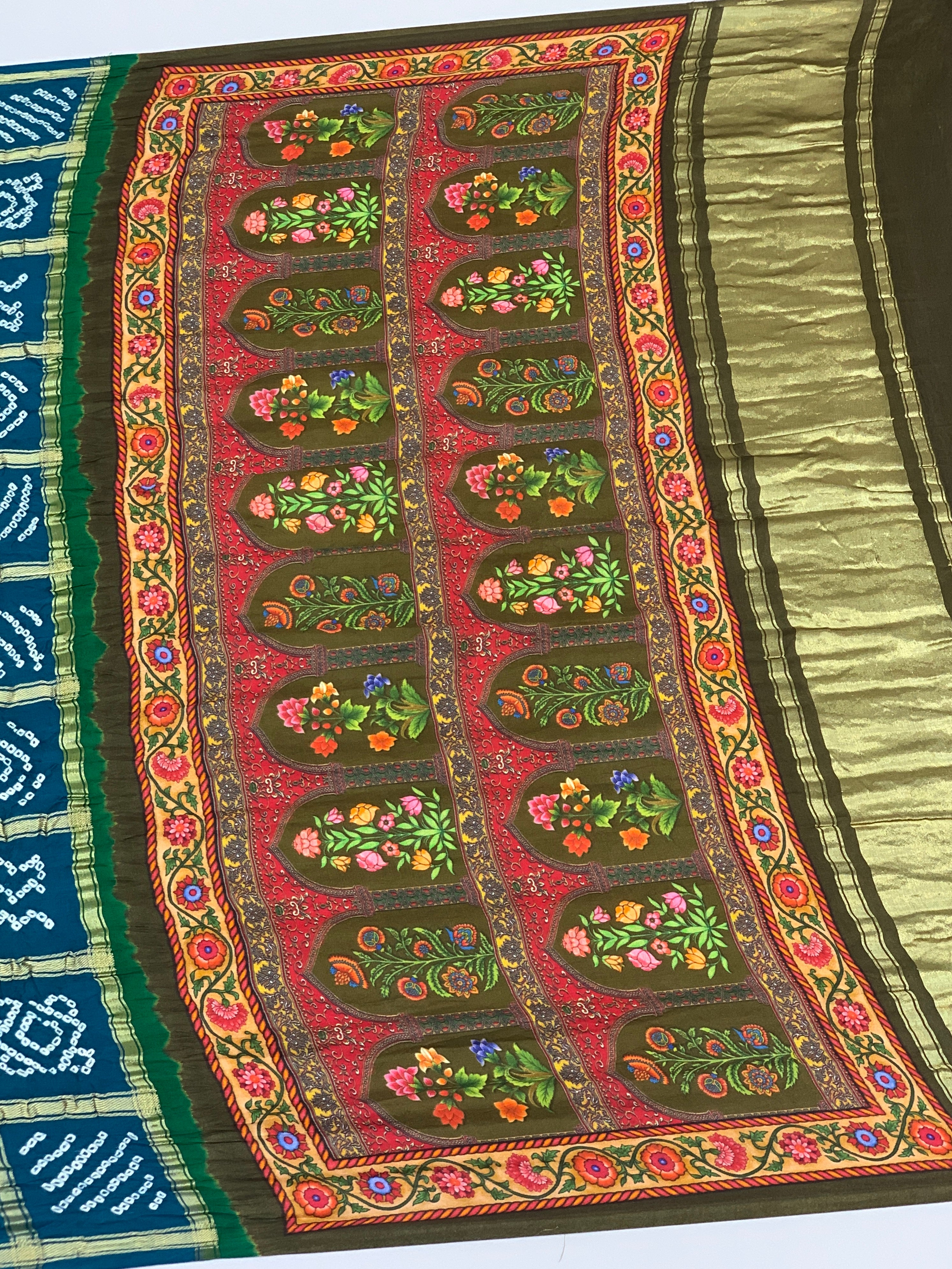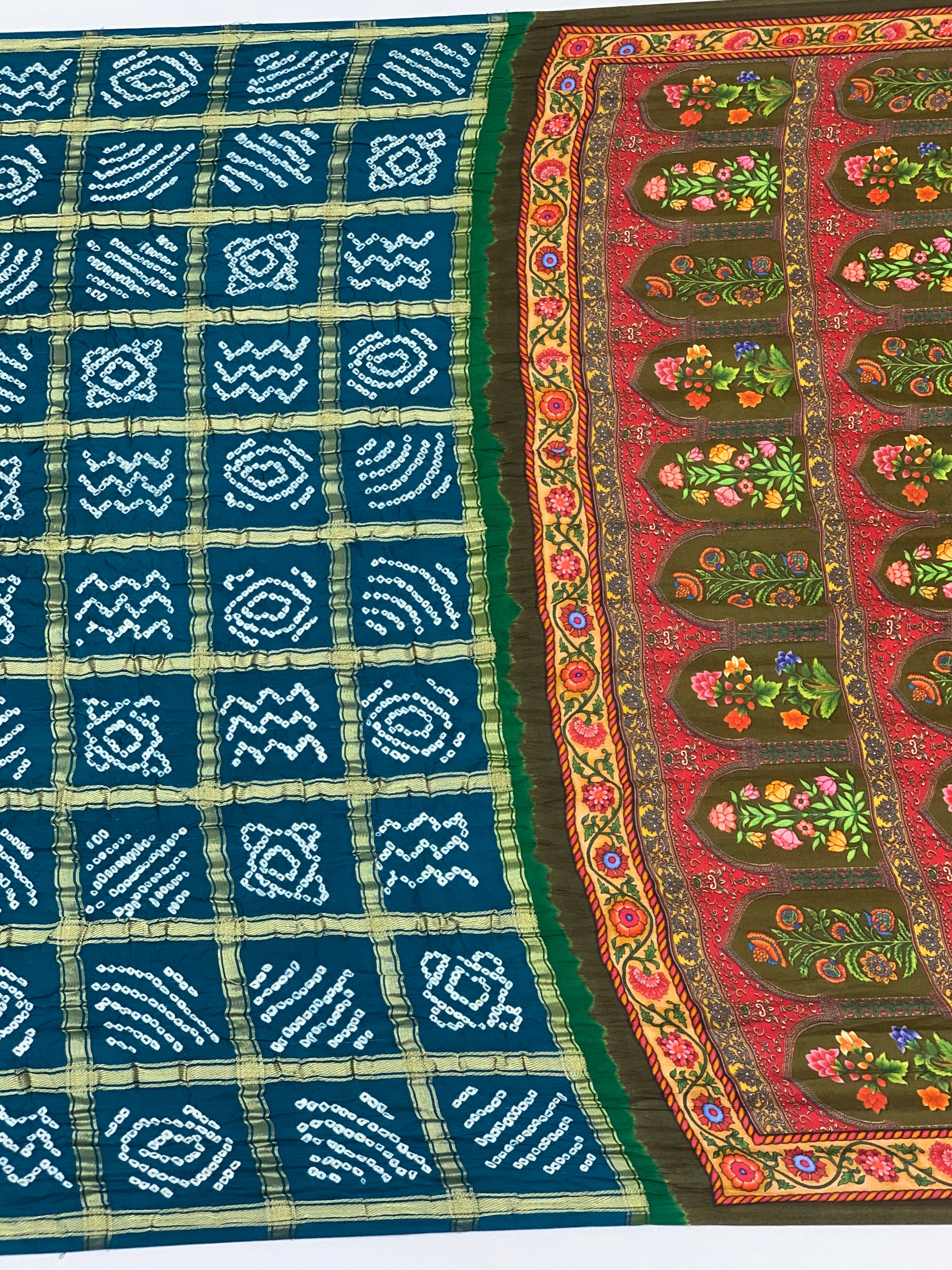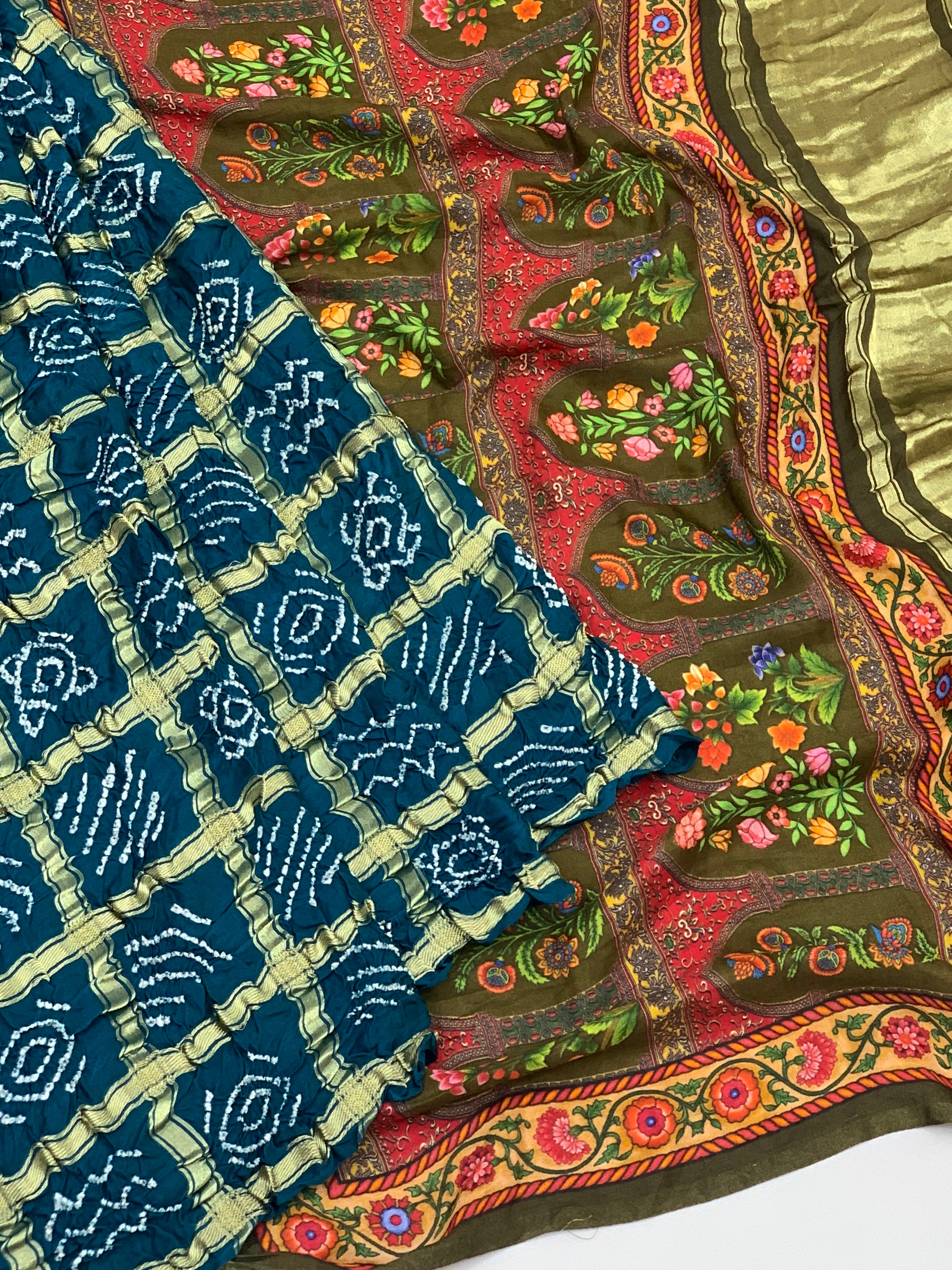 Draped in serene rama-blue, this gajji silk saree showcases traditional bandhani tie-and-dye artistry with delicate floral motifs. Gold zari checks add shimmer across the fabric, while the contrasting printed pallu and blouse feature complementary floral patterns for a complete, coordinated look.