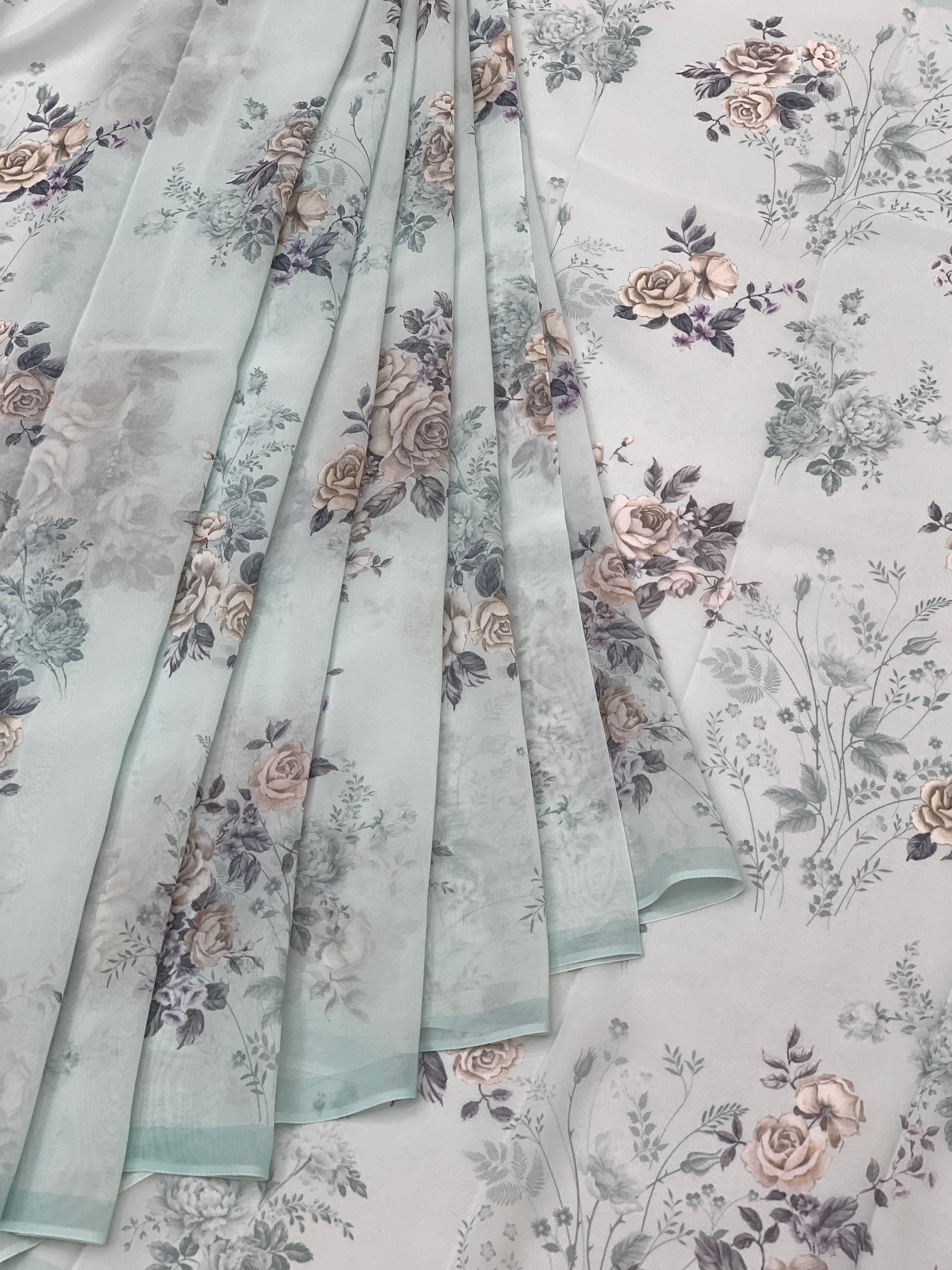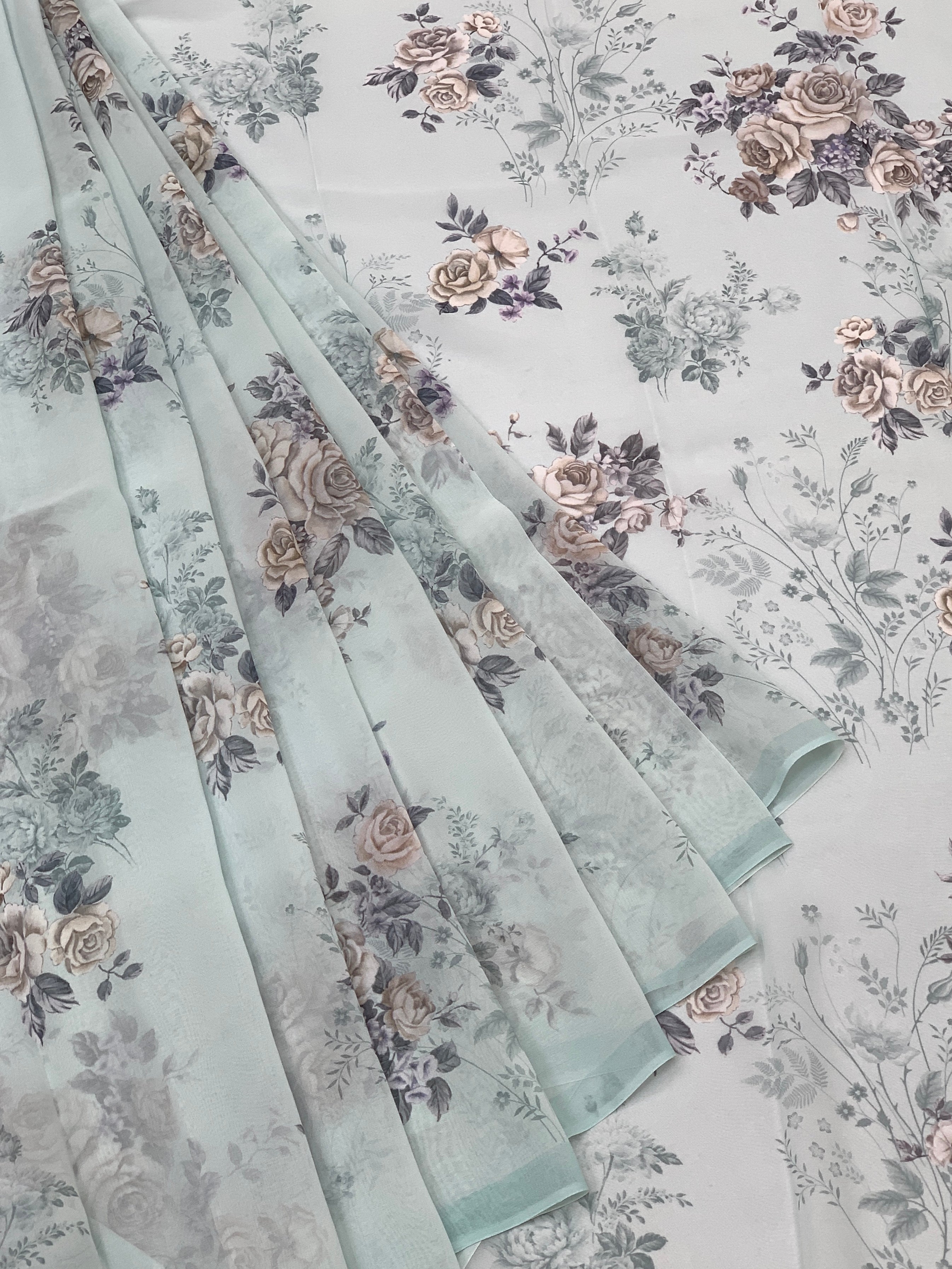 Graceful ice-blue georgette saree adorned with delicate floral prints across the entire fabric. Features a minimalist plain border paired with an ornate floral pallu for visual interest. Includes a coordinating crepe blouse with geometric detailing for a complete ensemble.