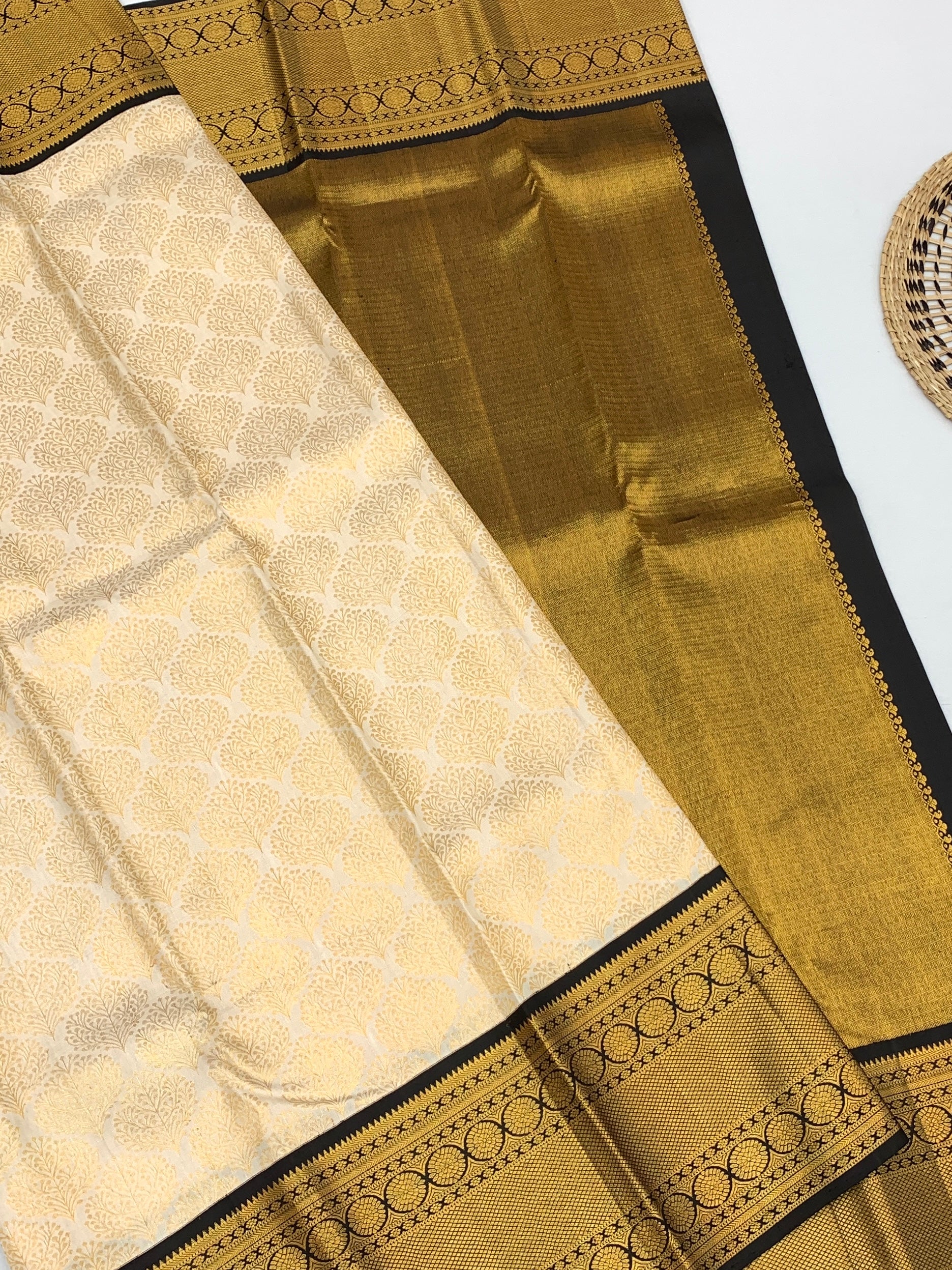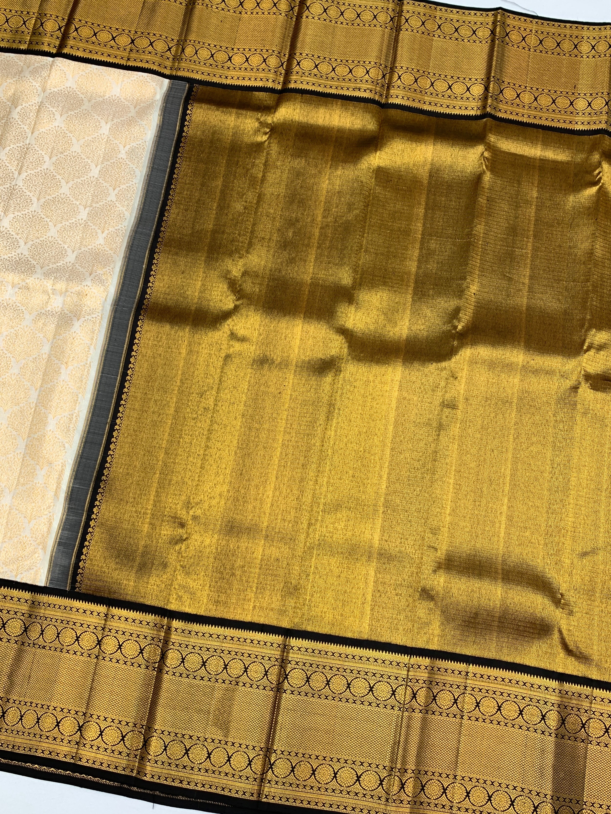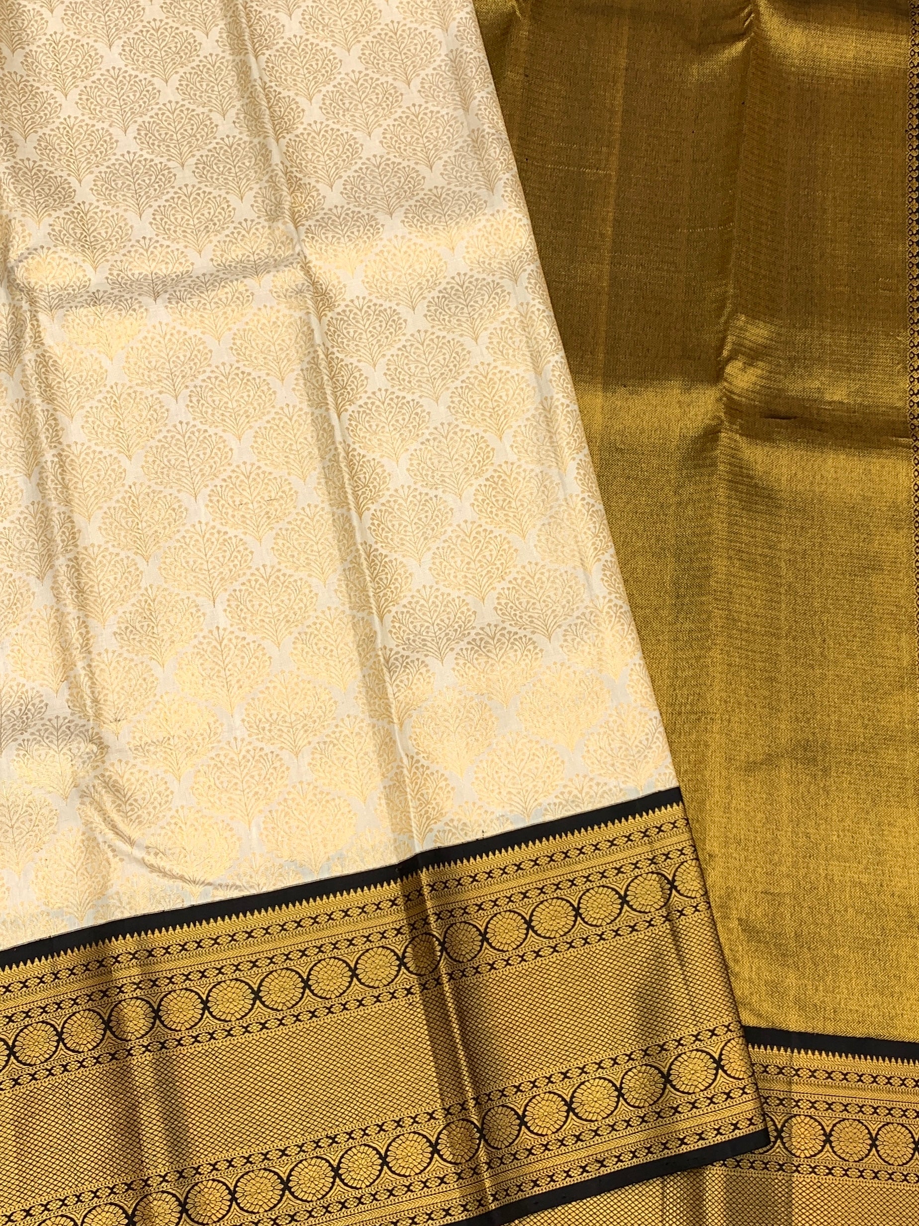 Elegant Kanjeevaram silk saree featuring intricate gold zari floral buttis throughout. The half-white design is complemented by a striking contrast brocade border and pallu. Includes a coordinating plain blouse with decorative border detailing for a complete, sophisticated look.