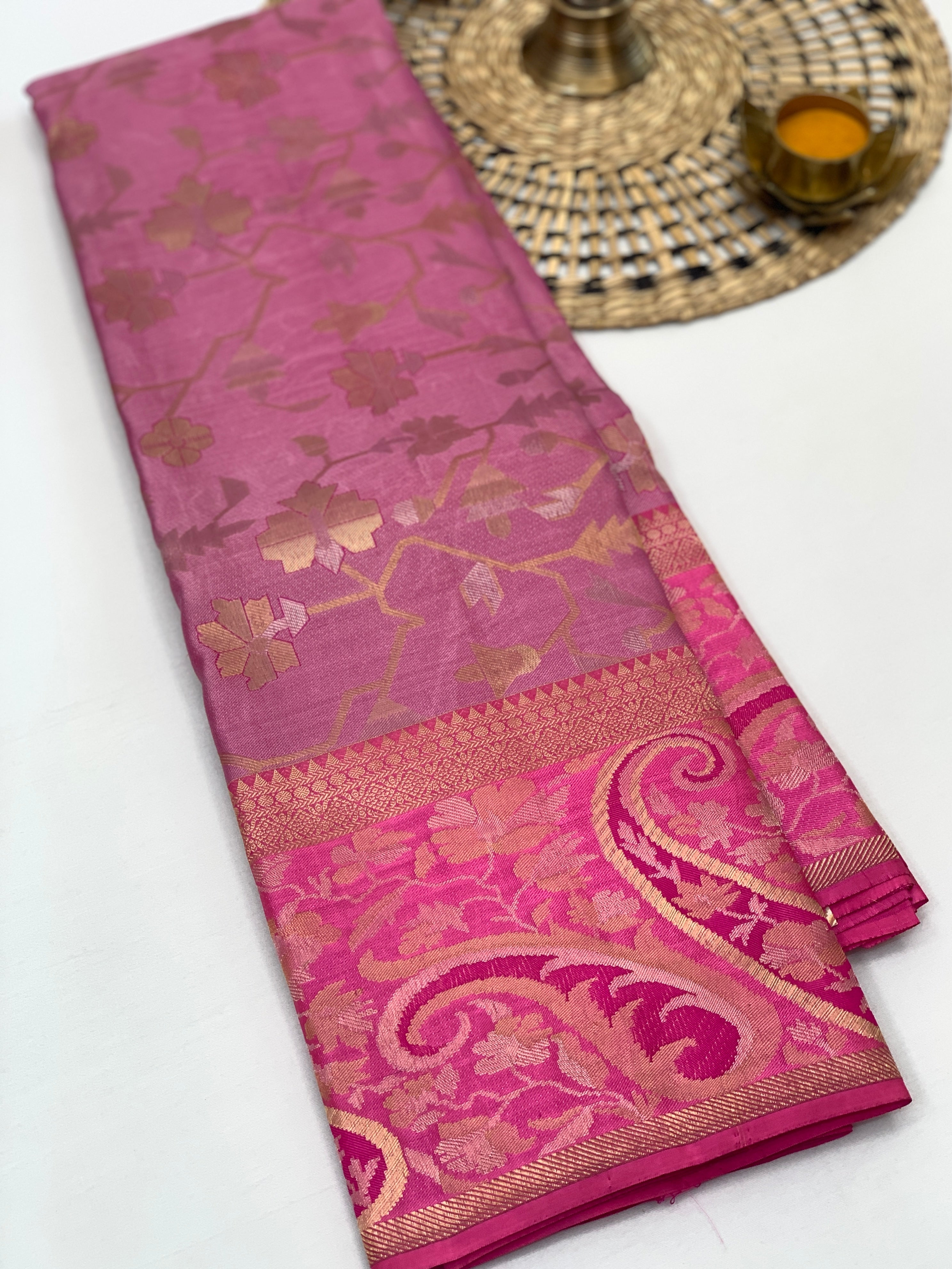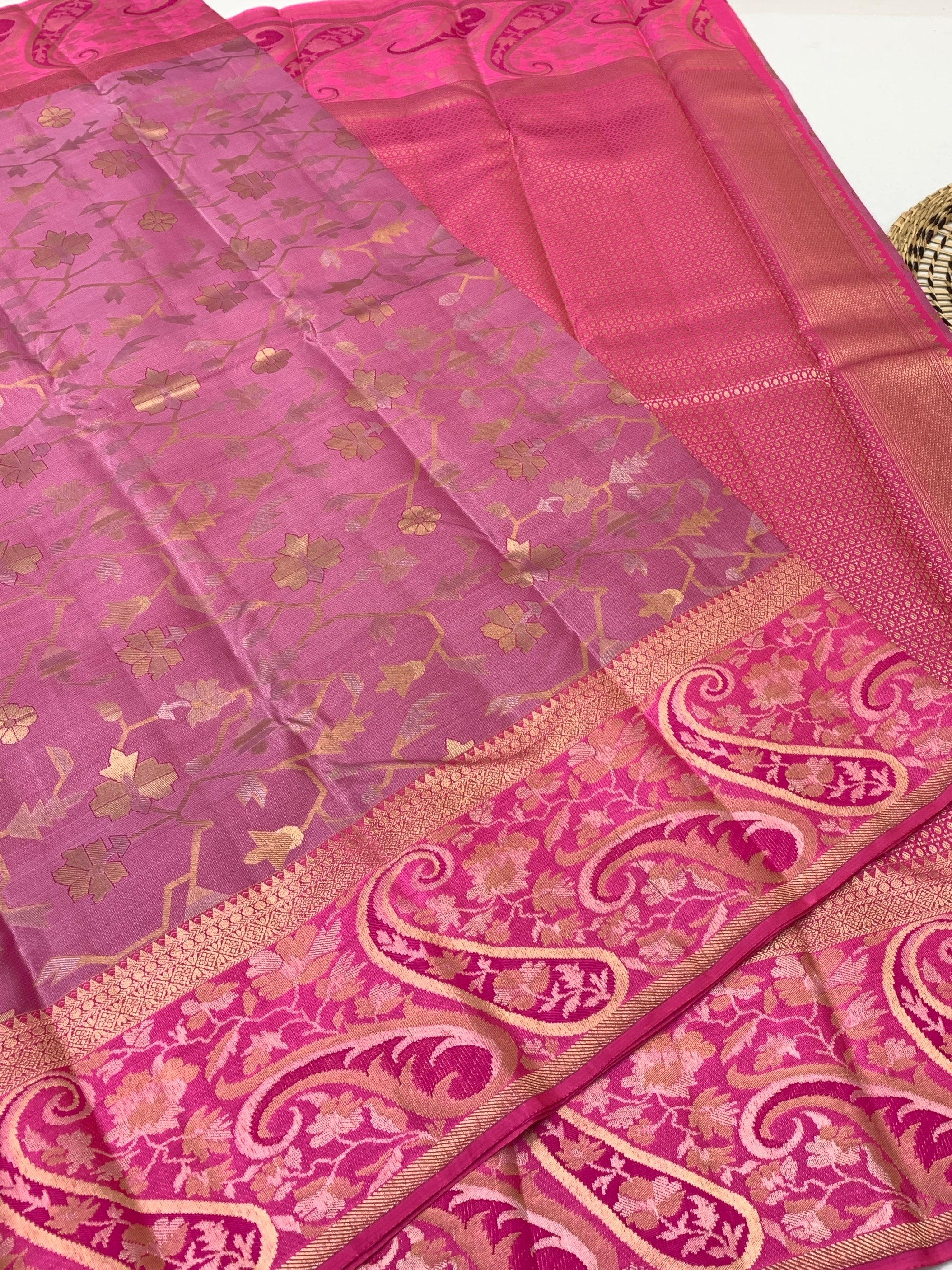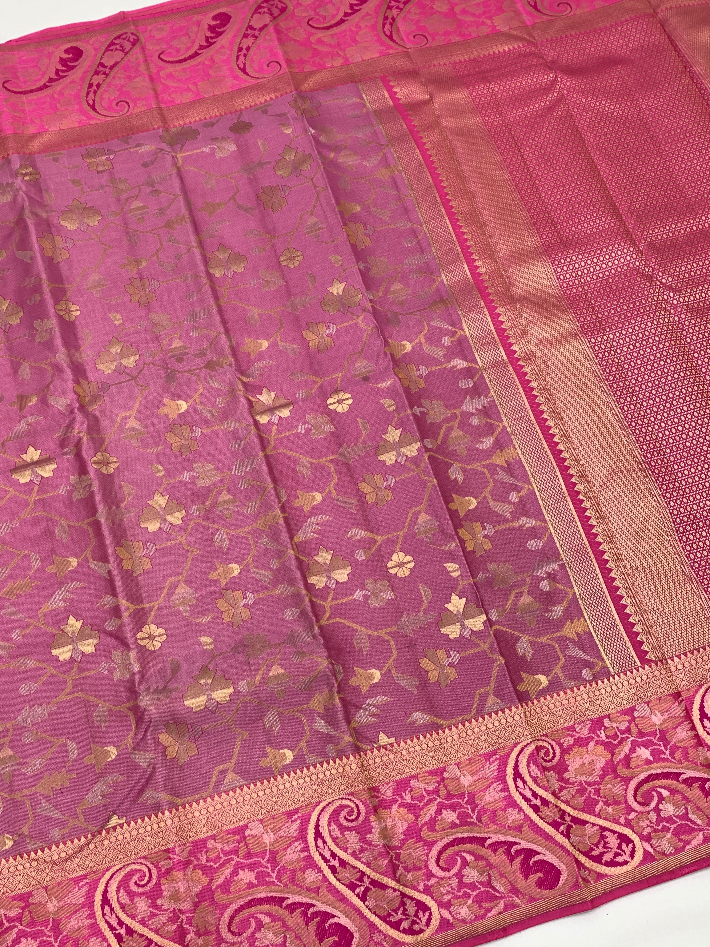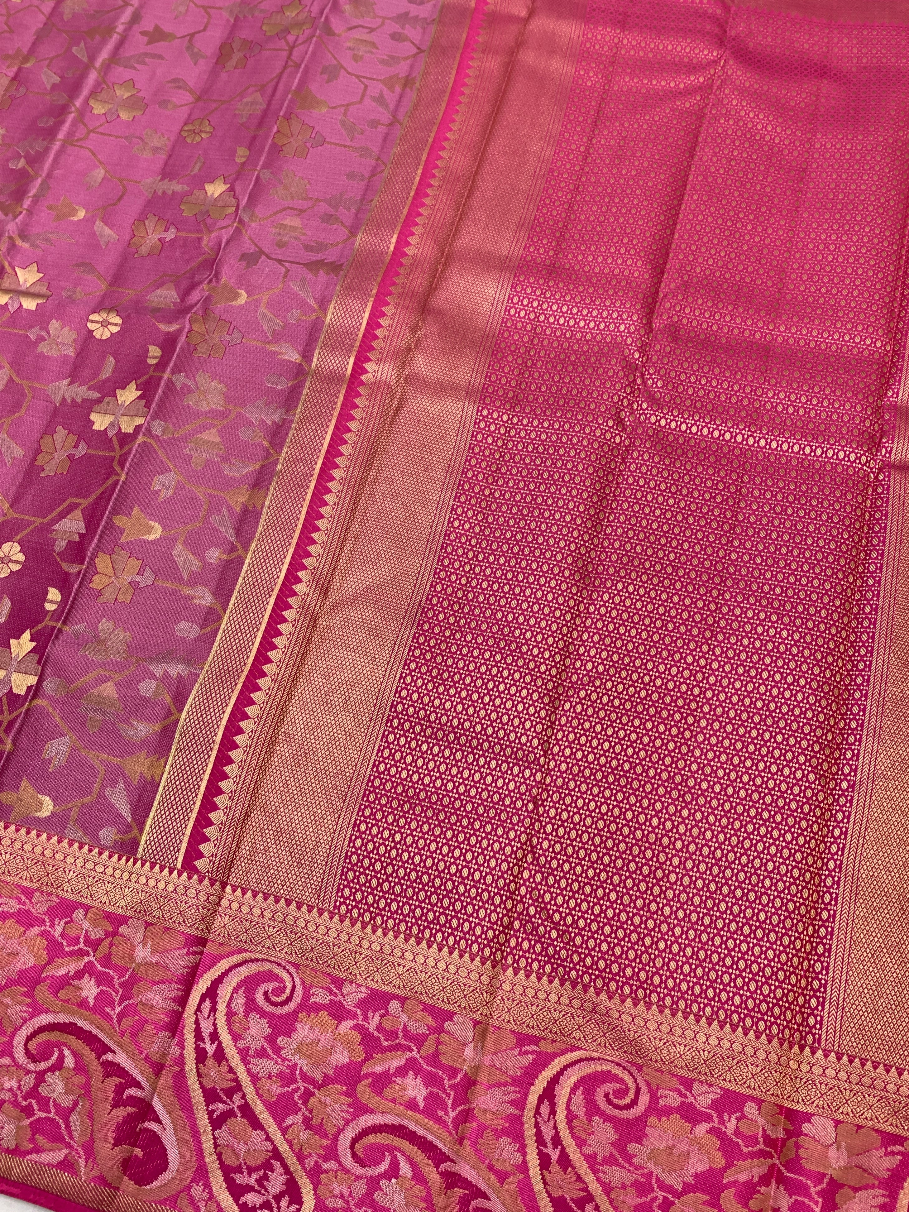 Elevate your ethnic wardrobe with this stunning Kanjeevaram silk saree in light-magenta. Featuring intricate all-over gold and silver zari floral weaving, it showcases a contrasting floral border and pallu for added elegance. The coordinating brocade blouse with decorative border completes this timeless ensemble perfectly.