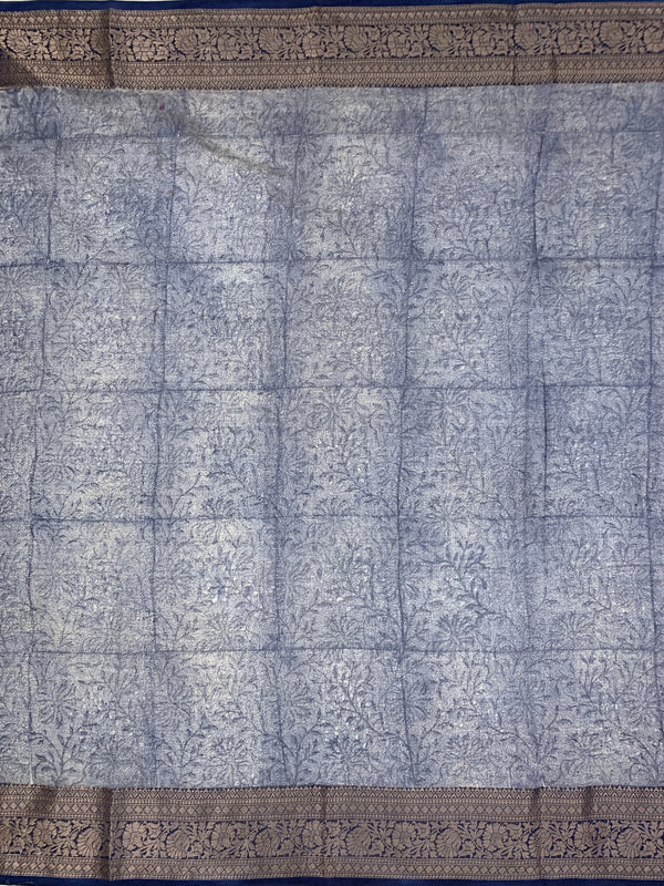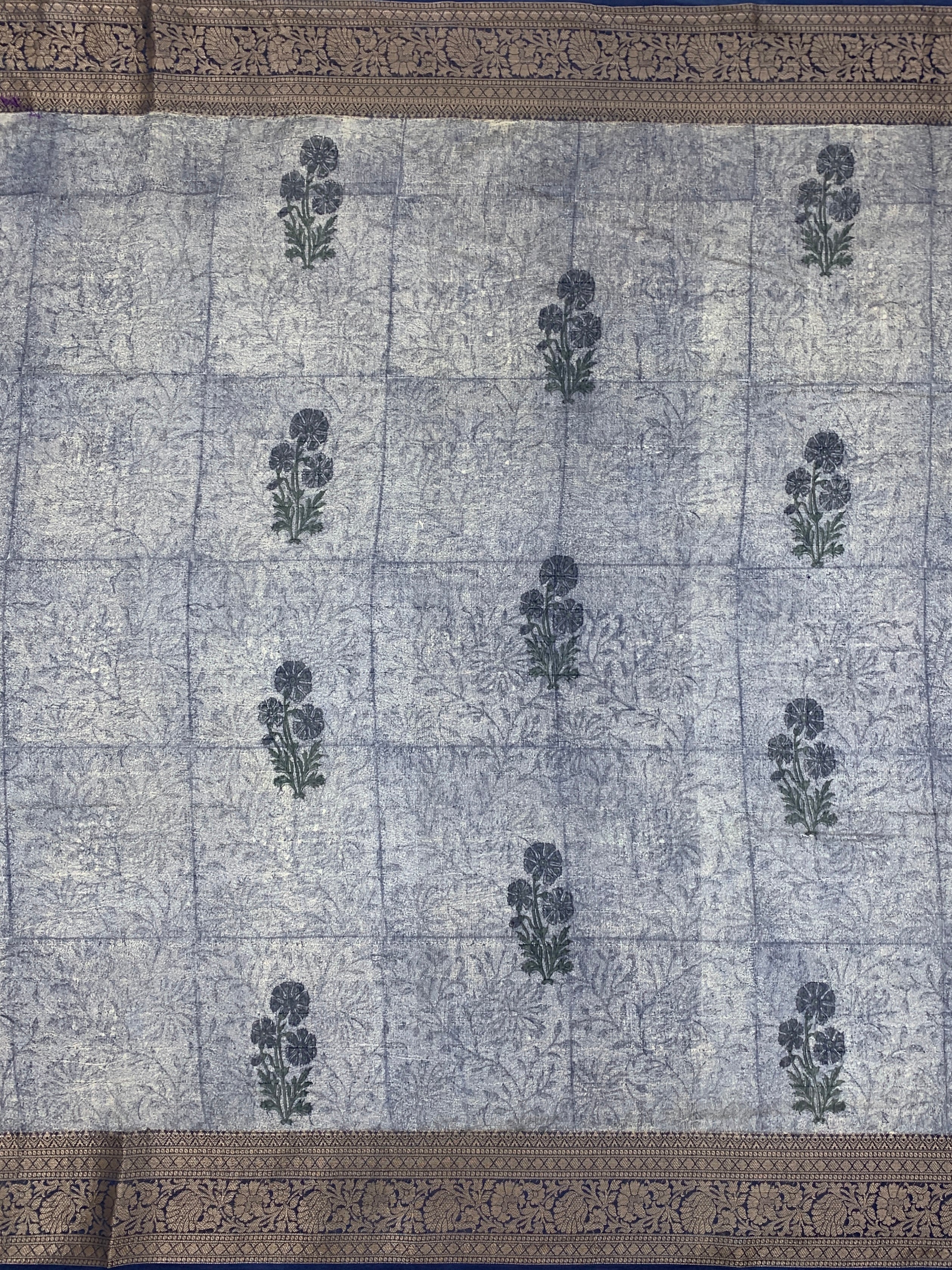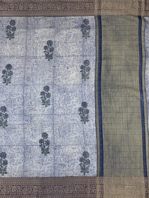 This Blue Maheshwari Cotton Saree features a harmonious blend of stripes and floral motifs, enhanced by a gentle cream secondary color. Its antique thread floral zari border adds a touch of traditional elegance, while the contrasting jute pallu brings distinctive texture. Paired with a self blouse featuring matching borders.