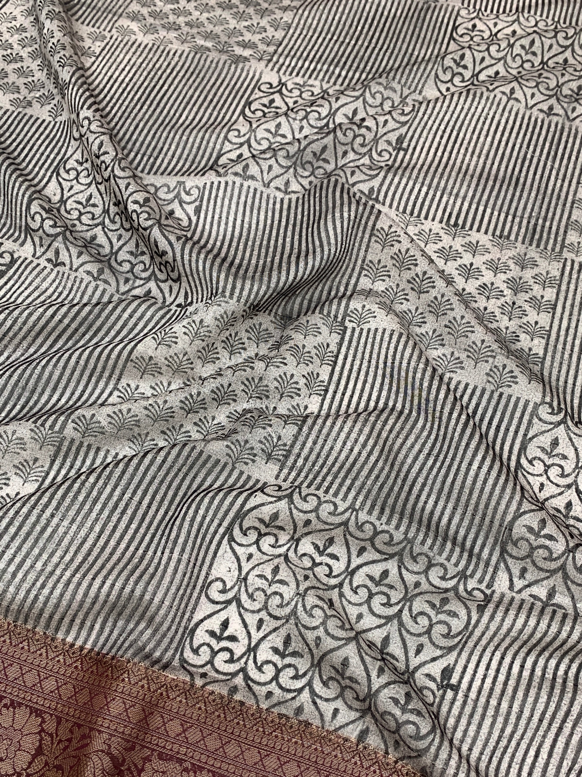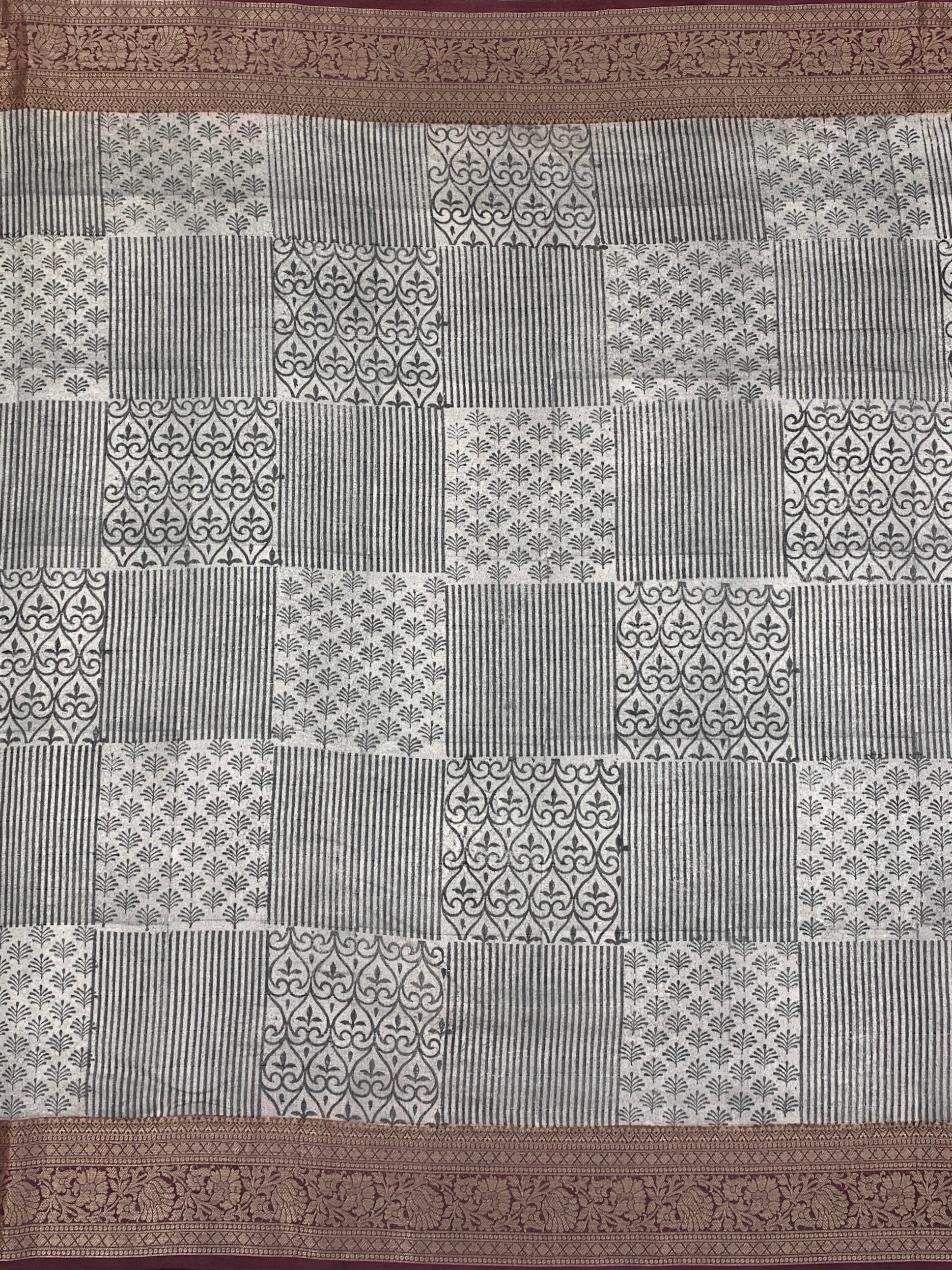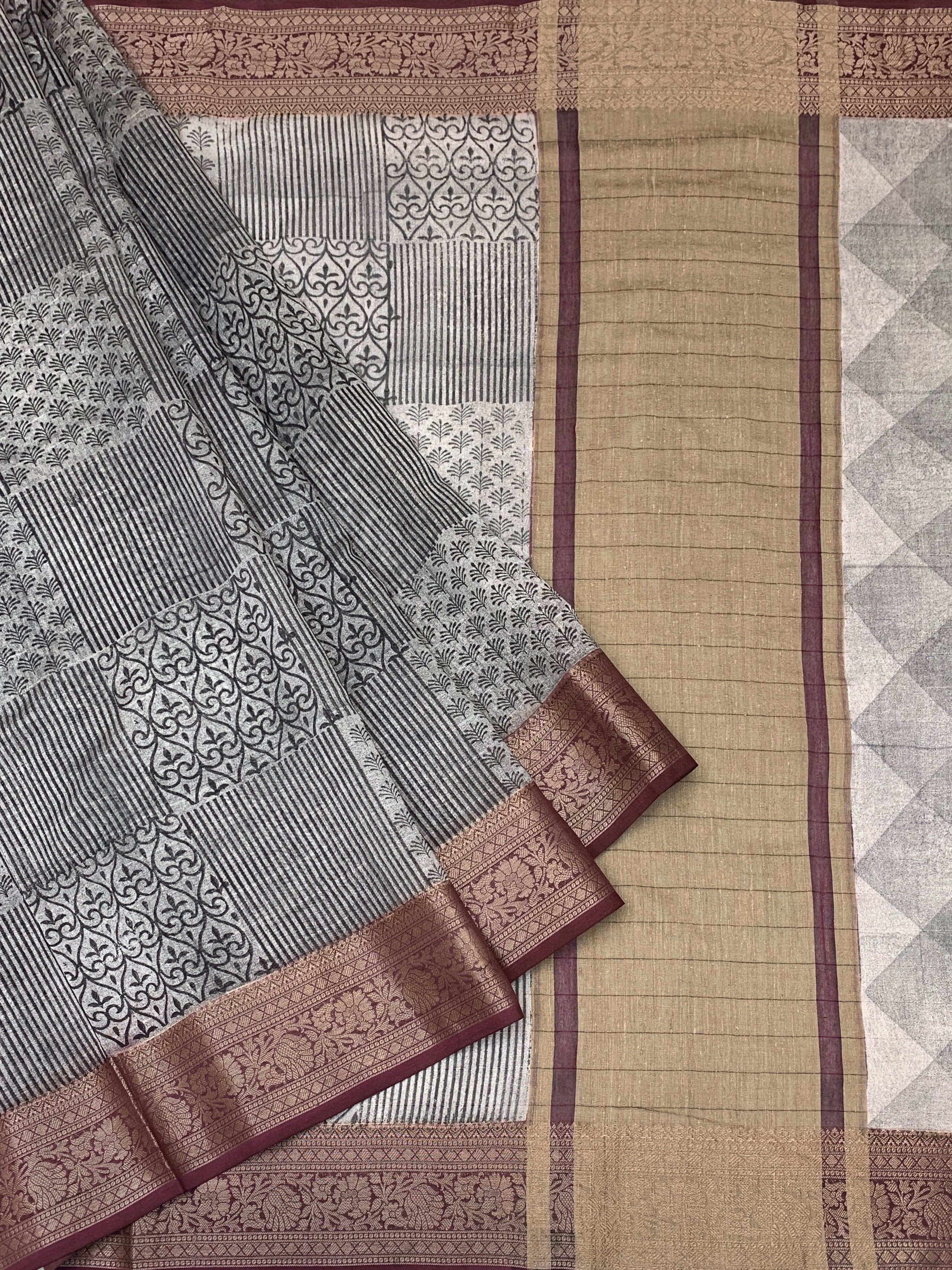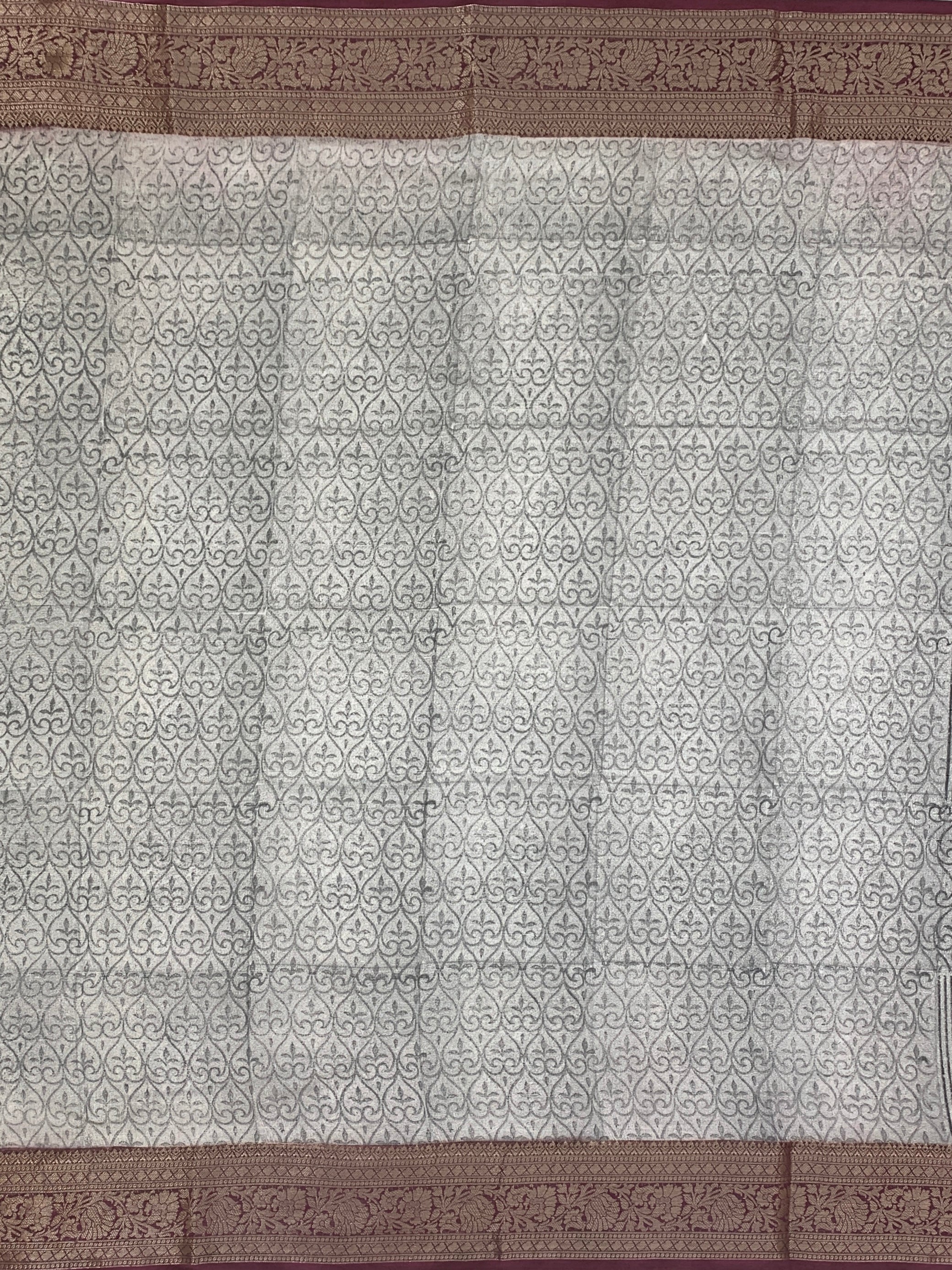 This Grey Maheshwari Cotton Saree blends geometric patterns with graceful floral motifs for an elegant appearance. Its contrasting antique thread floral zari border enhances the traditional charm, Paired with a self-floral blouse featuring matching borders.