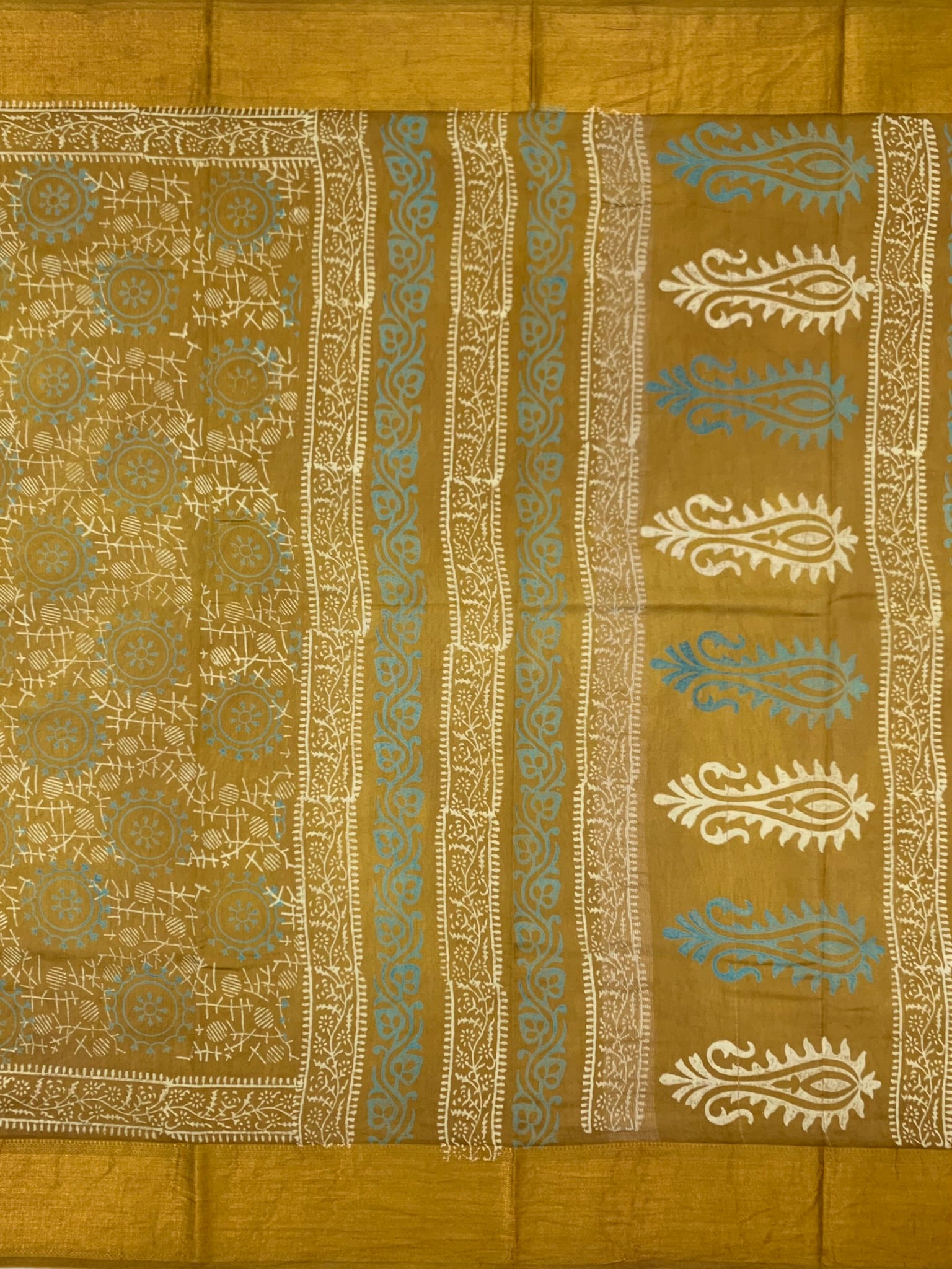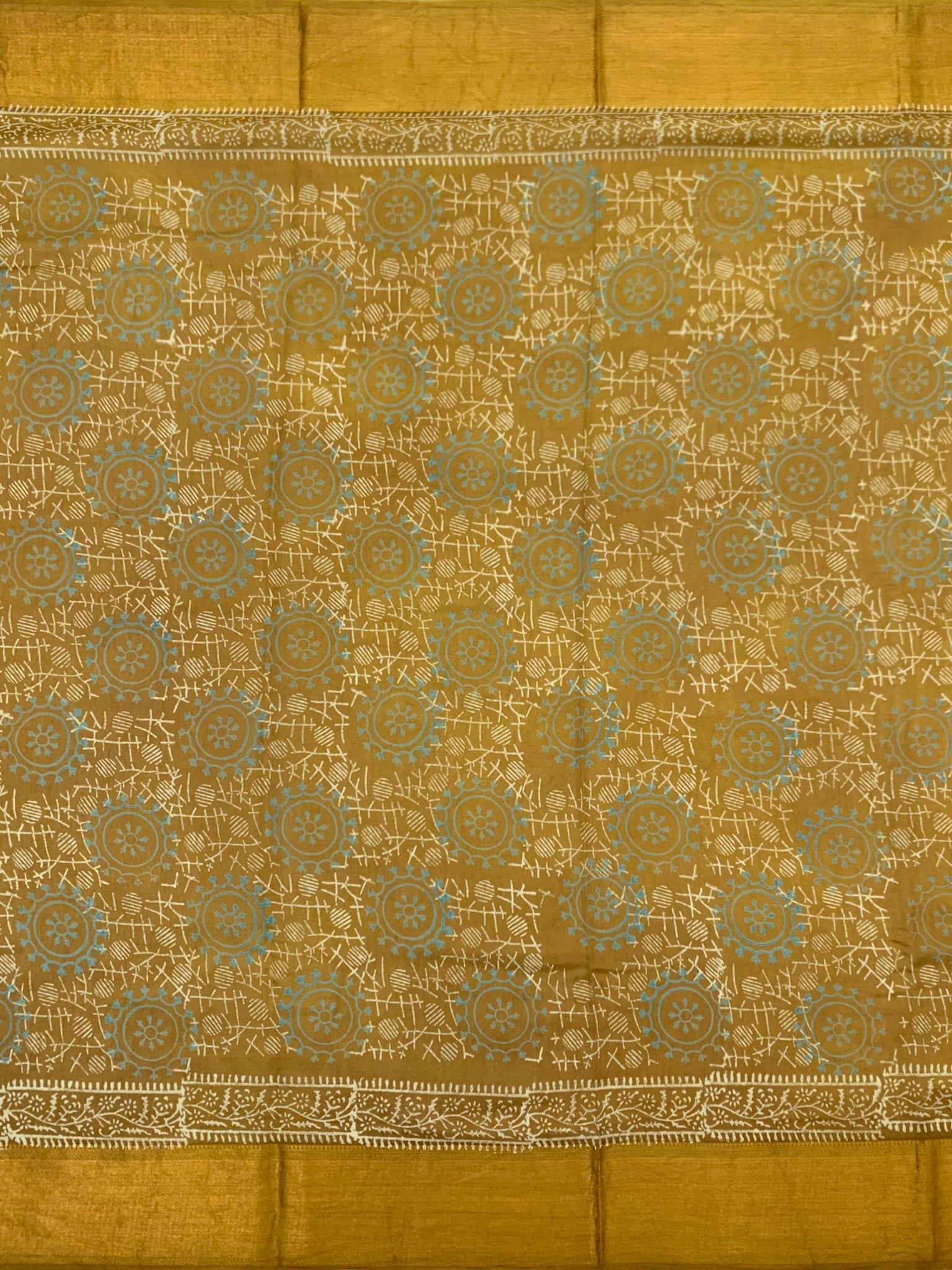 The Maheshwari Cotton Saree in Mustard showcases a captivating digital block print, paired with a delicate gold zari border and floral pallu. The accompanying blouse also exhibits a matching self design and border, elevating its elegance and charm.