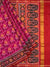 Patola saree features an intricate check pattern and delicate floral buttis throughout. It also boasts a contrasting floral border and pallu in a beautiful rani-pink color. The accompanying blouse is plain with a matching border for a cohesive look.