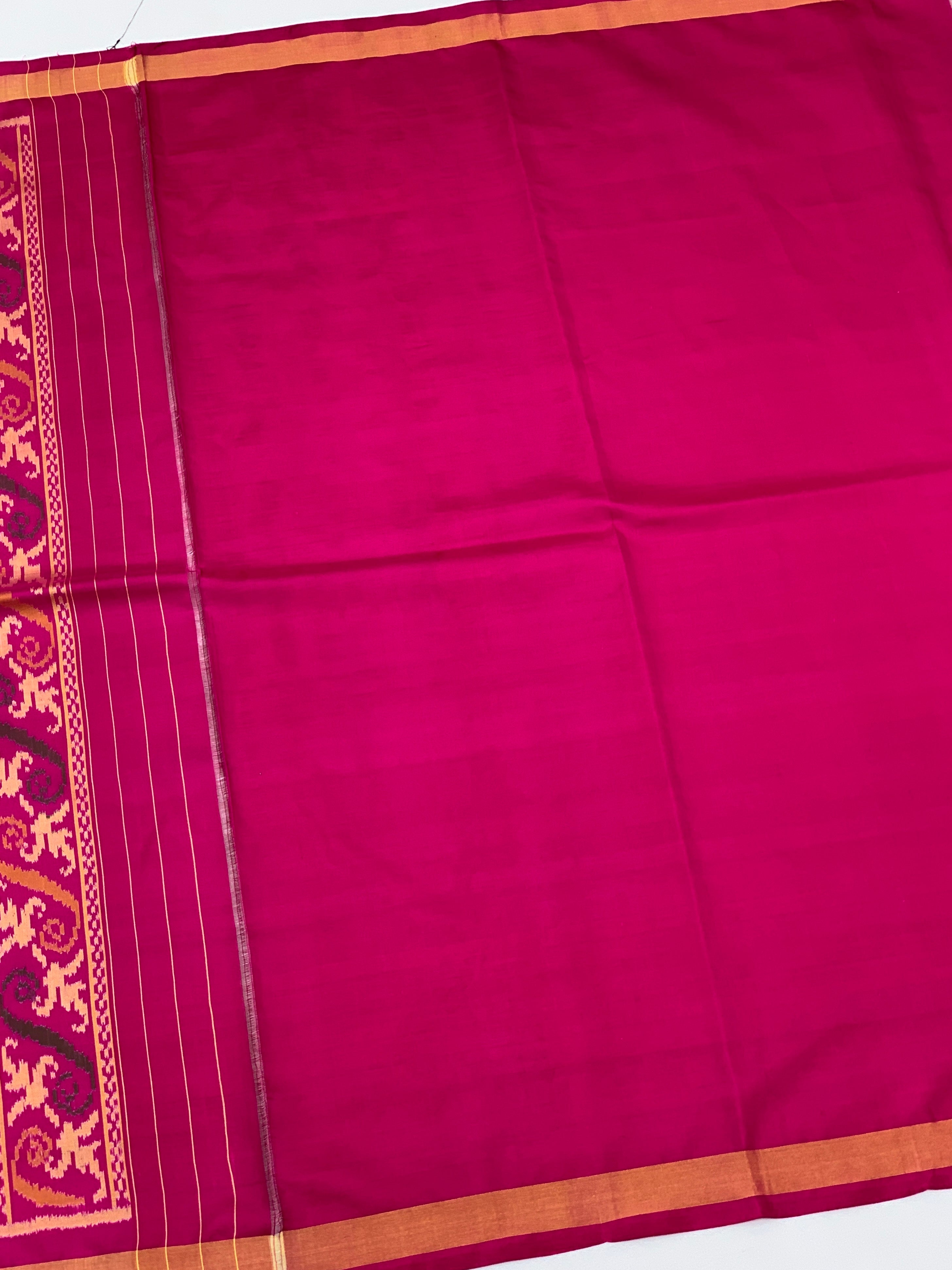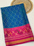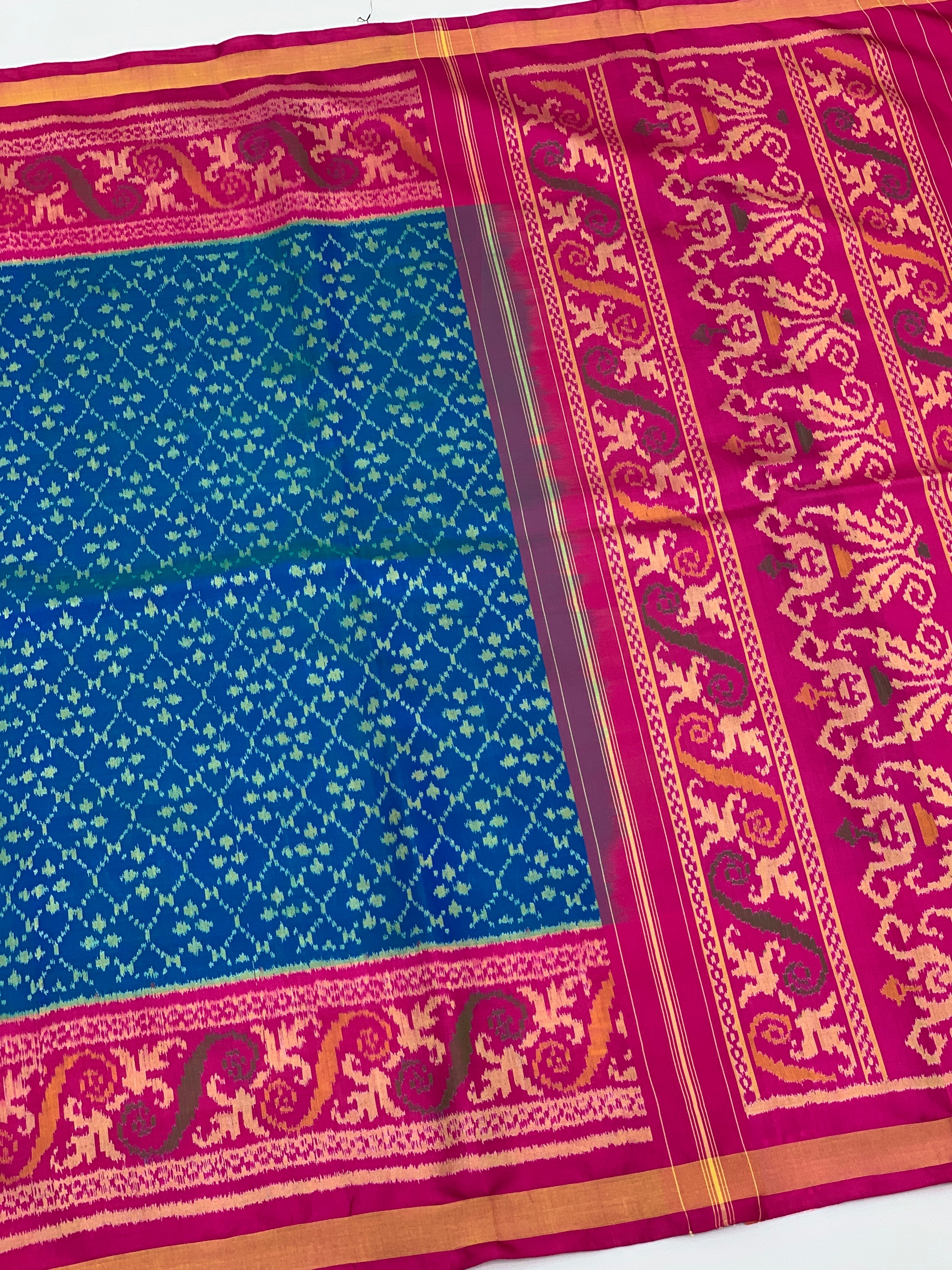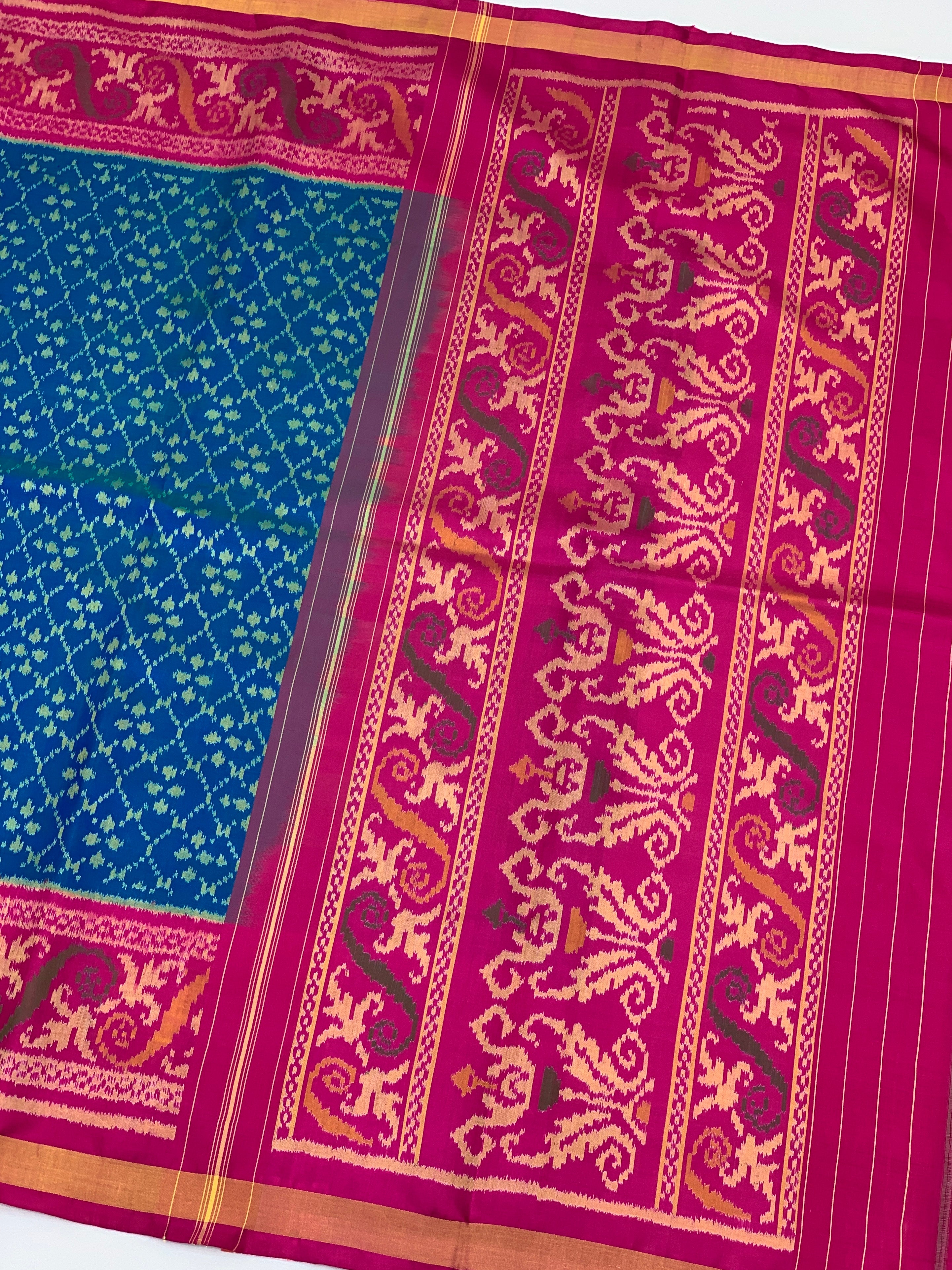Step into elegance with this vibrant blue Rajkot Patola saree. Scattered with geometric green Ikat buttas, the cool body contrasts beautifully with a rich pink pallu featuring intricate orange, green, and brown floral scrollwork. Framed by a golden zari border and paired with a plain pink blouse.