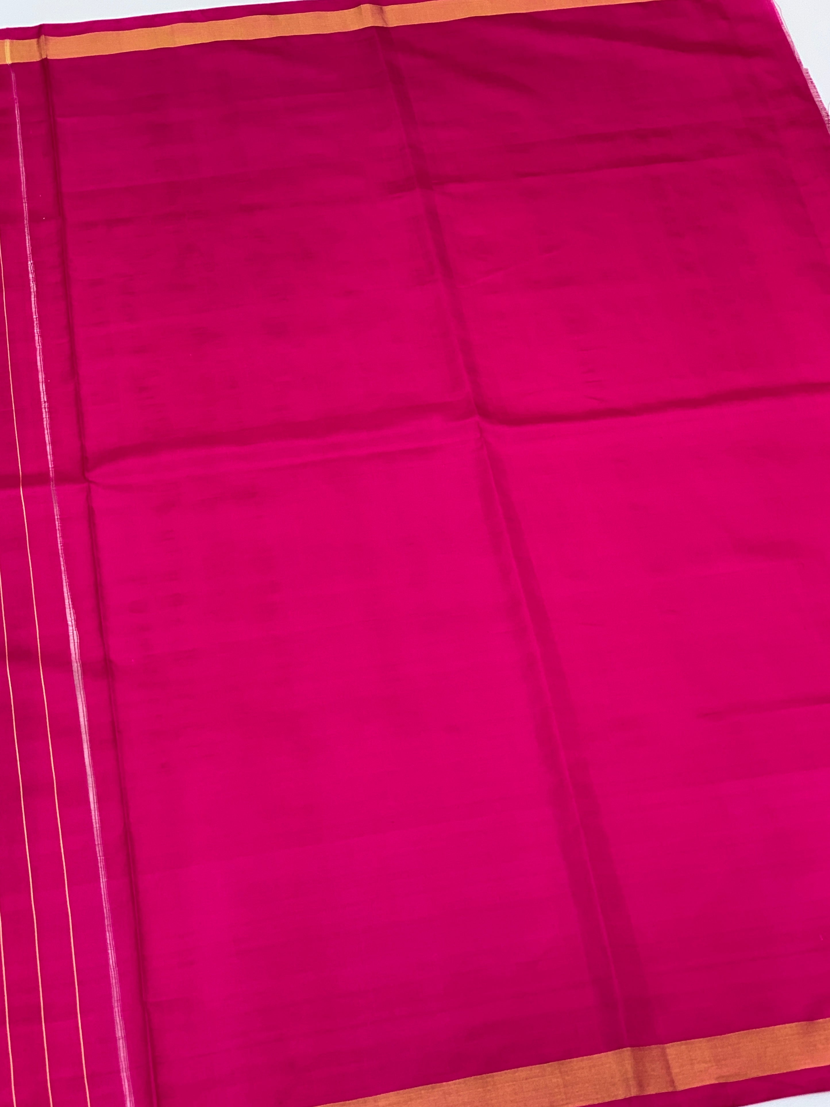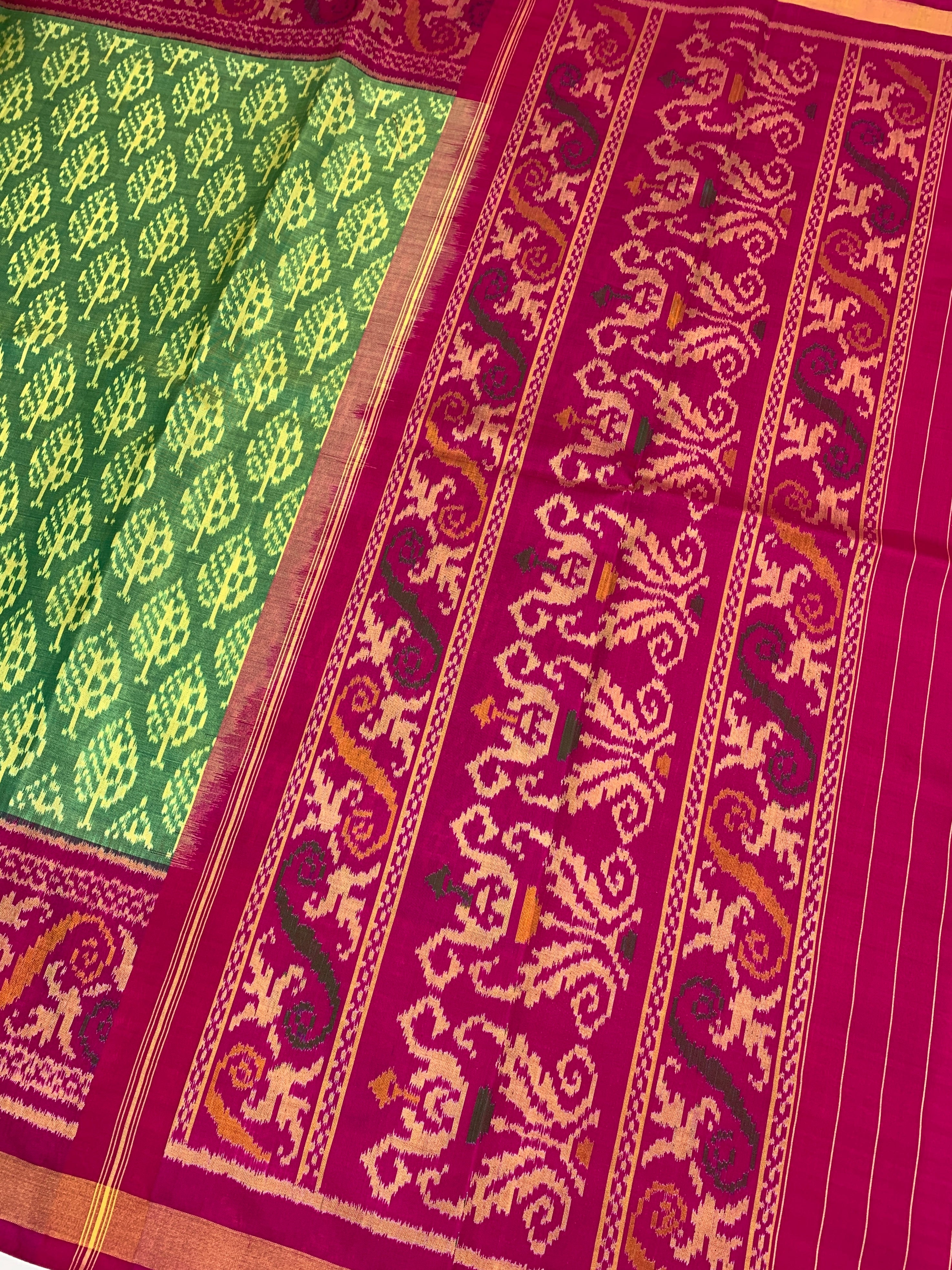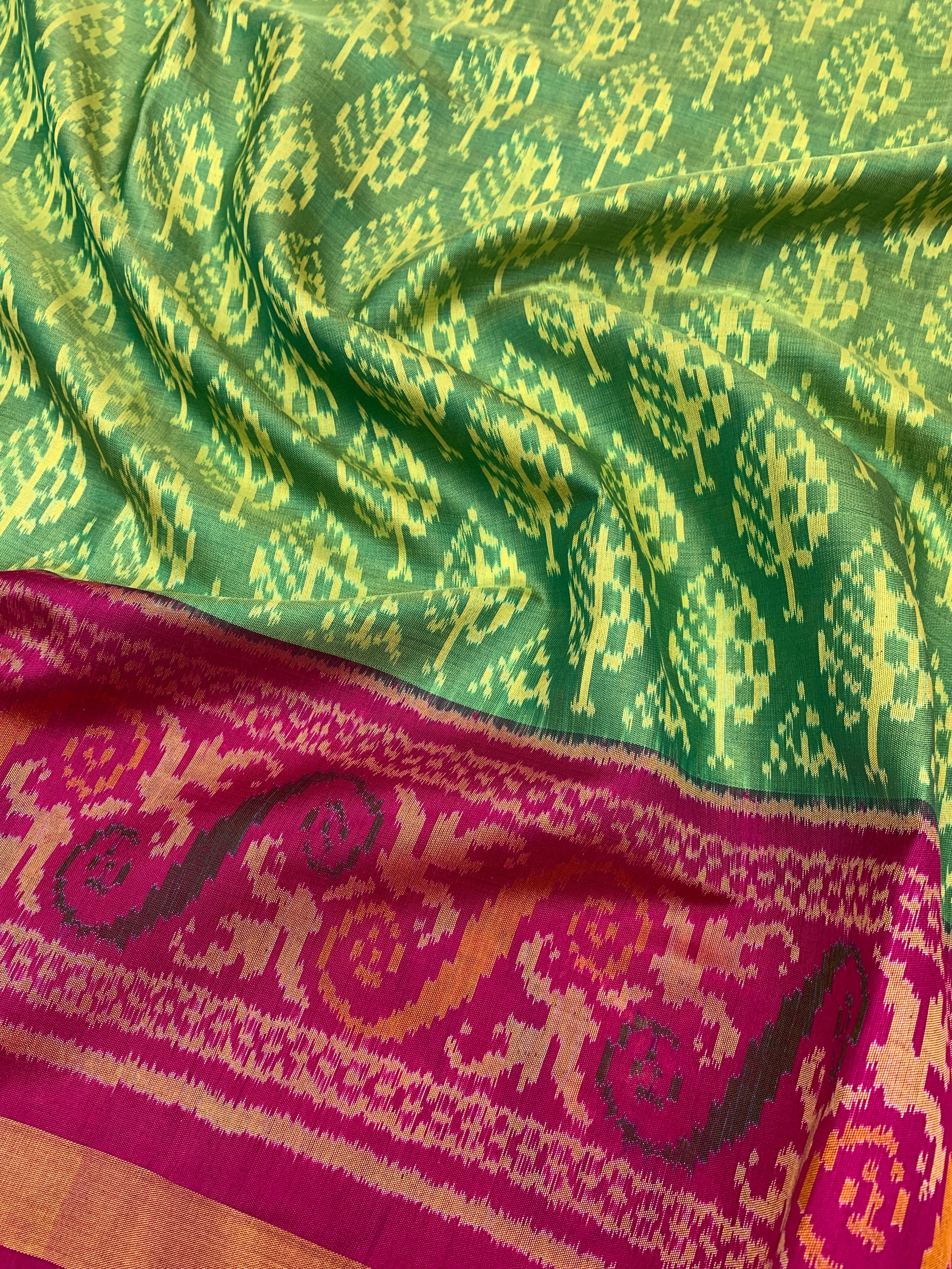 This exquisite rajkot patola saree. The body of the saree features a vibrant green hue, This is contrasted by a rich, majestic pink pallu featuring elaborate horizontal bands of geometric florals and traditional heritage motifs, showcasing the weaver's skill. The saree is accompanied by a plain pink blouse piece with elegant gold zari border.