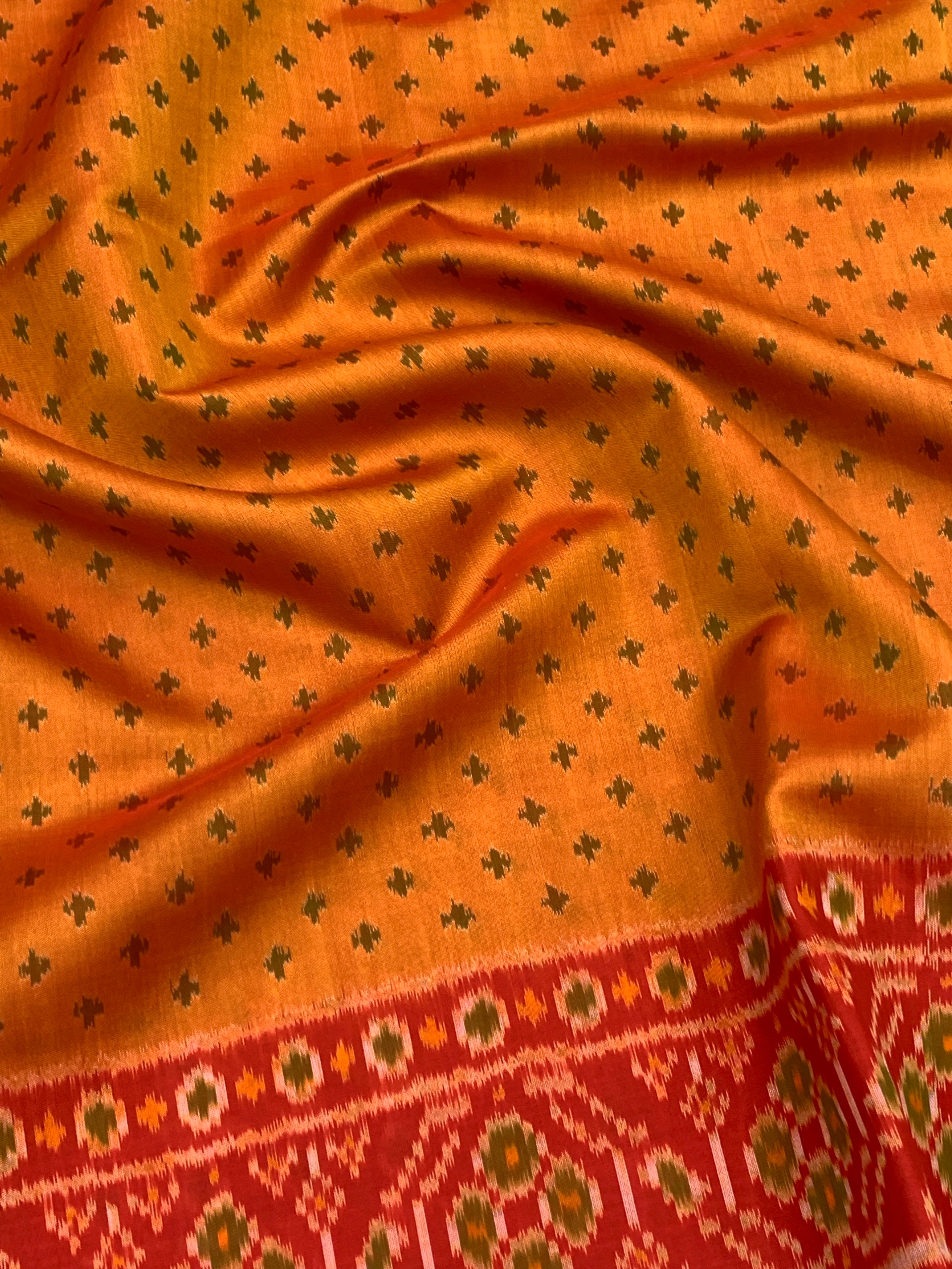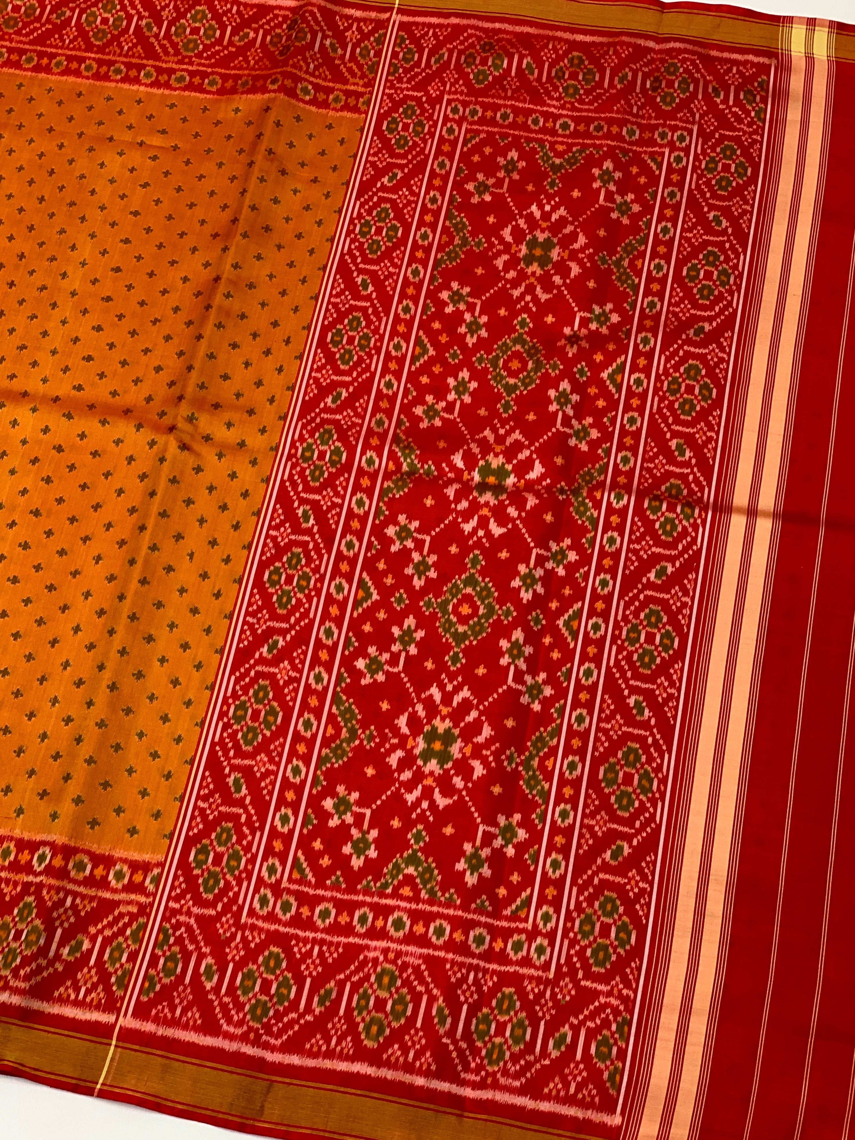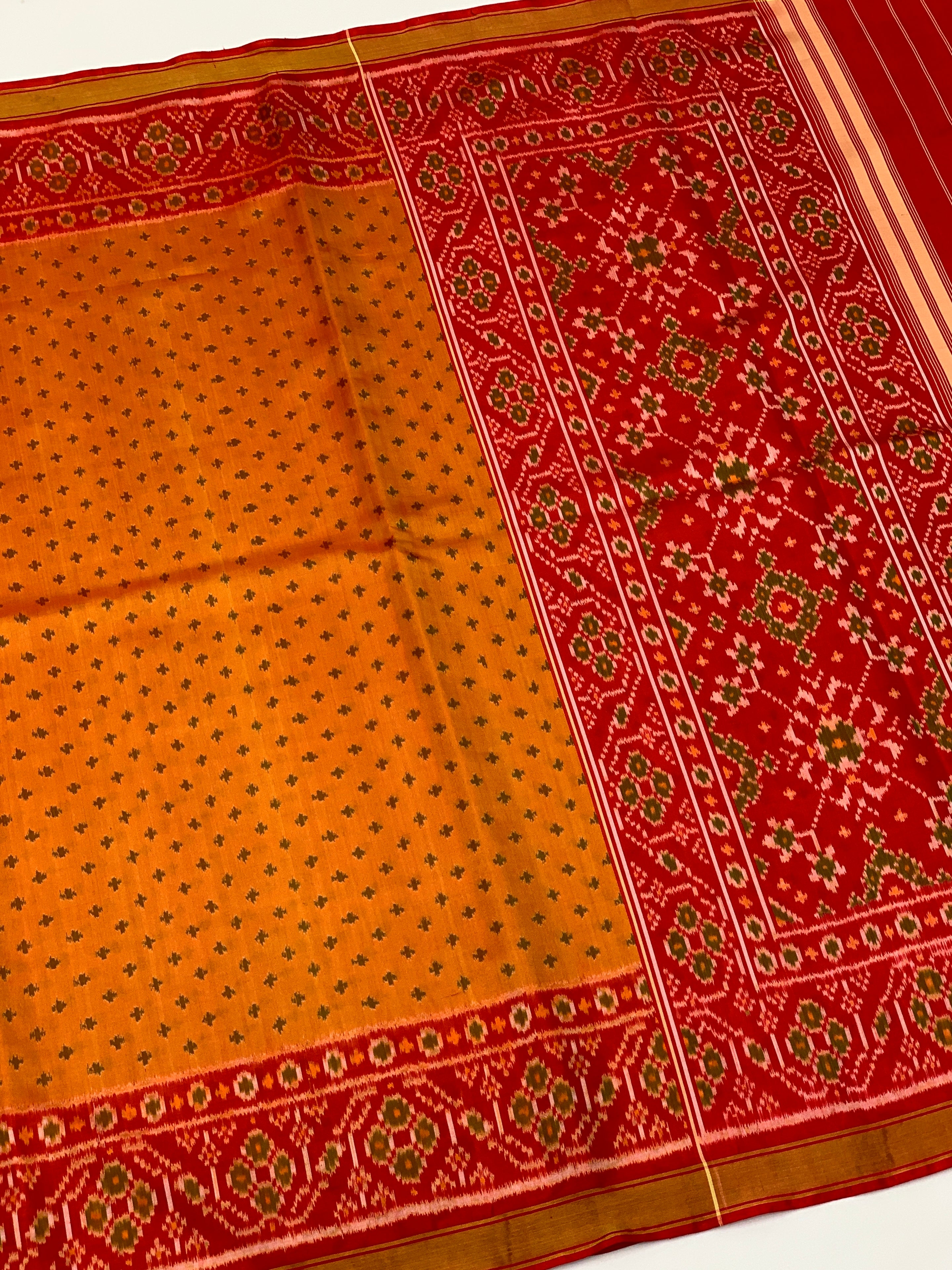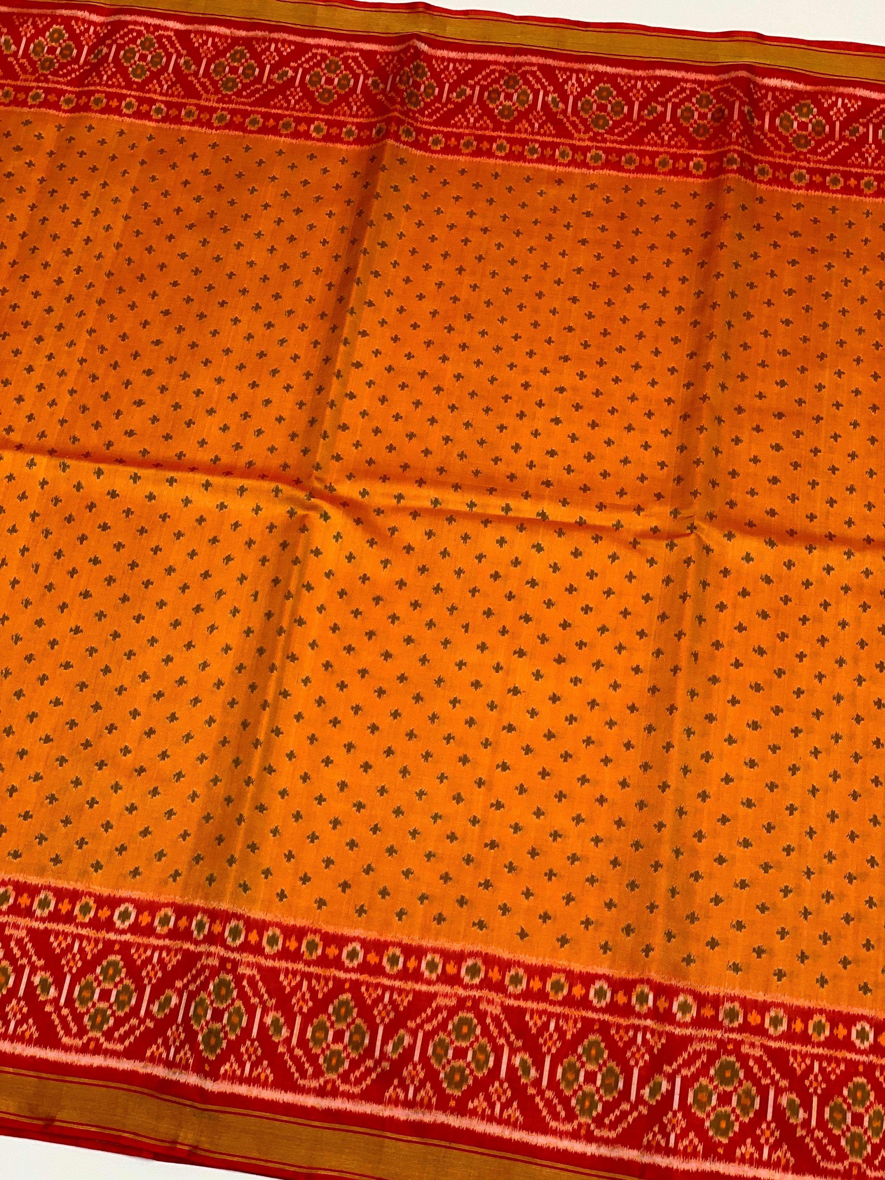 This stunning orange rajkot patola saree. Featuring classic Ikat buttis woven throughout the body, this saree is elevated by a gorgeous contrast floral border and pallu. It comes perfectly paired with a plain contrast blouse with a border for a polished, sophisticated look.