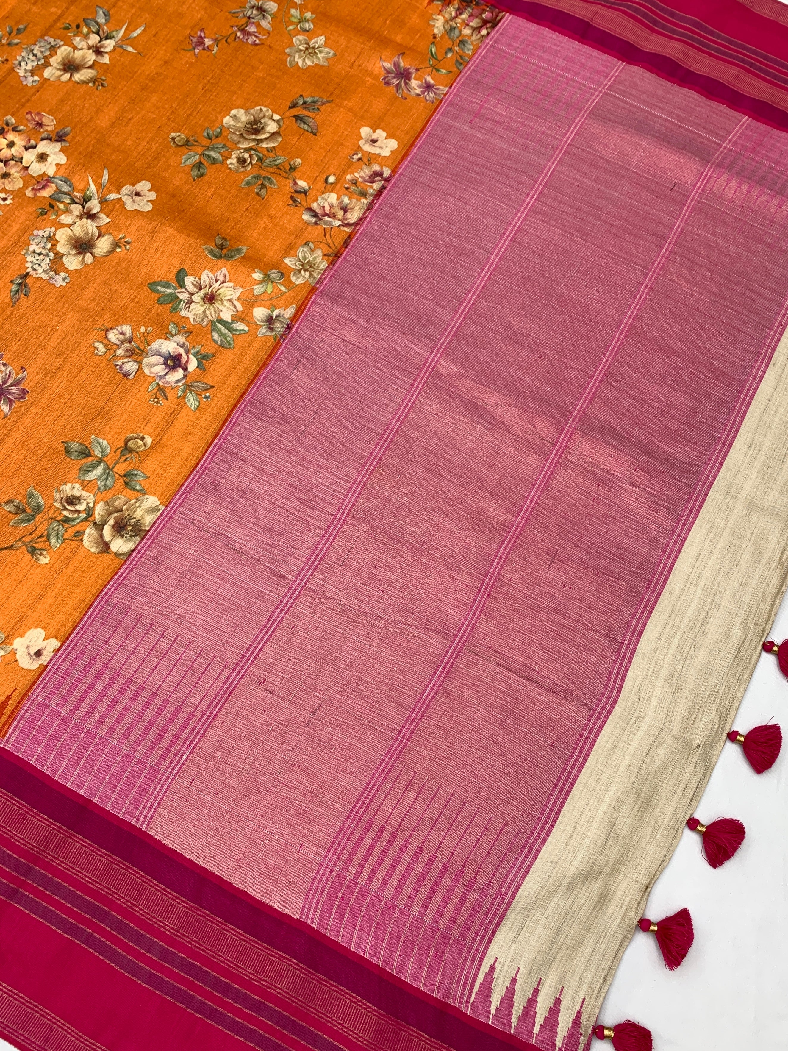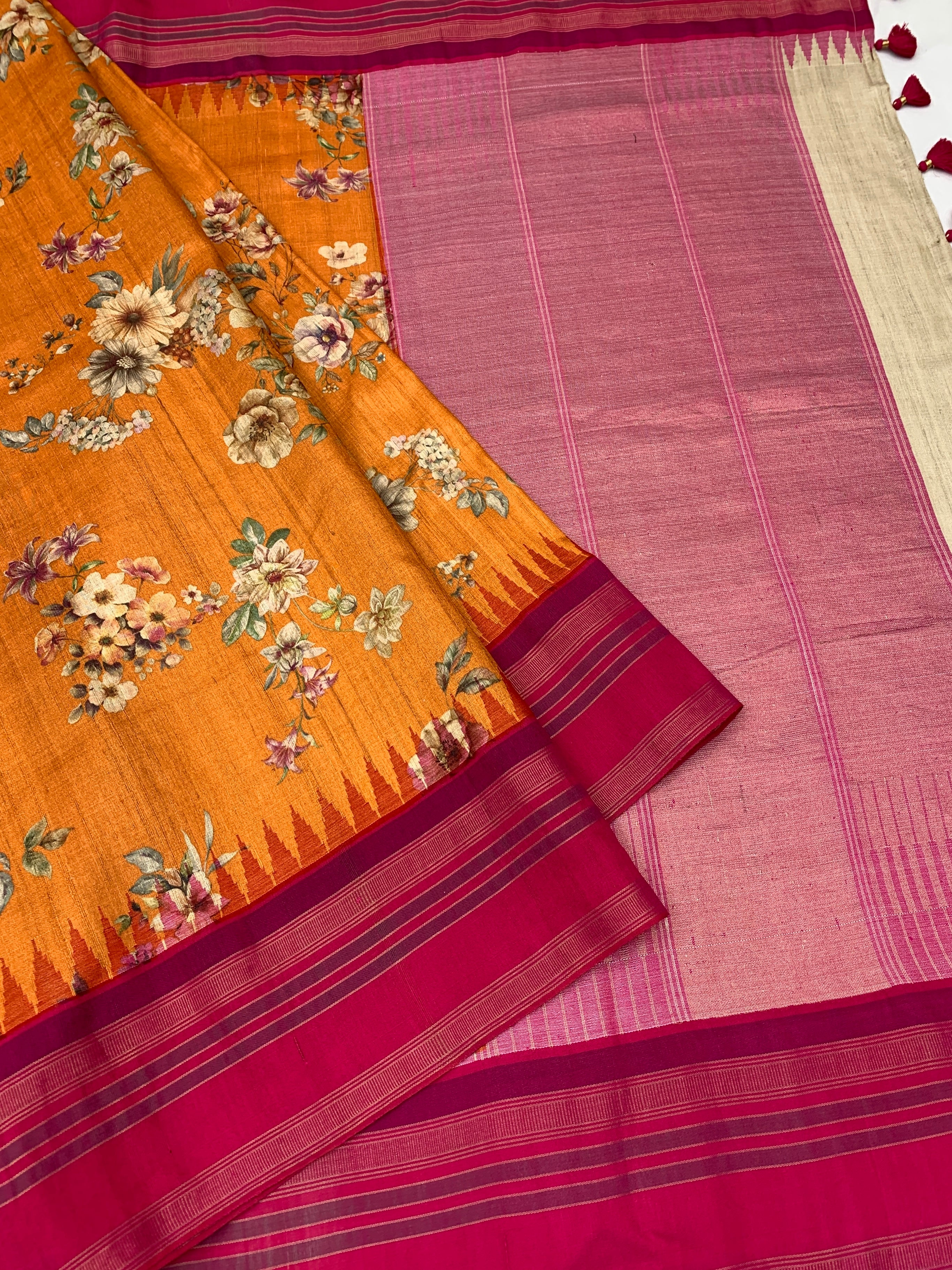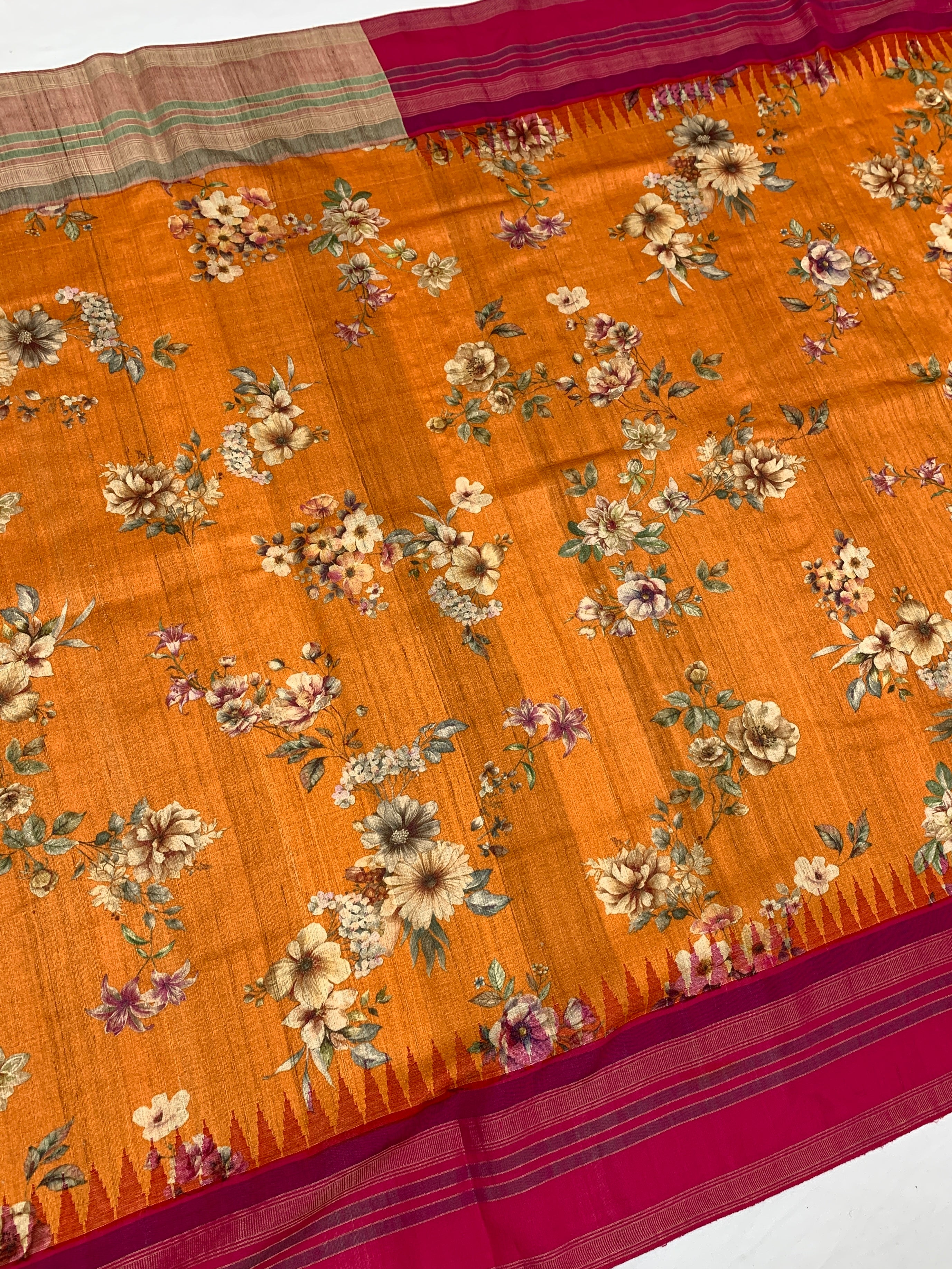 This elegant orange tussore saree showcases a beautiful multi-coloured digital floral print, complemented by a traditional temple border that adds a timeless charm. The plain zari pallu enhances its sophisticated look, while the matching blouse with plain fabric and border completes the ensemble perfectly, making it ideal for special occasions and festive wear.