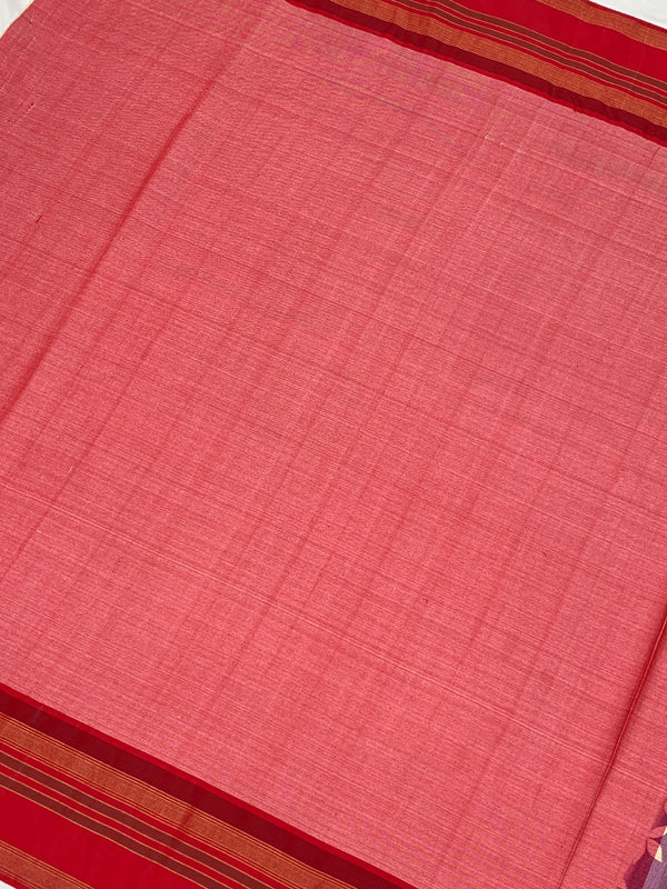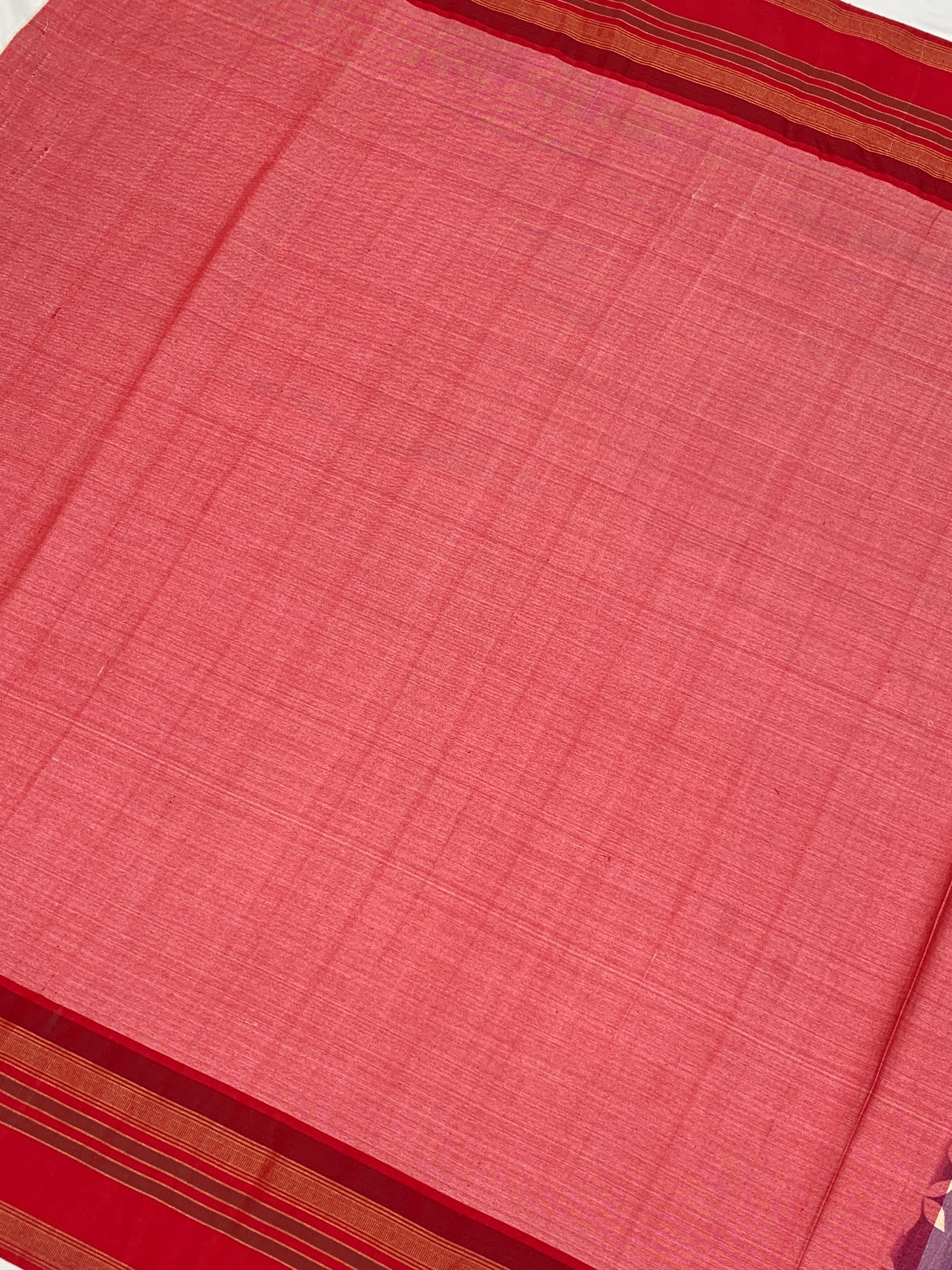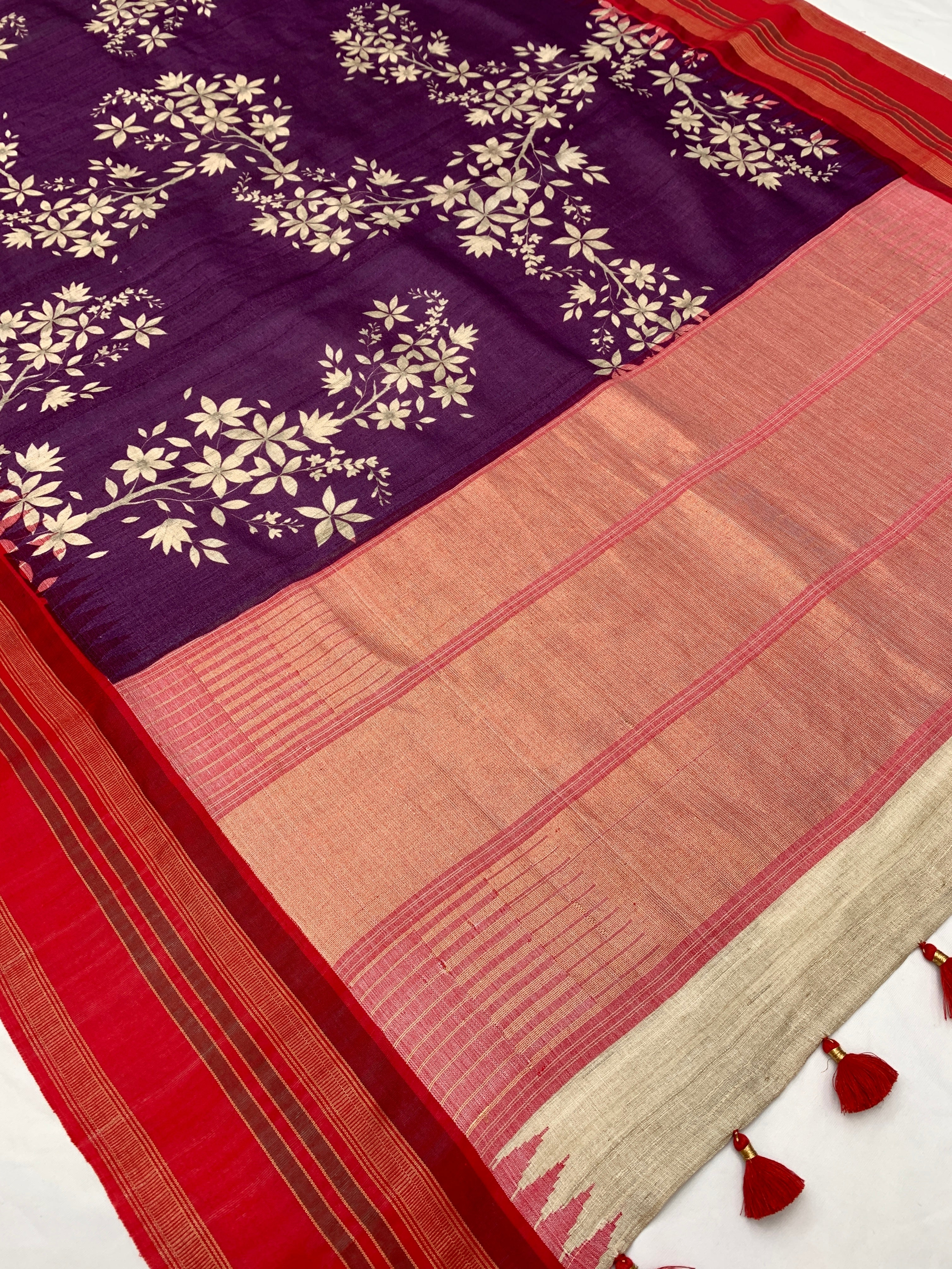This elegant purple tussore saree showcases a vibrant digital floral print that adds a refreshing touch to classic wear. The traditional temple red border offers enduring elegance, complemented by a plain zari pallu for a refined finish. It comes with a coordinated plain blouse featuring matching borders.