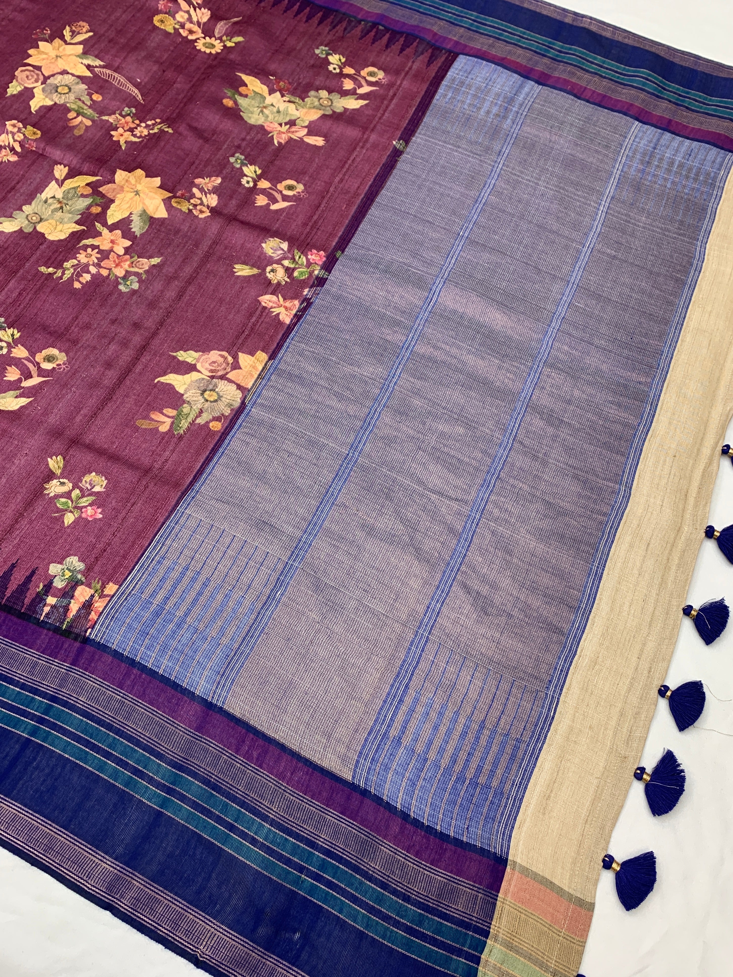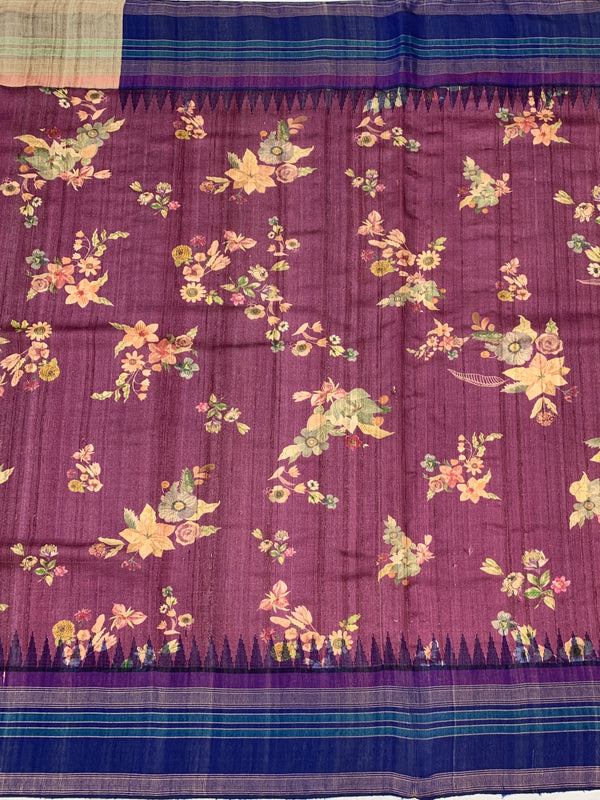This Wine tussore saree offers a perfect blend of tradition and modern style. Its vibrant digital multi-colored floral print adds lively charm, while the classic temple border enriches the overall look. The plain zari pallu provides a subtle, elegant finish. Complemented by a contrasting plain blouse with a matching border, this saree creates a graceful and refined ensemble for any occasion.