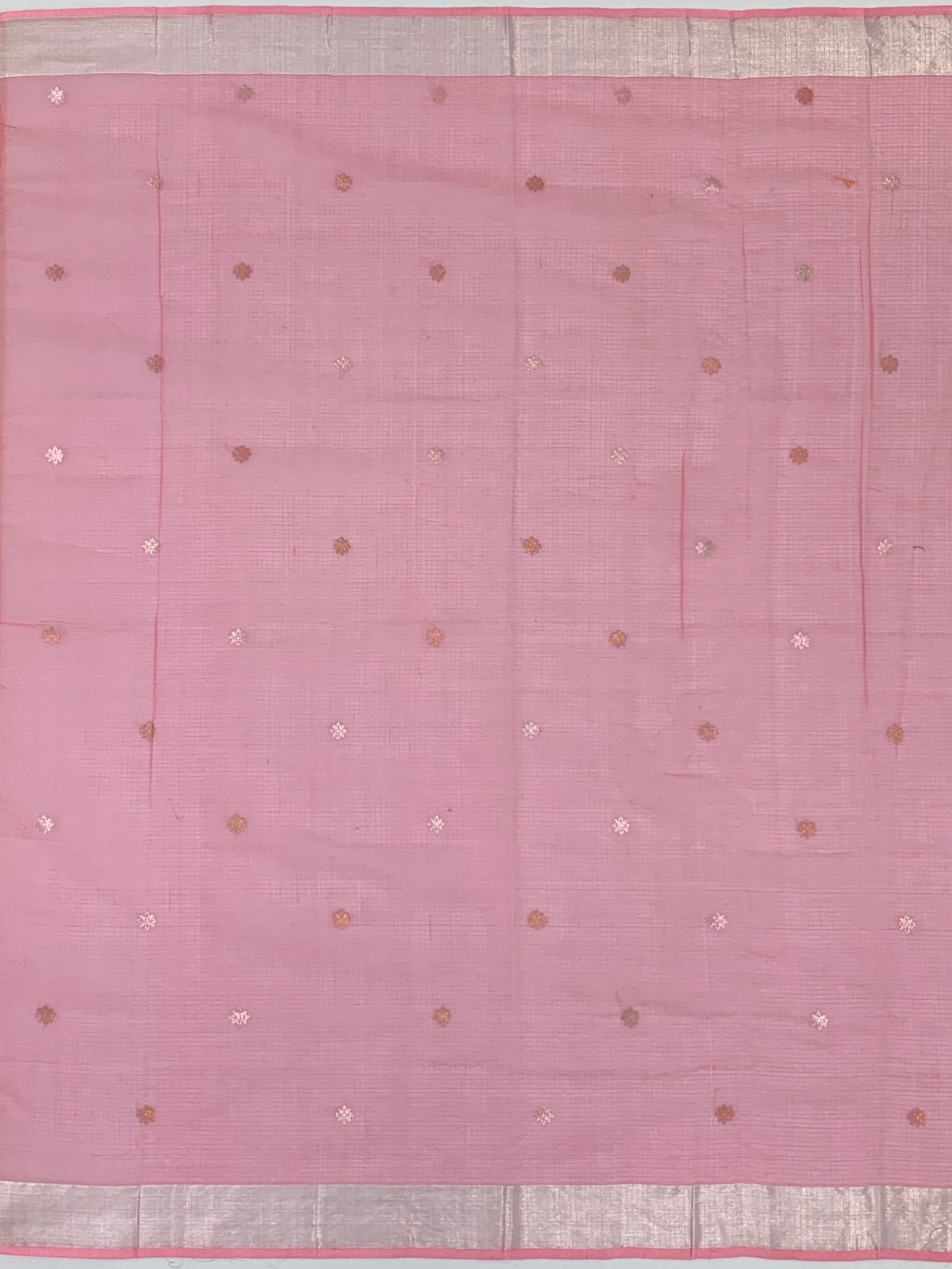 Orange zari kota saree, featuring intricate silver zari weaving and delicate meenakari floral buttis throughout. The saree showcases a self kaddi border adorned with graceful floral and bird motifs on the pallu, The coordinating blouse piece displays contrasting floral buttis with a decorative border, completing this sophisticated ensemble. Perfect for festive occasions.