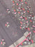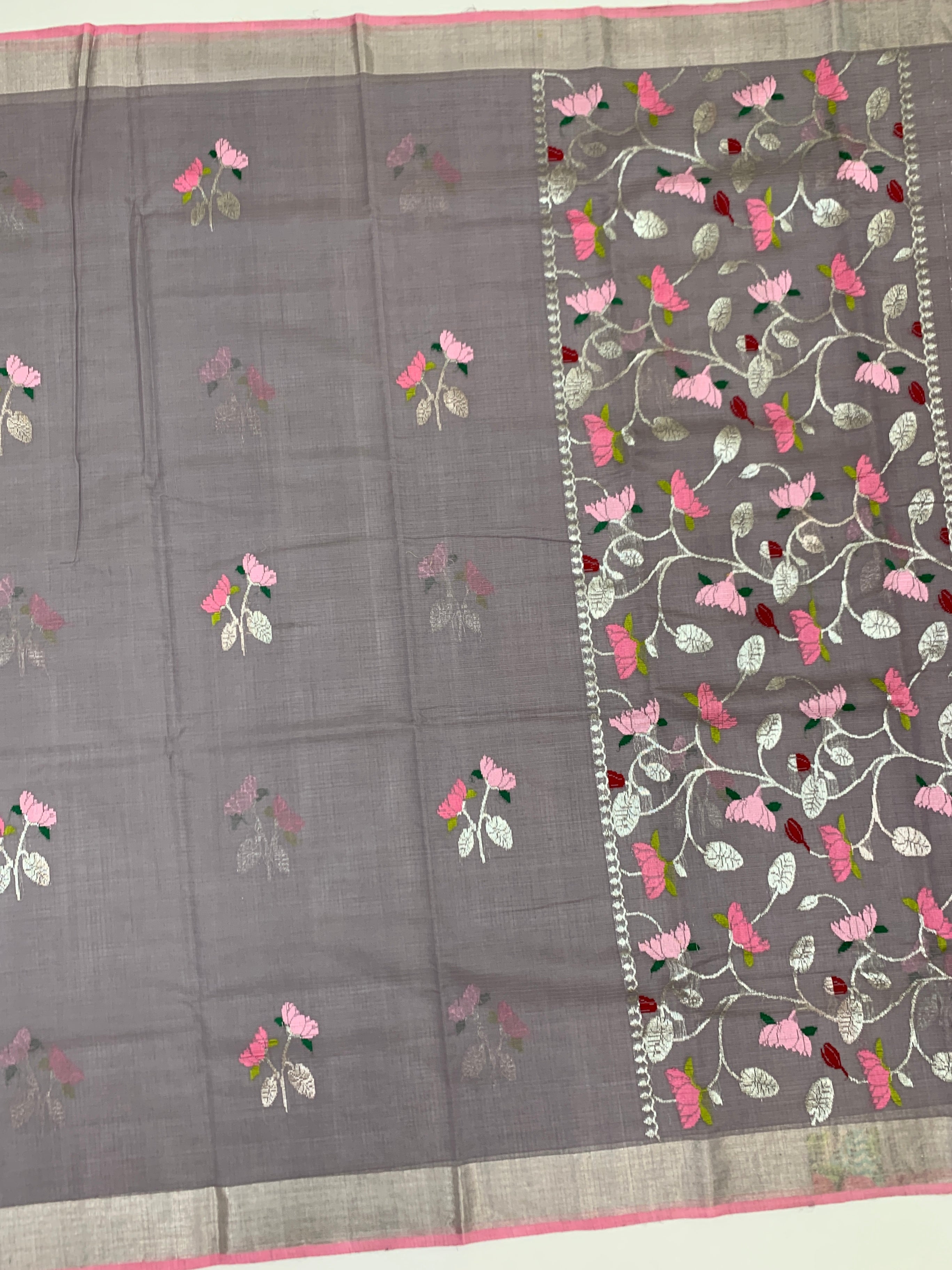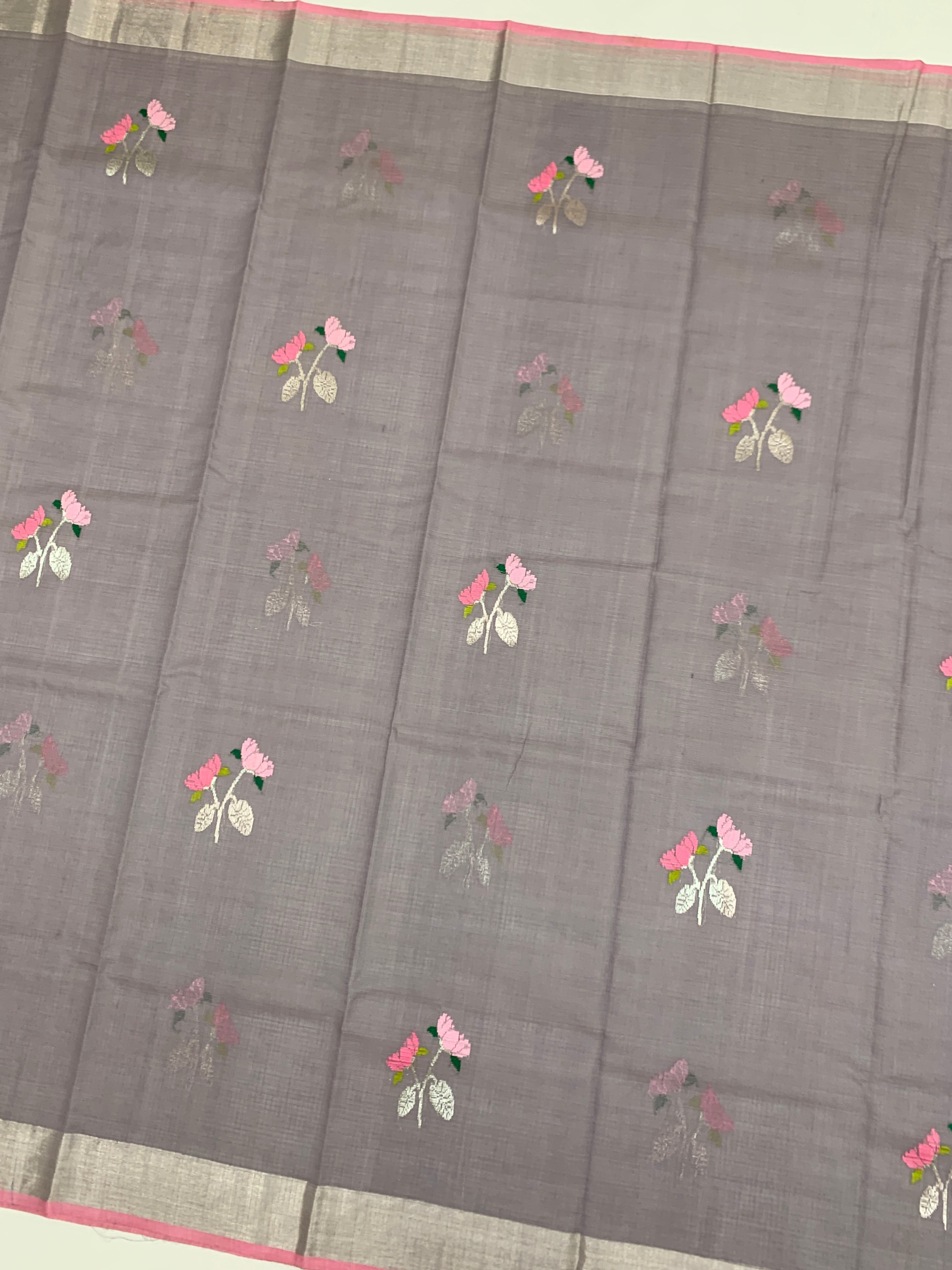 Exquisite lilac zari kota saree showcases lustrous silver zari weaving paired with graceful meenakari floral buttis. The self-kaddi border and embellished floral pallu add timeless elegance, while the matching blouse features contrasting floral buttis and decorative border for a polished, coordinated look.