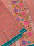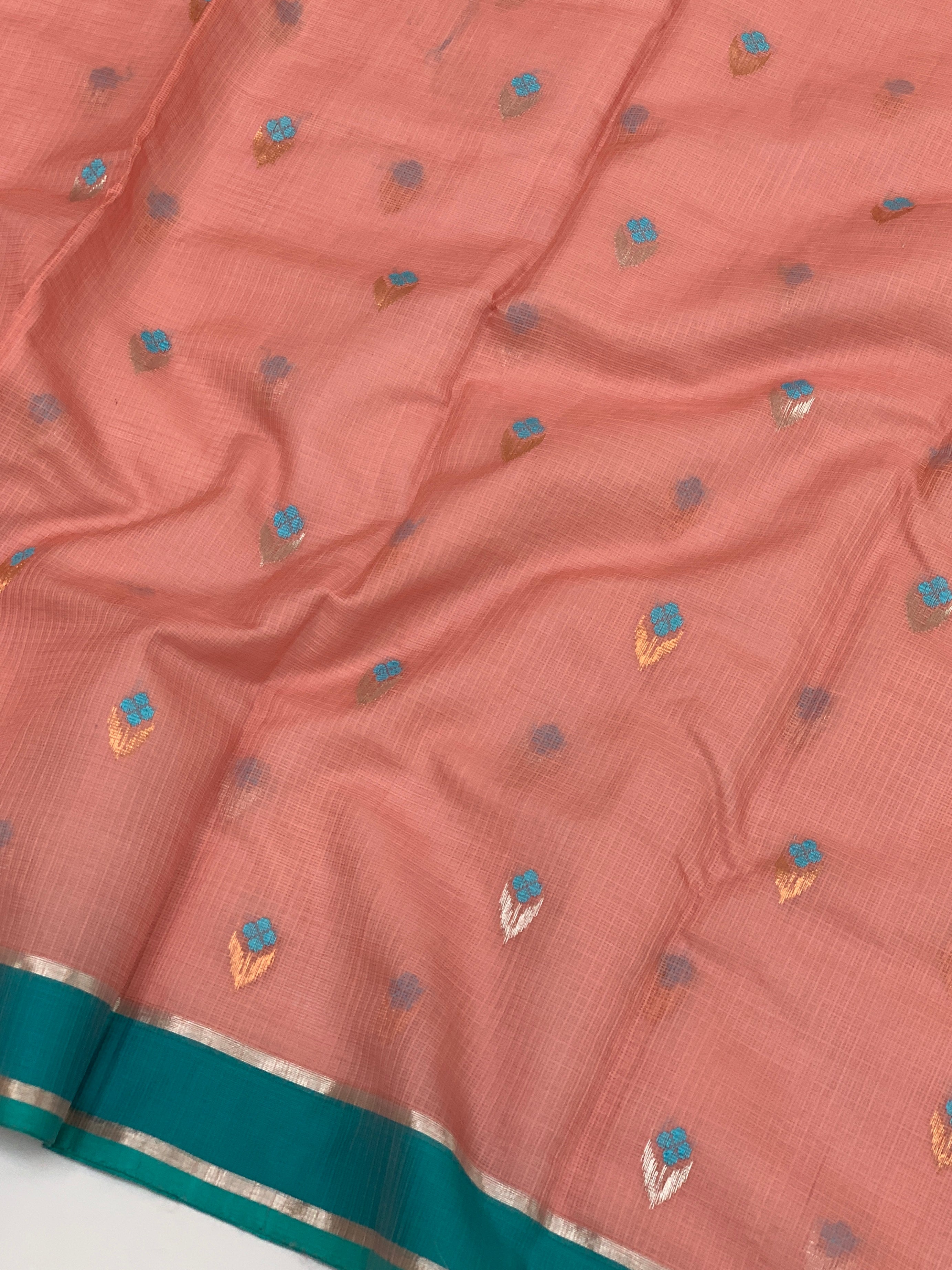 Discover the charm of this peach zari kota saree, adorned with all-over gold and silver zari weaving complemented by delicate floral buttis. The striking contrast plain border pairs perfectly with the self floral pallu. Complete the look with the coordinating blouse featuring matching floral buttis and border accents.